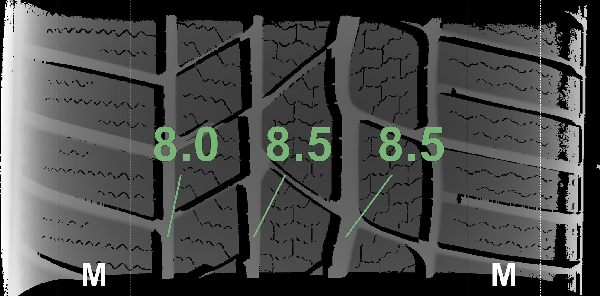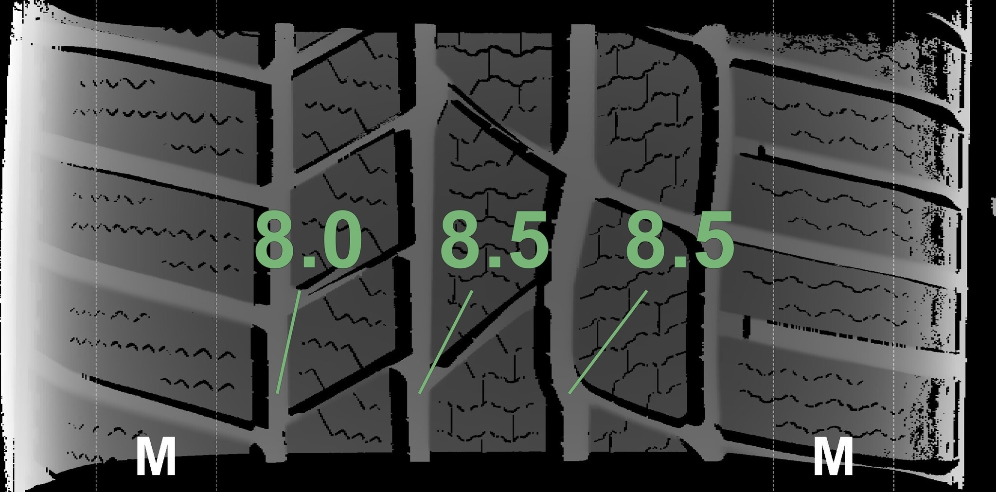 Die gemessenen Profiltiefen und die Details der Felgen sind oben dargestellt.