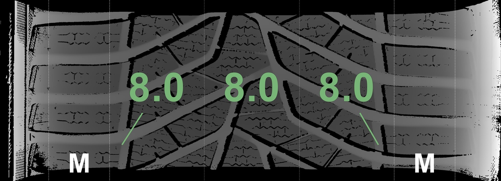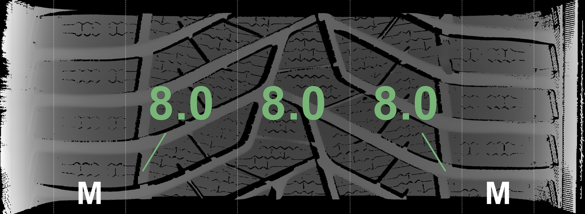 Zustand | Profiltiefe | DOT | Hinterachse Rechts | Neu | 8,0 mm | 3324 |