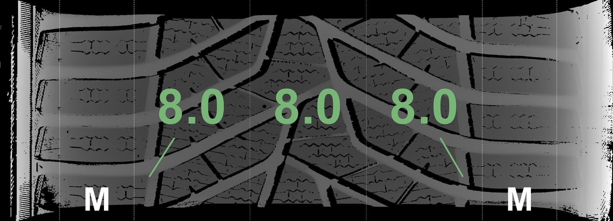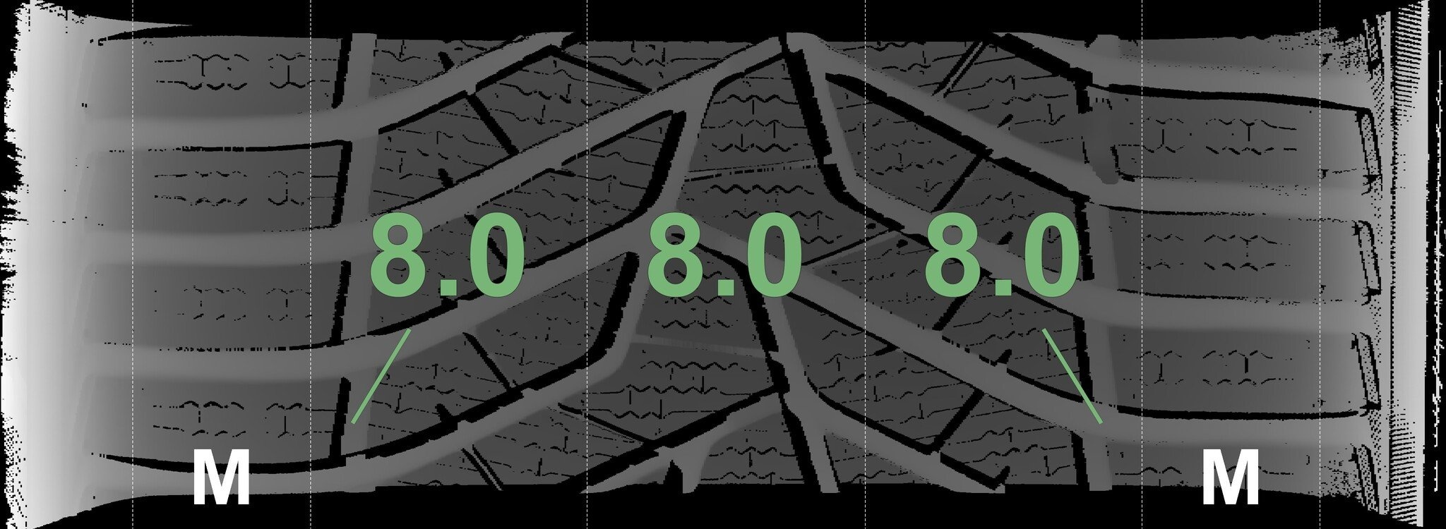 | Zustand | Profiltiefe | DOT | Hinterachse Links | Neu | 8,0 mm | 3324 |
