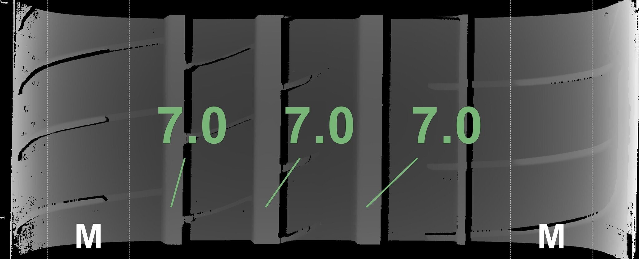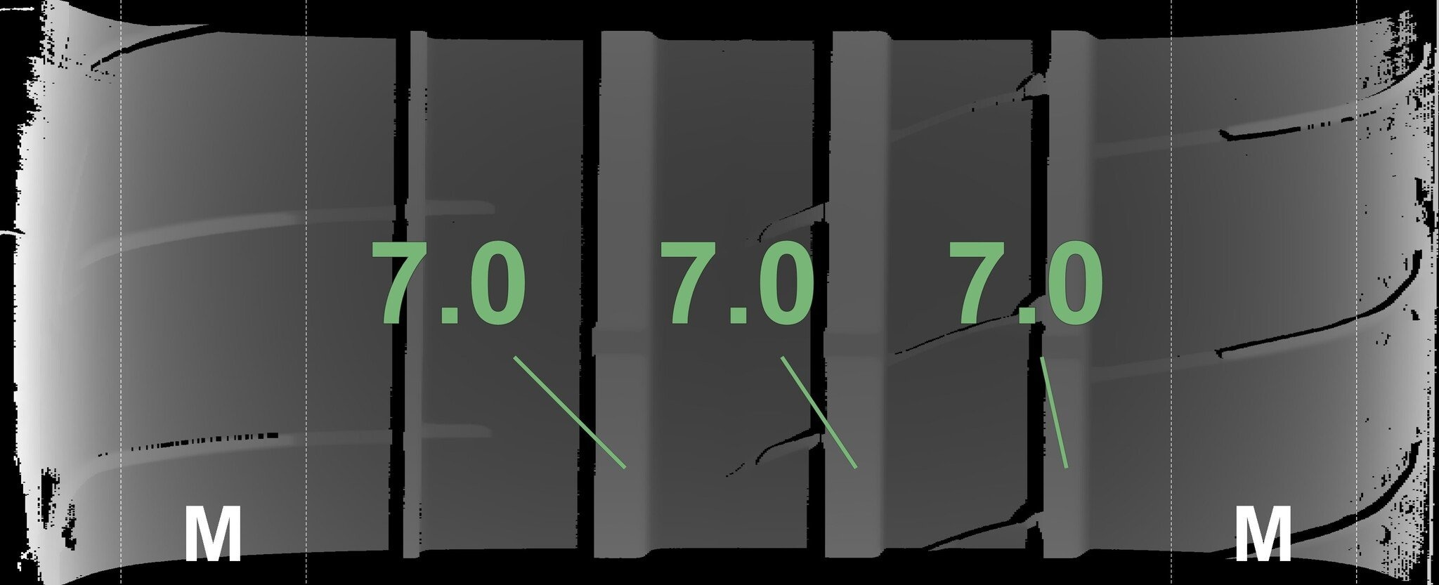 | Zustand | Profiltiefe | DOT | Vorderachse Links | Demo-Noppen noch sichtbar | 7.0 mm | 4821 |