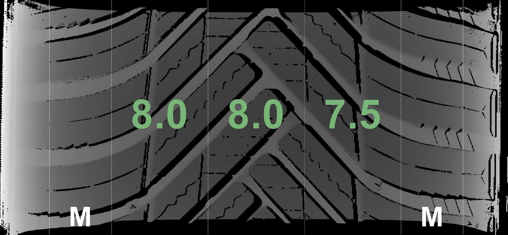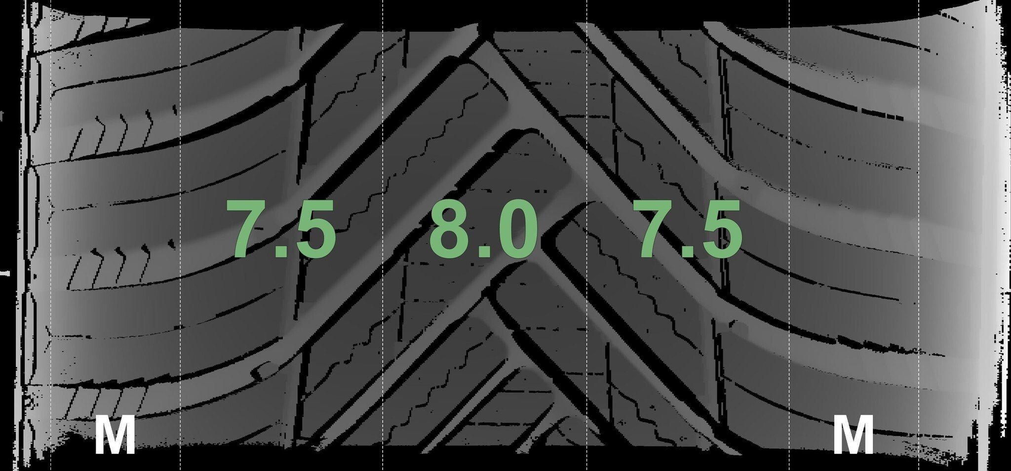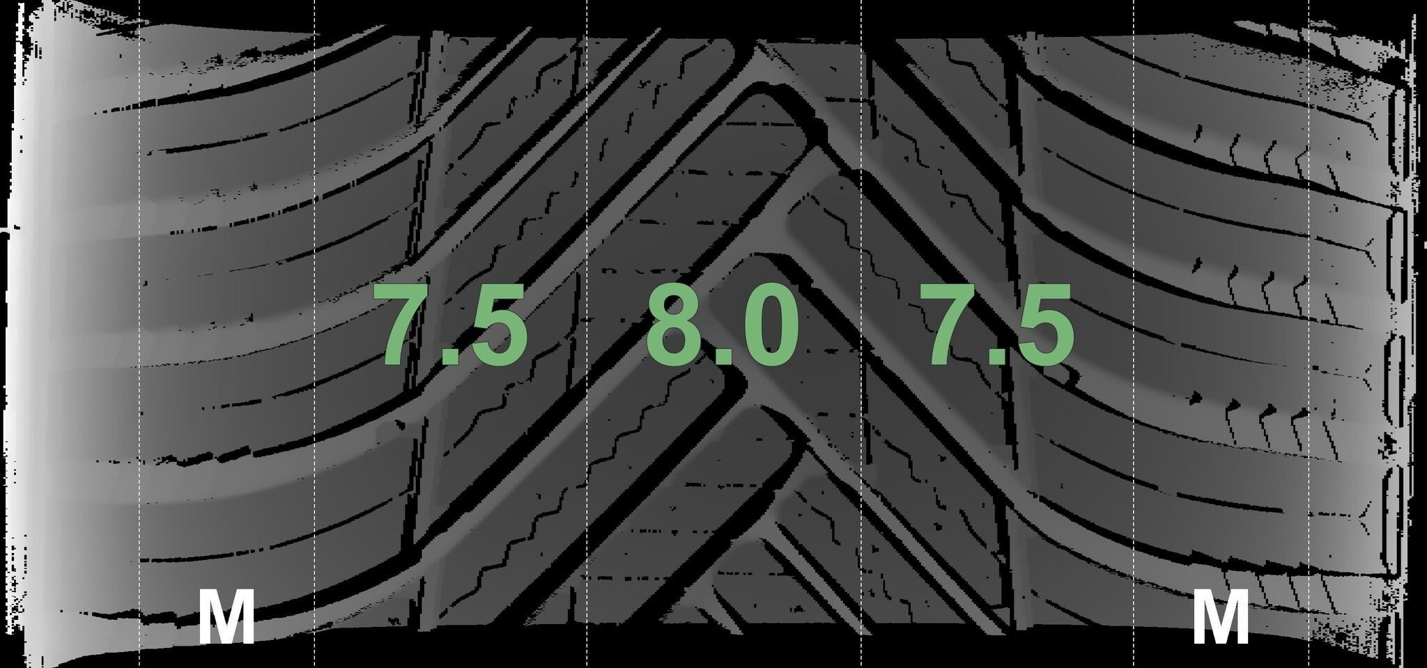 | Zustand | Profiltiefe | DOT | Vorderachse Rechts | Neu | 7.7 mm | 4225 |