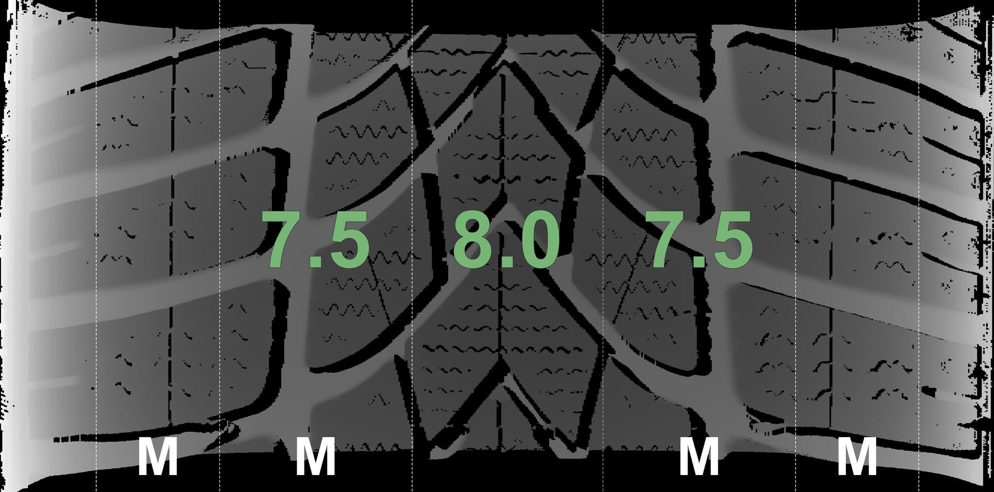 Die gemessenen Profiltiefen und die Details der Felgen sind oben dargestellt.