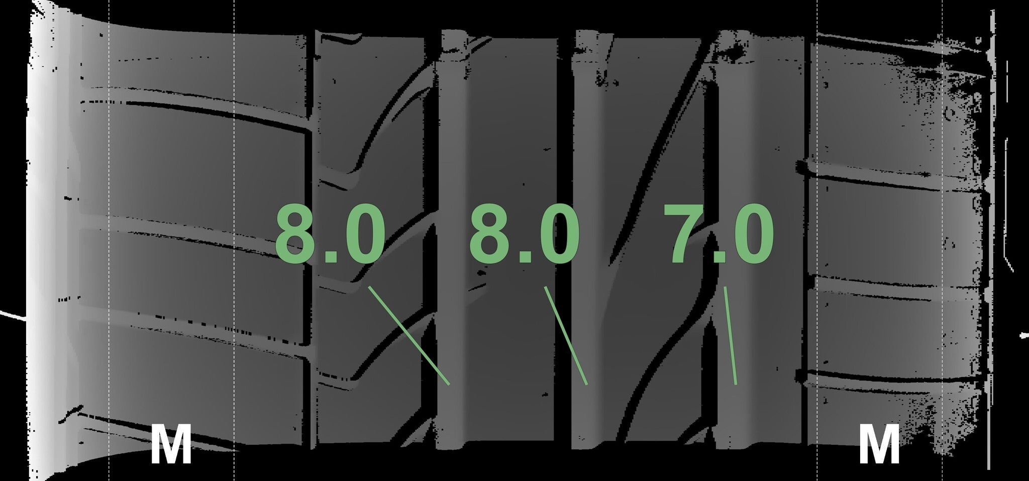 Die gemessenen Profiltiefen und Details der Felgen sind oben dargestellt.