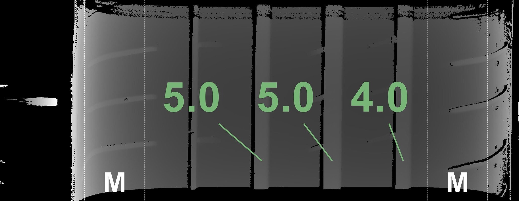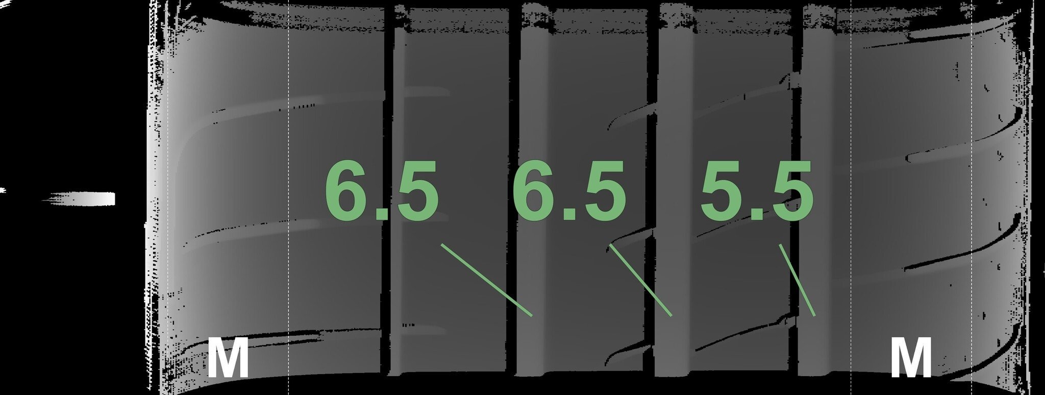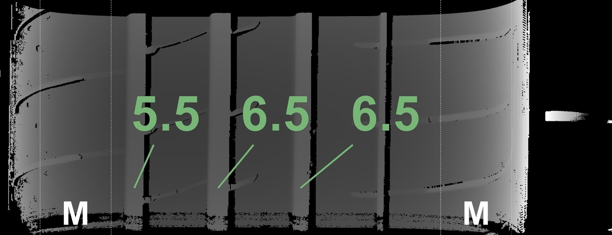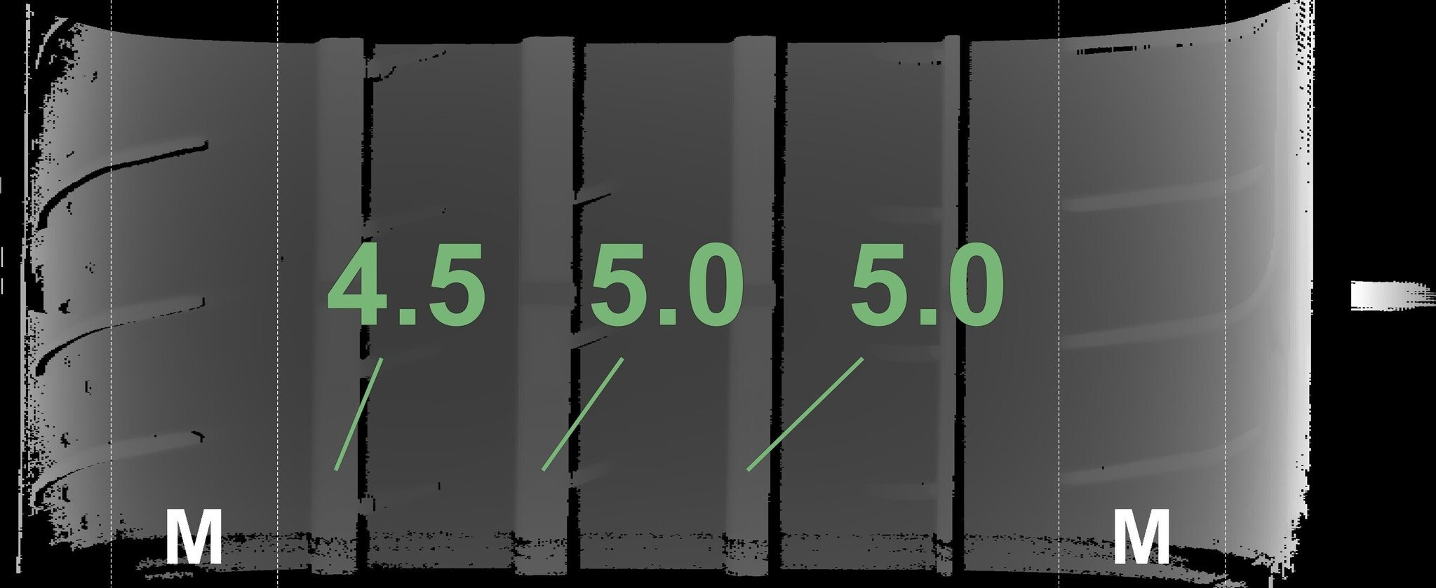 Die gemessenen Profiltiefen und die Details der Felgen sind oben dargestellt.
