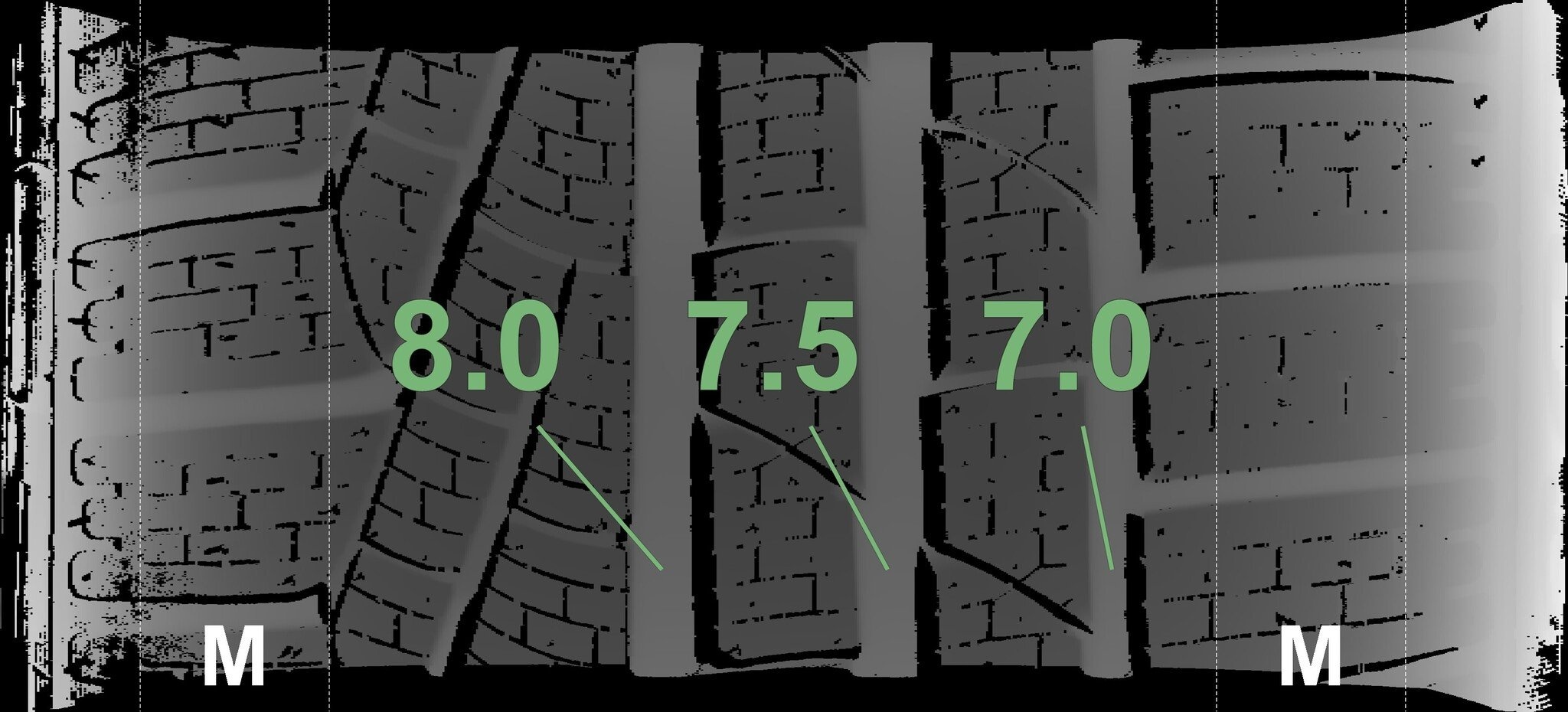 Die gemessenen Profiltiefen und Details der Felgen sind oben abgebildet.