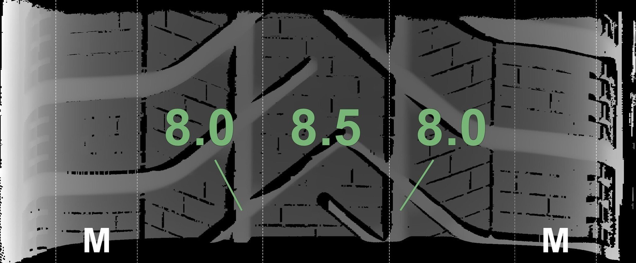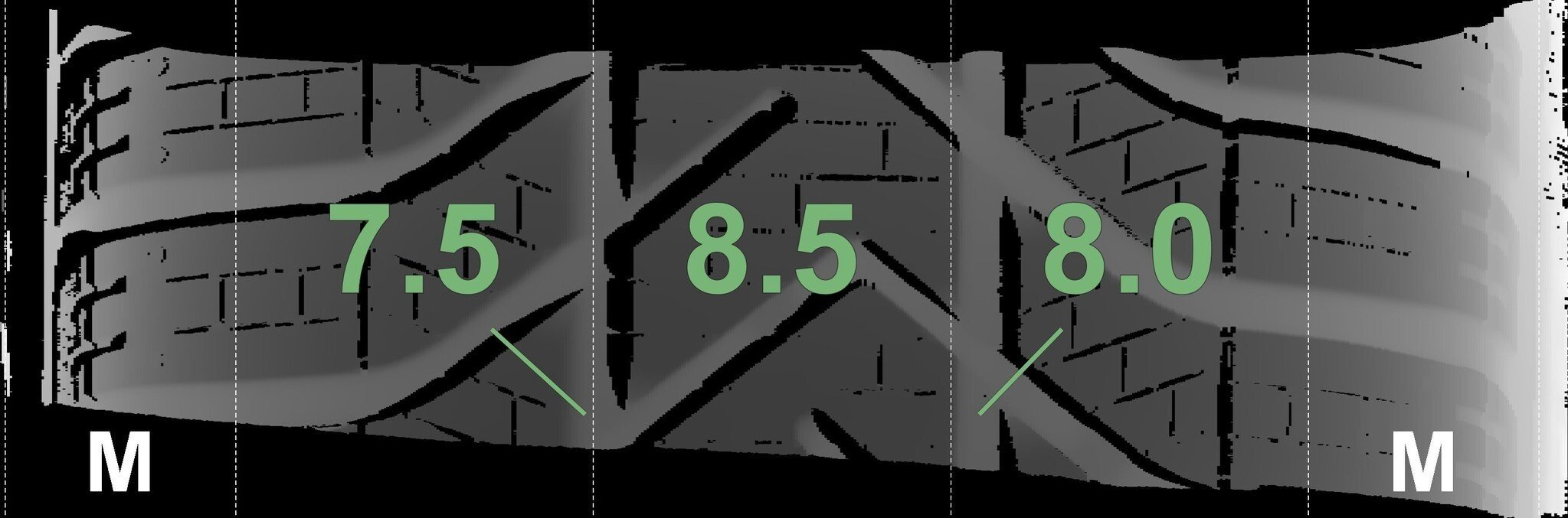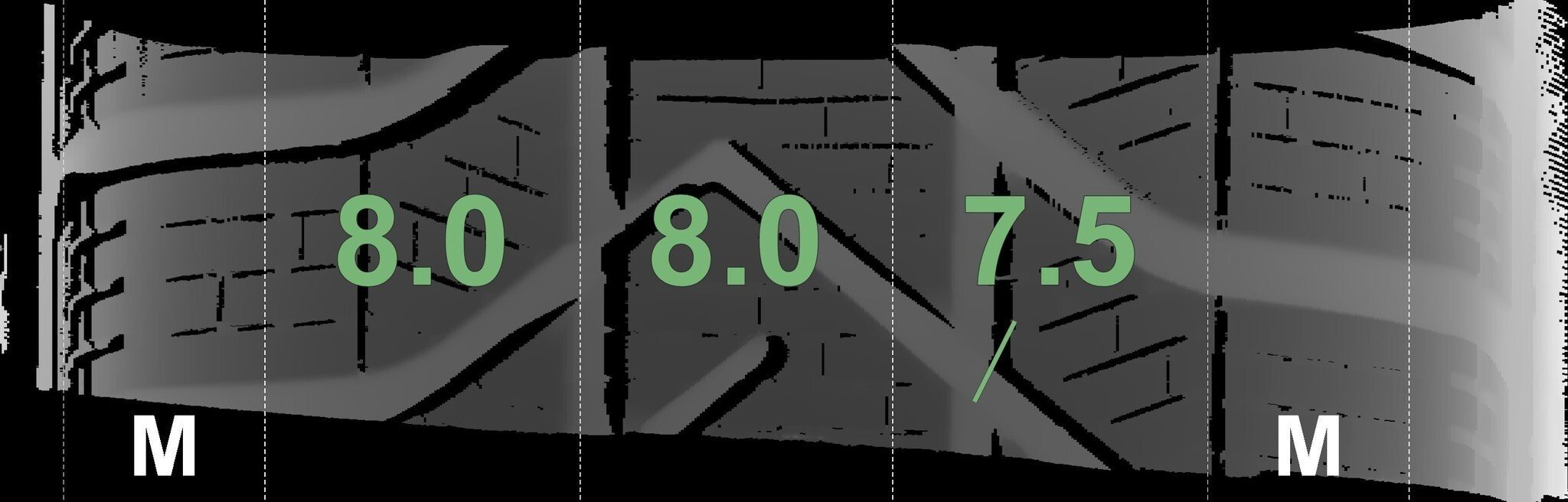 | Zustand | Profiltiefe | DOT | Vorderachse Rechts | Demo Noppen noch sichtbar | 8.0 mm | 4723 |