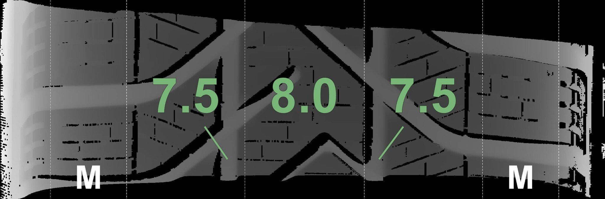 Die gemessenen Profiltiefen und die Details der Felgen sind oben dargestellt.