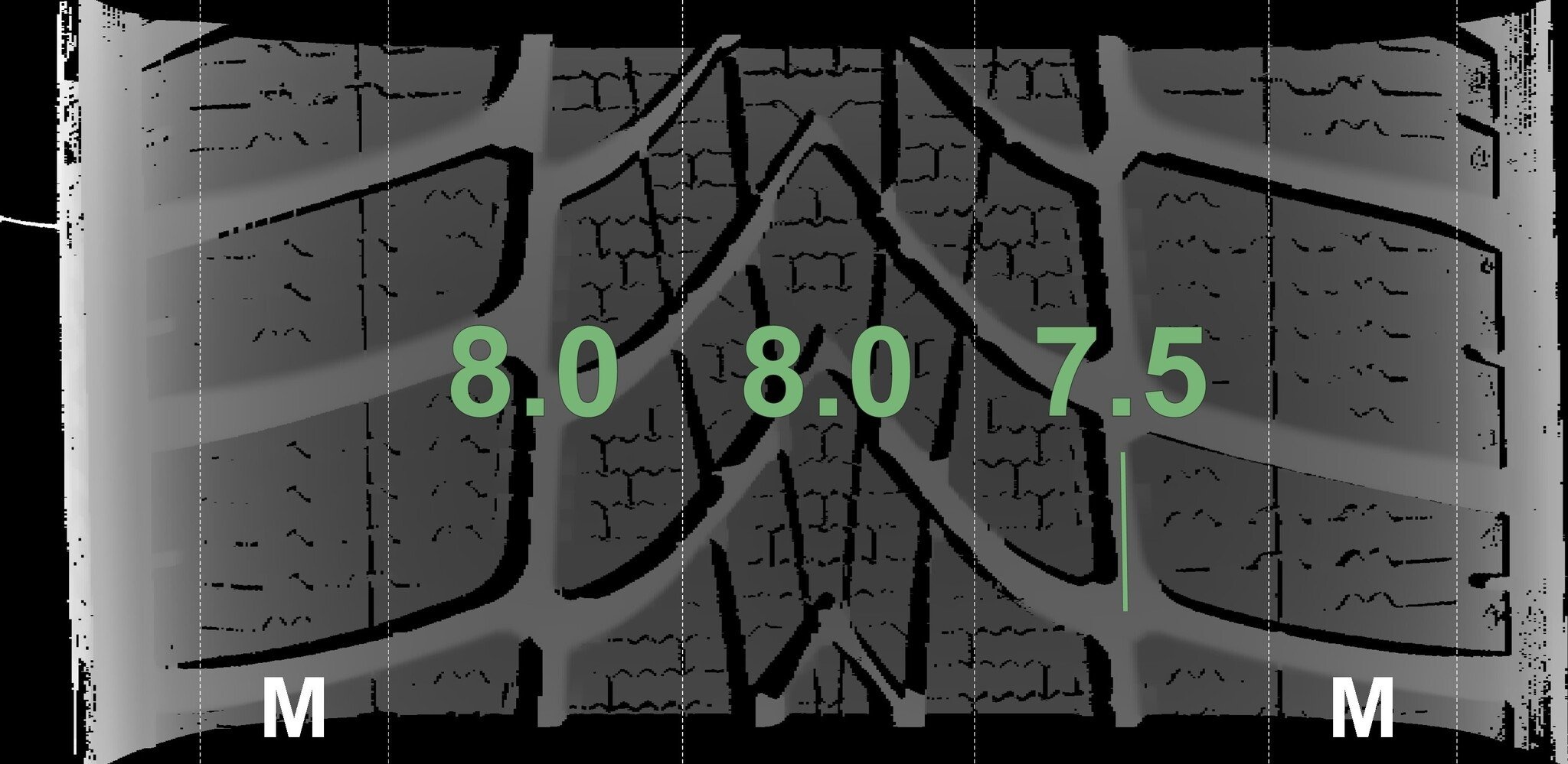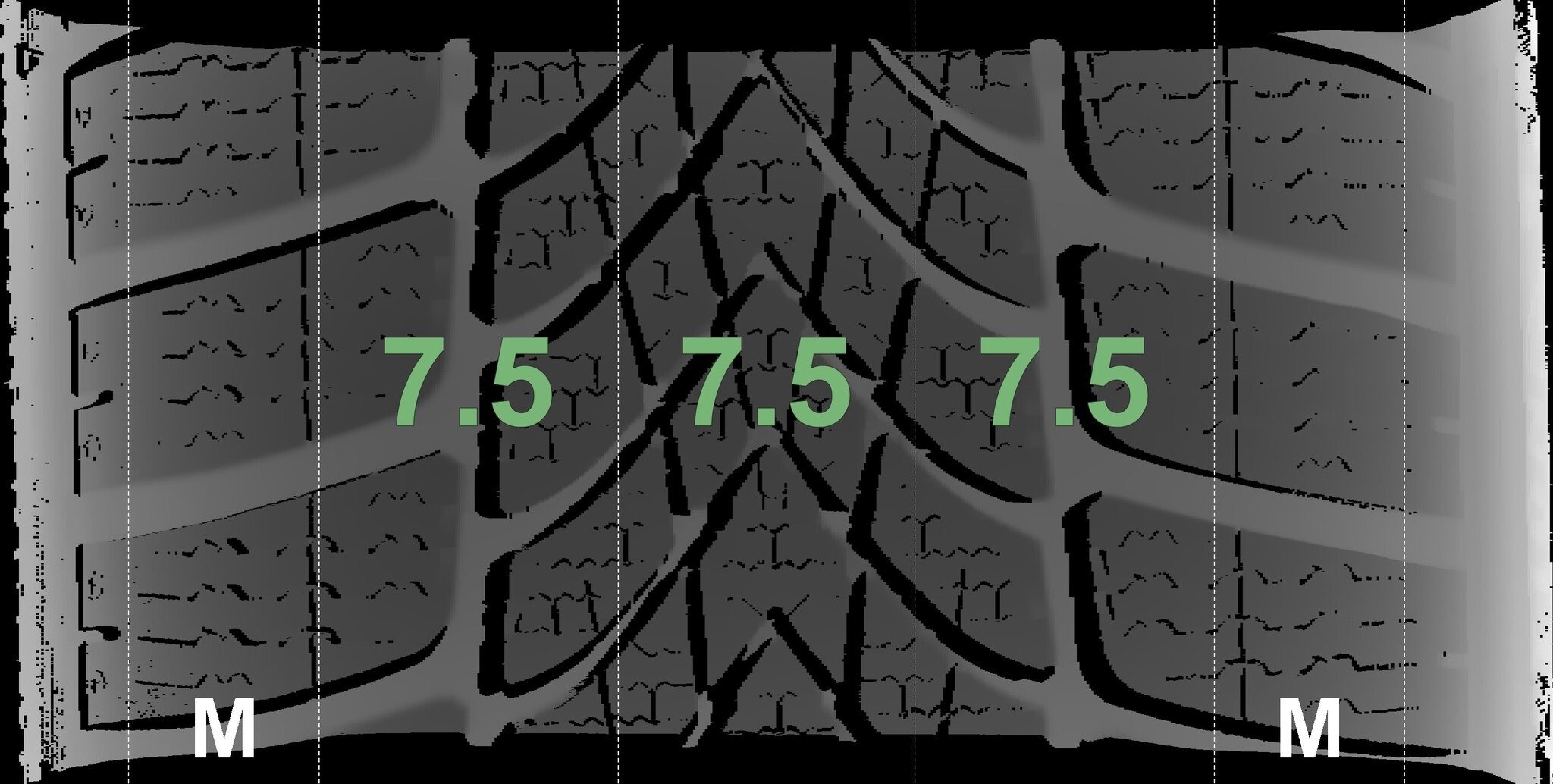 Zustand | Profiltiefe | DOT | Vorderachse Rechts | Demo-Noppen noch sichtbar | 7,5 mm | 2123 |