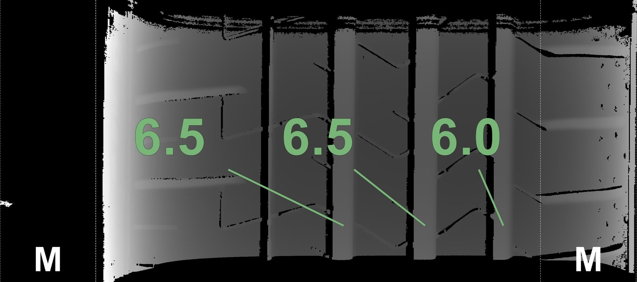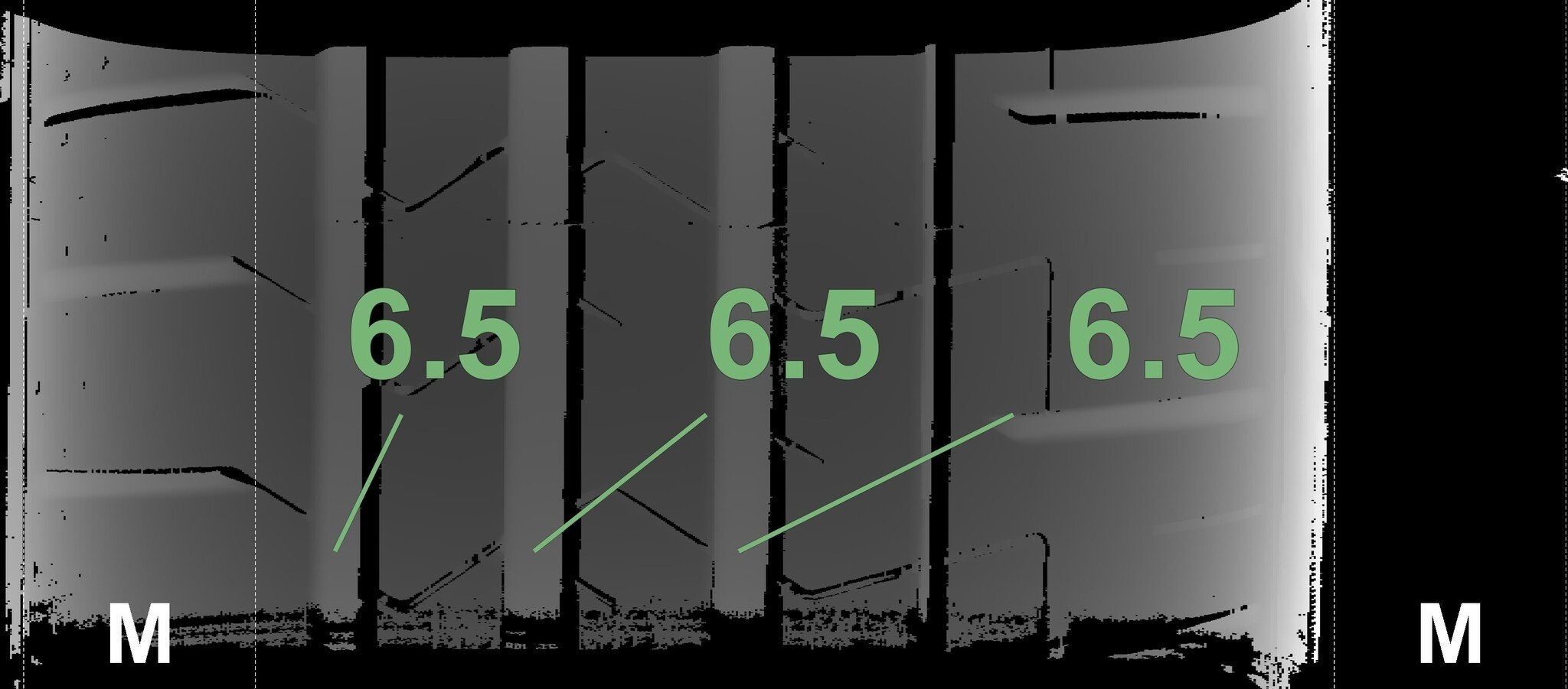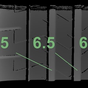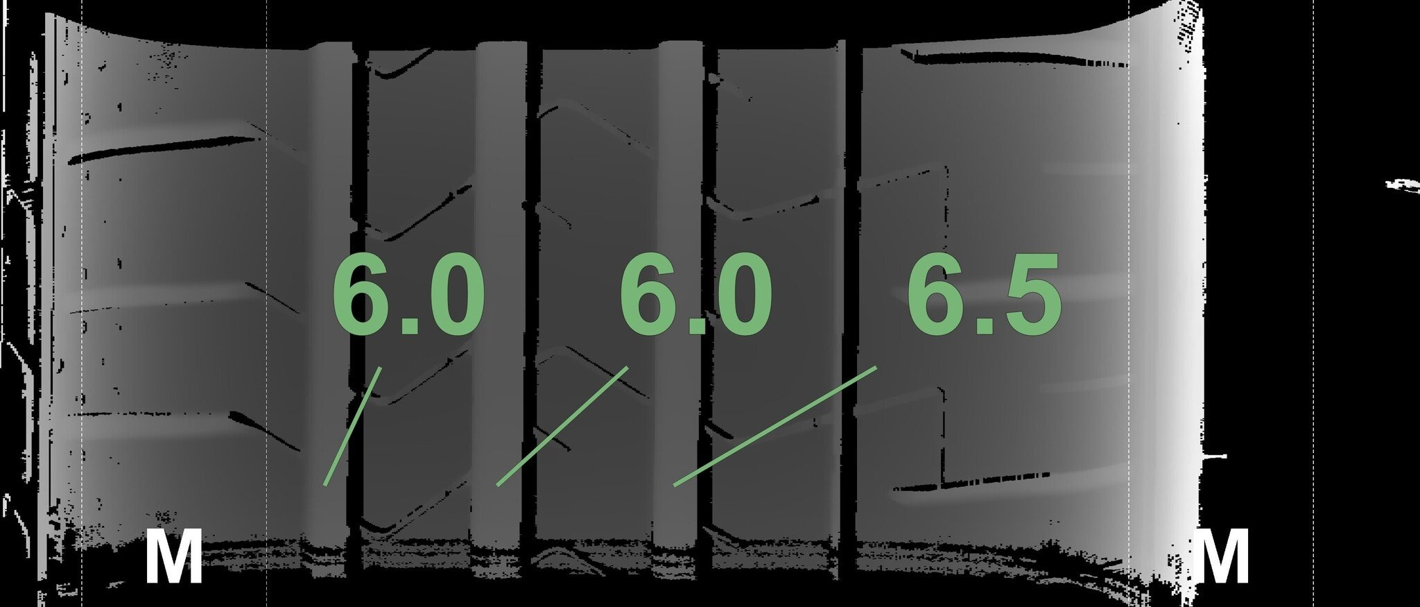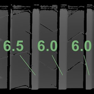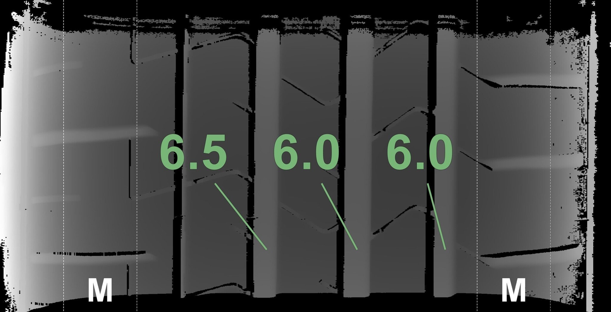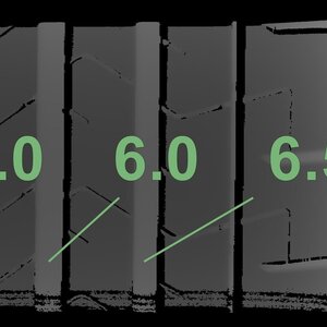 Die gemessenen Profiltiefen und die Details der Felgen sind oben dargestellt.