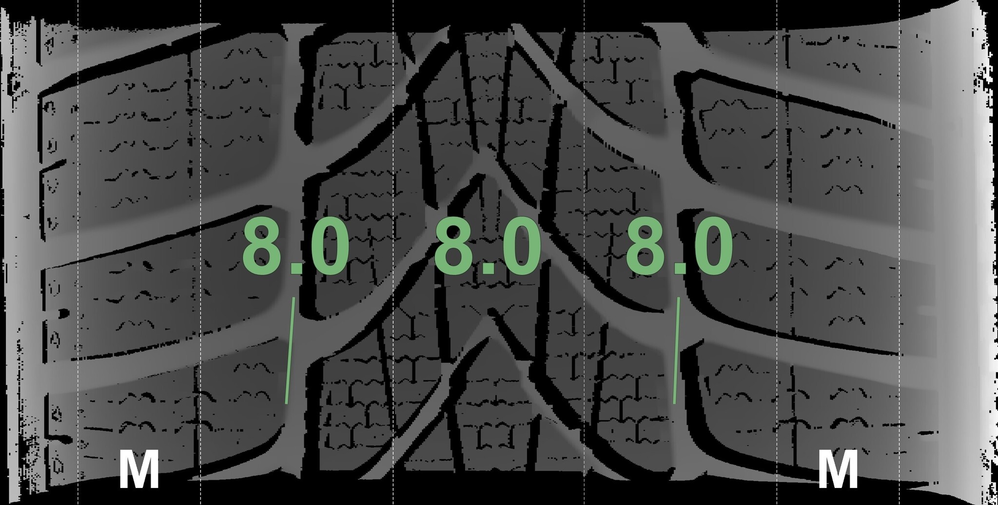 Zustand | Profiltiefe | DOT | Hinterachse Rechts | Neu | 8,0 mm | 3023 |