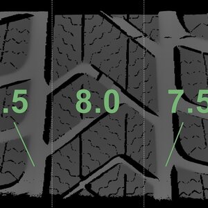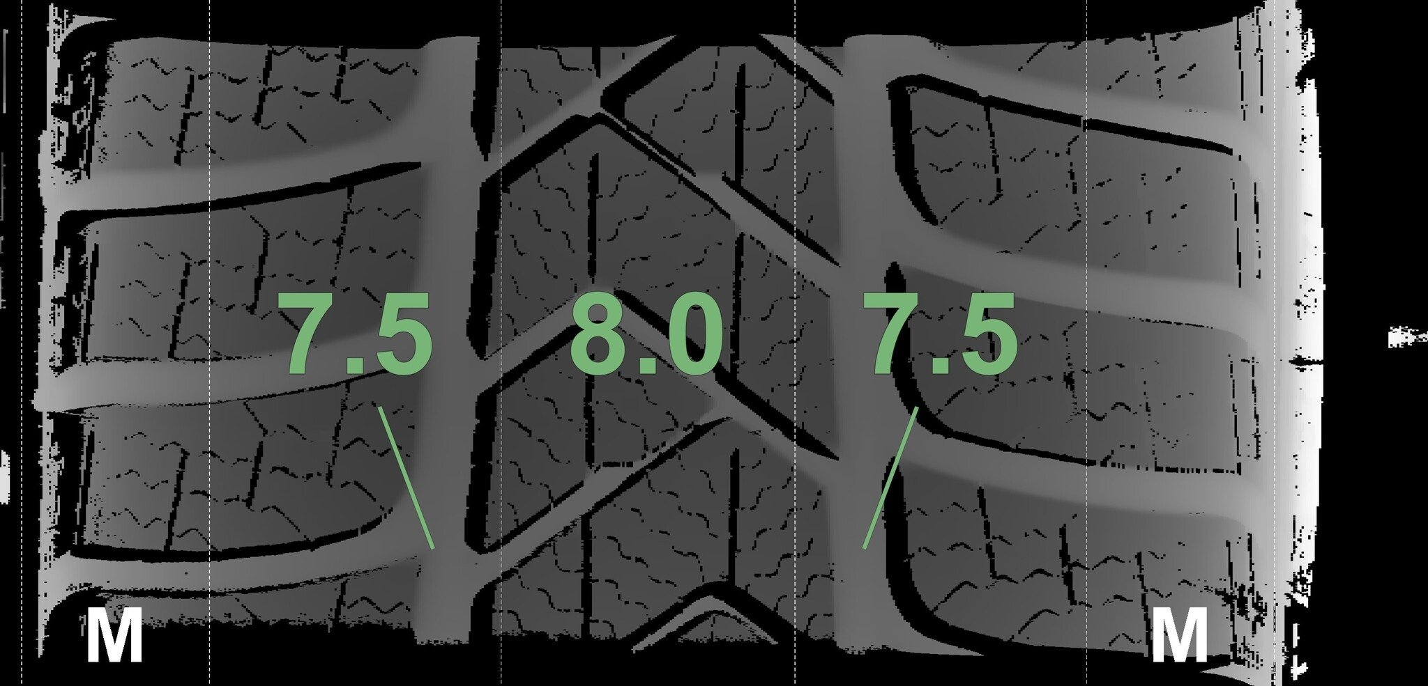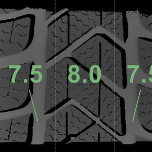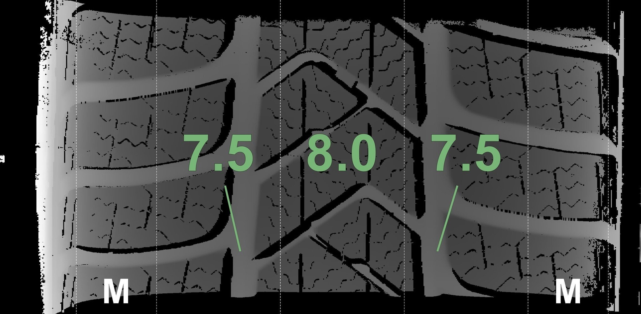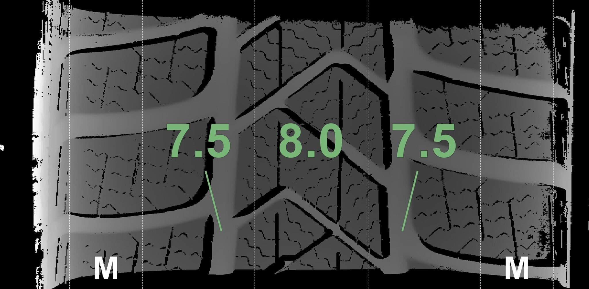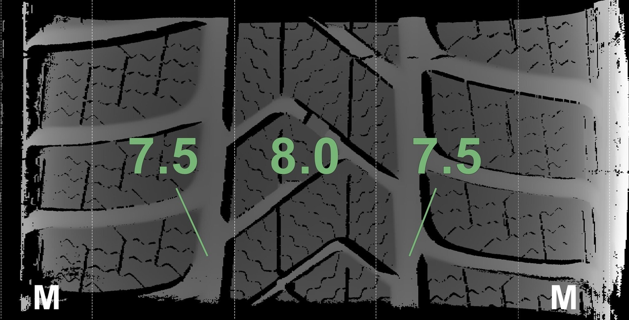 | Zustand | Profiltiefe | DOT | Vorderachse Links | Neu | 7,5 mm | 2524 |