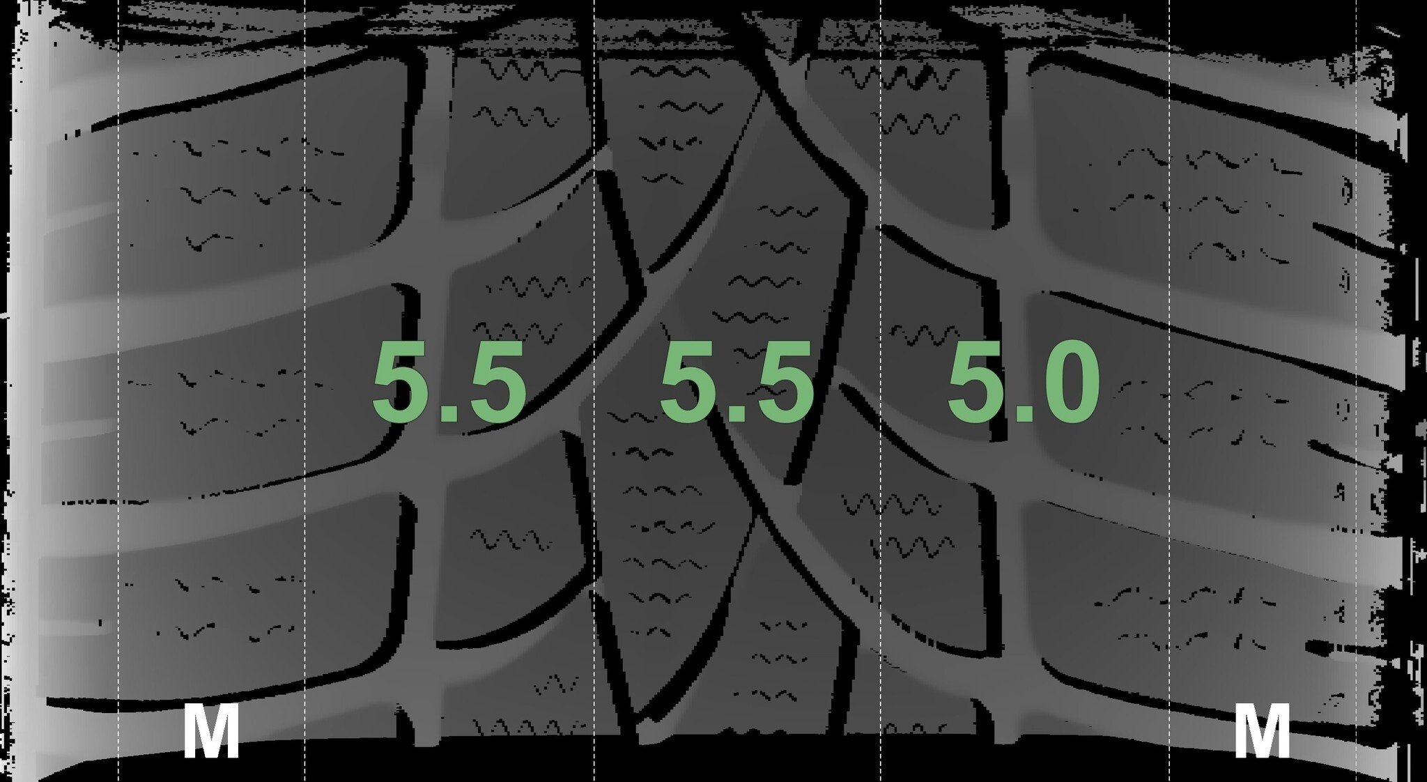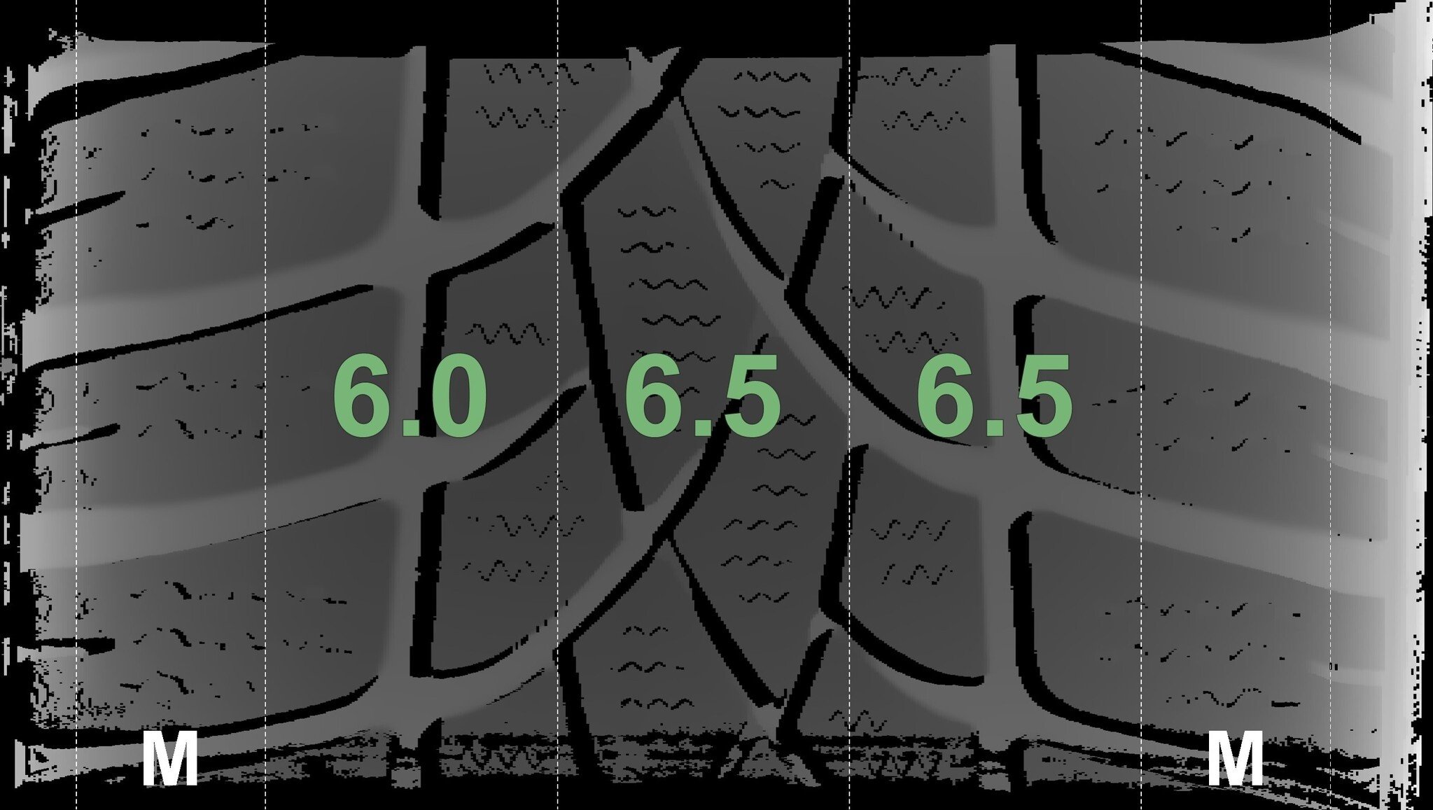 Die gemessenen Profiltiefen und die Details der Felgen sind oben dargestellt.