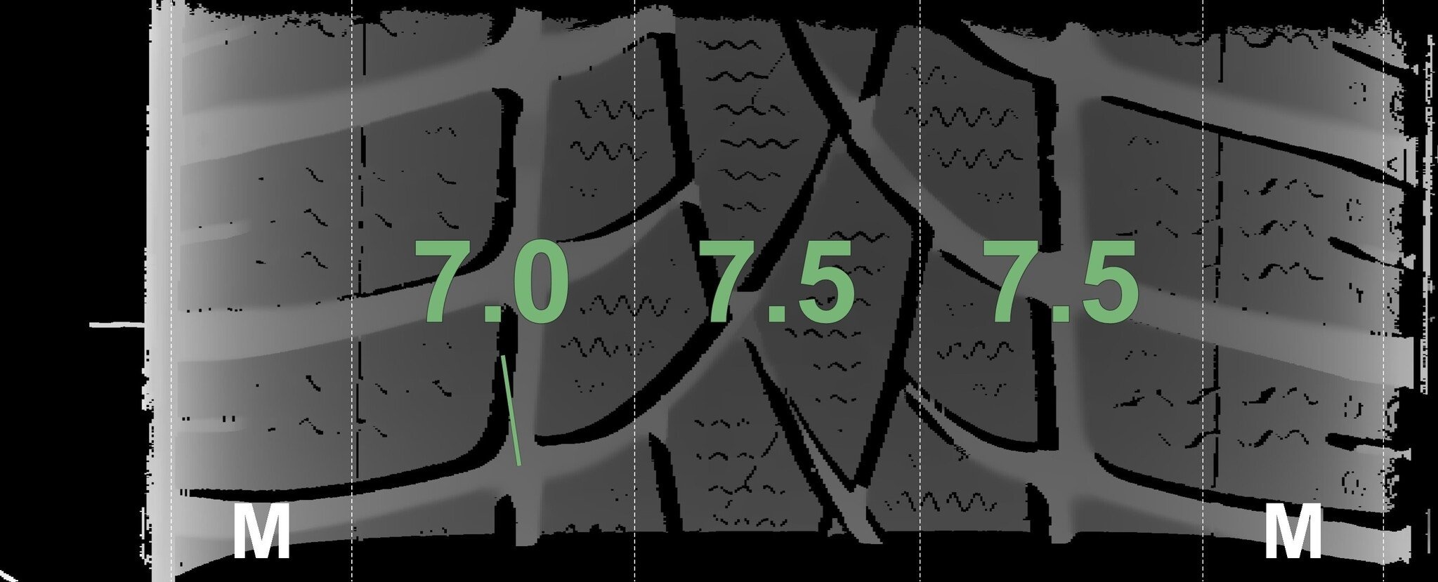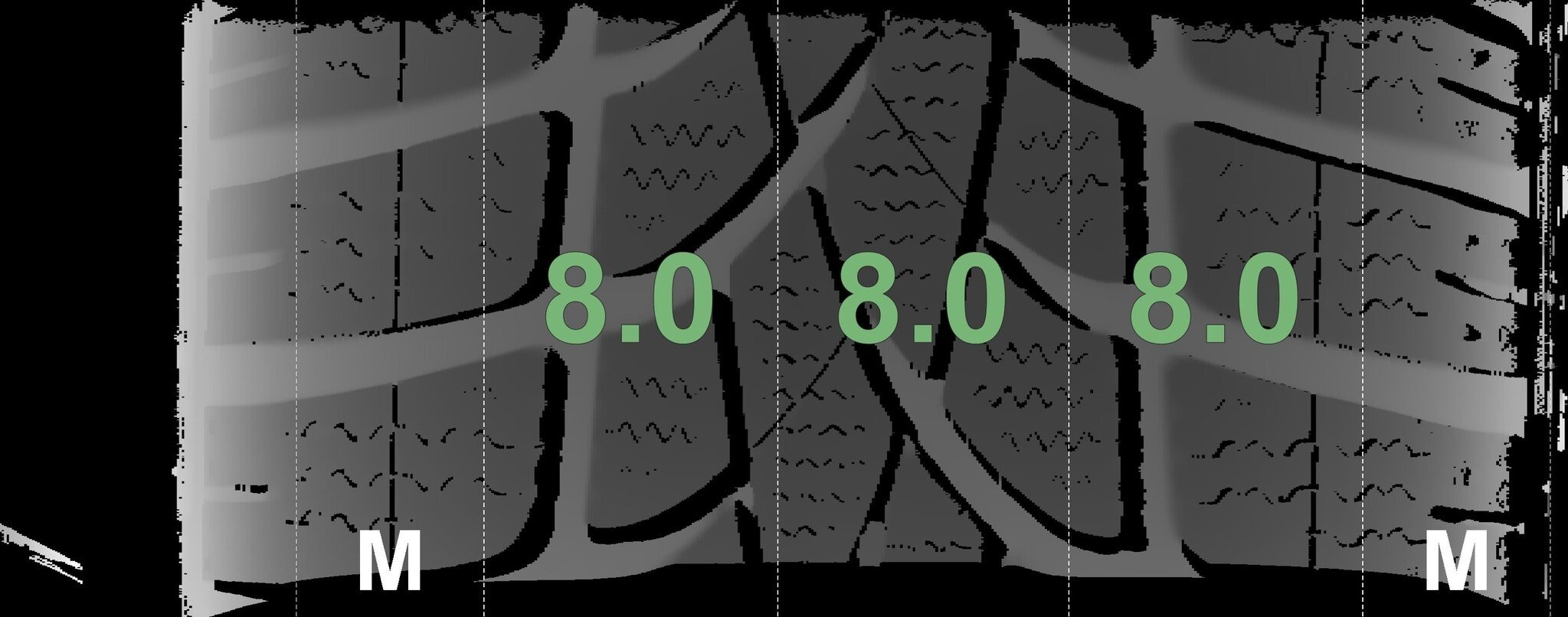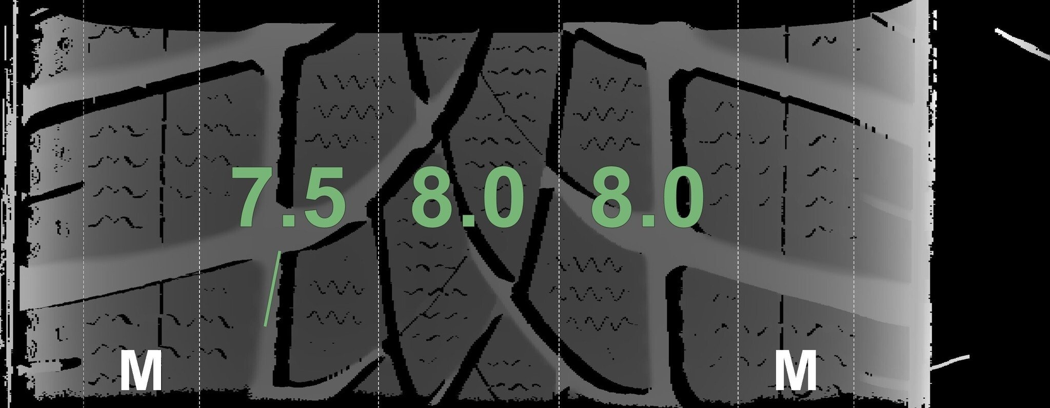 | Zustand | Profiltiefe | DOT | Hinterachse Links | Demo Noppen noch sichtbar | 8.0 mm | 3922 |