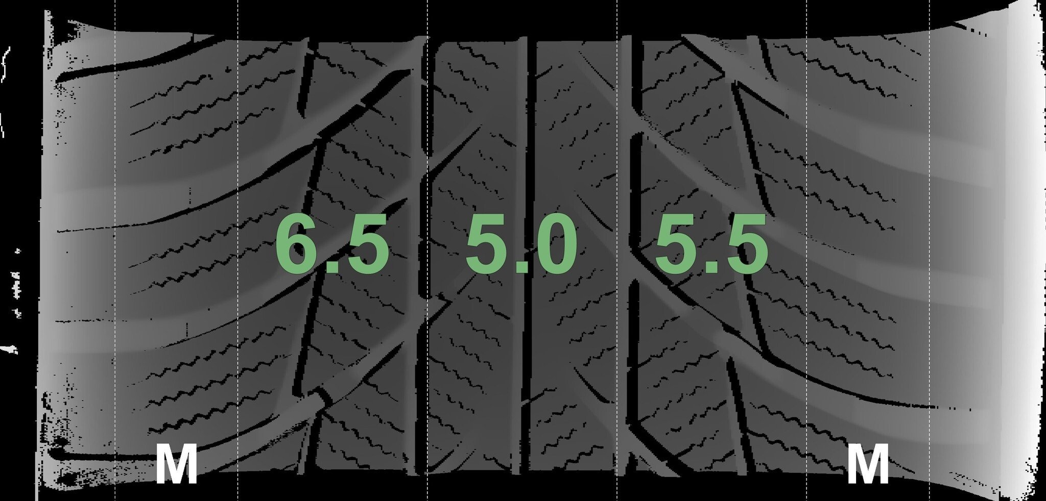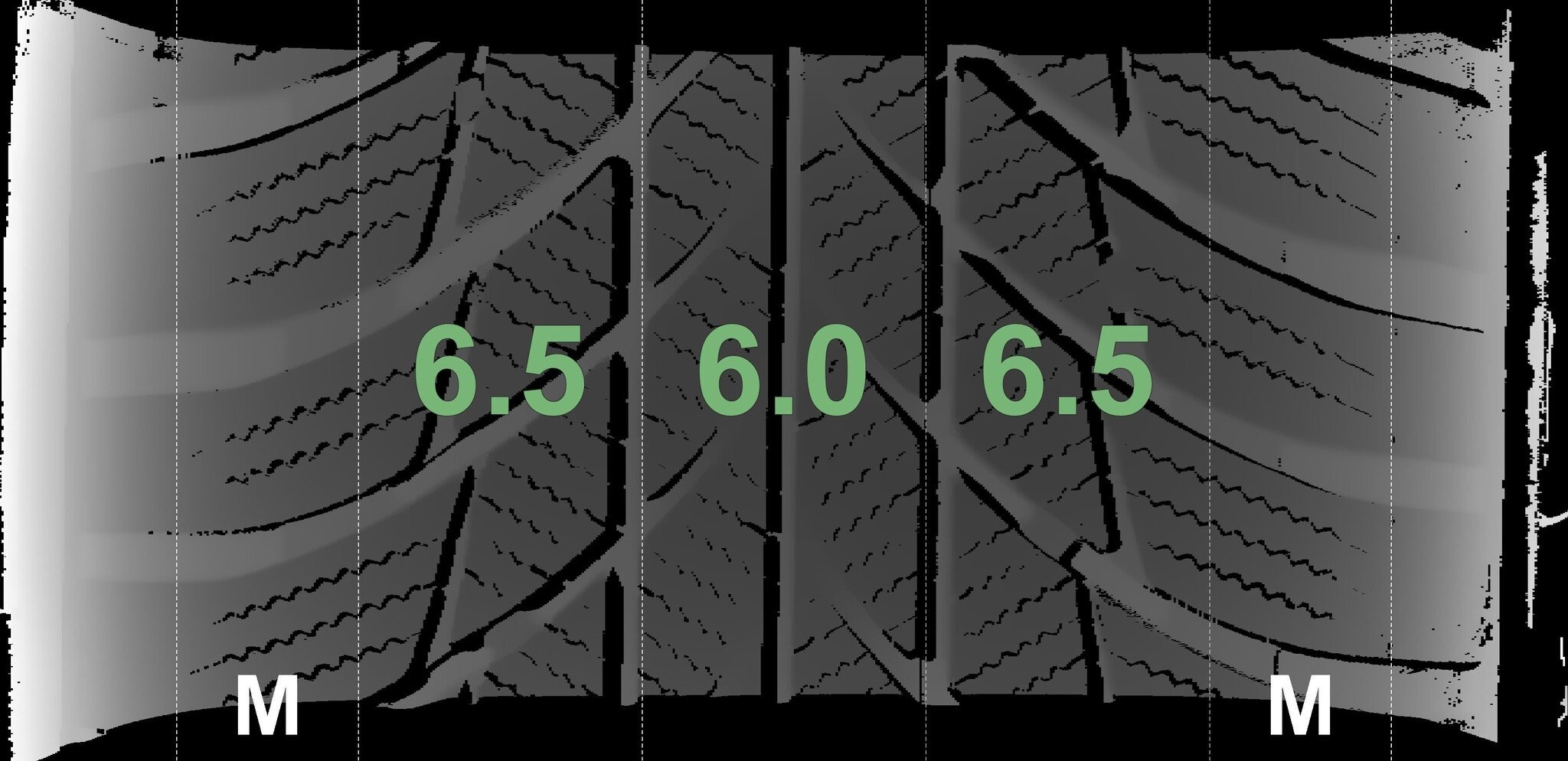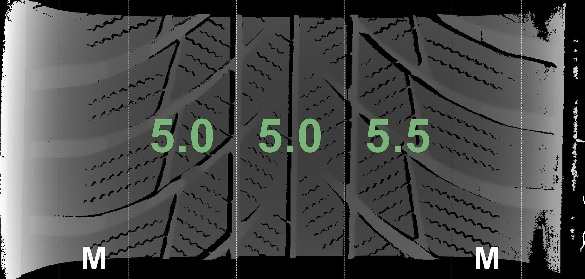 Die gemessenen Profiltiefen und die Details der Felgen sind oben dargestellt.
