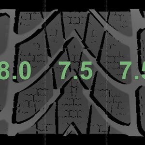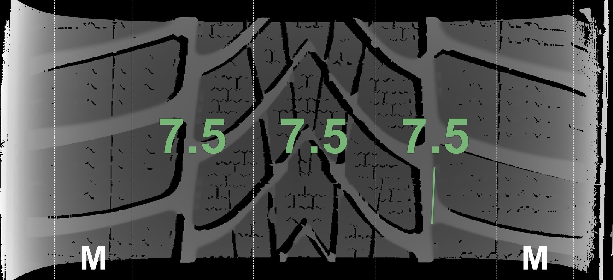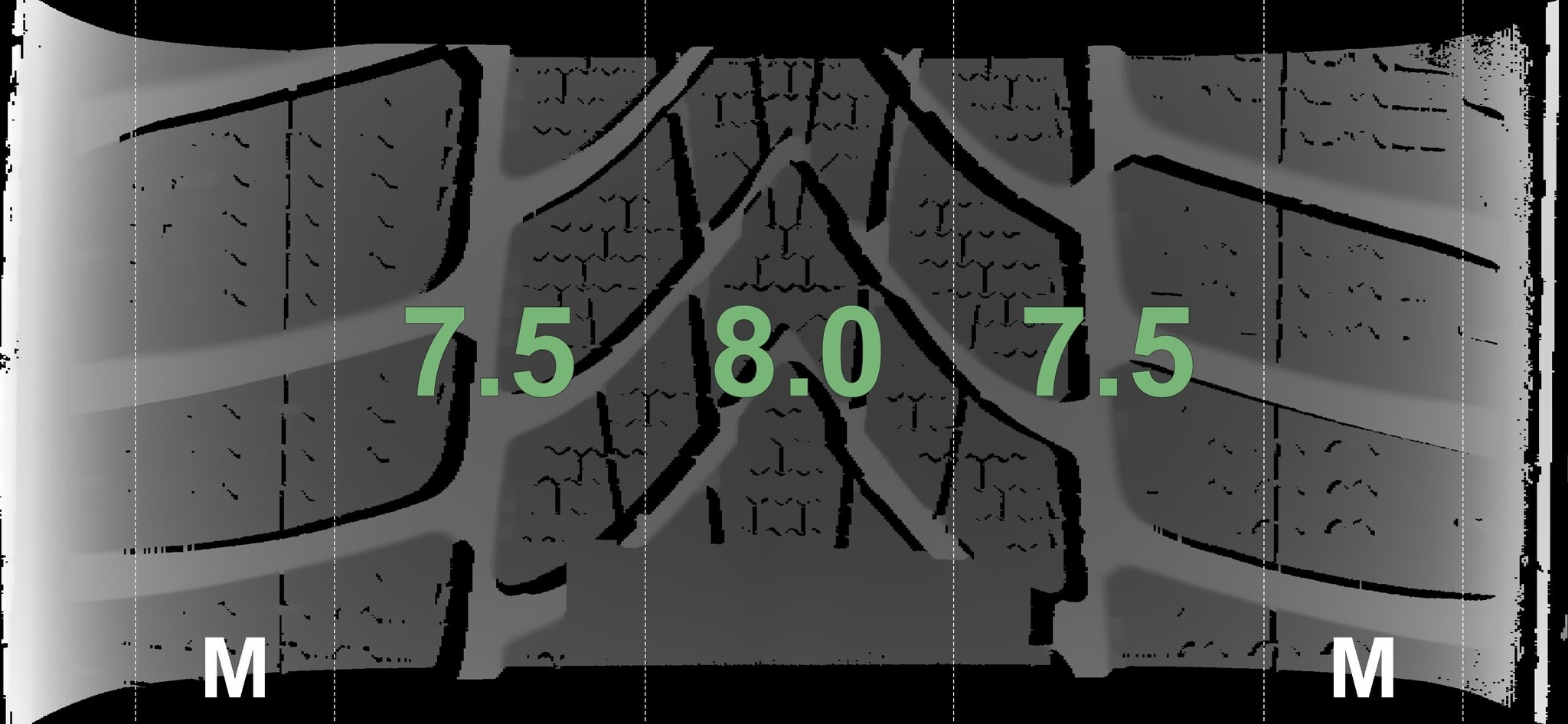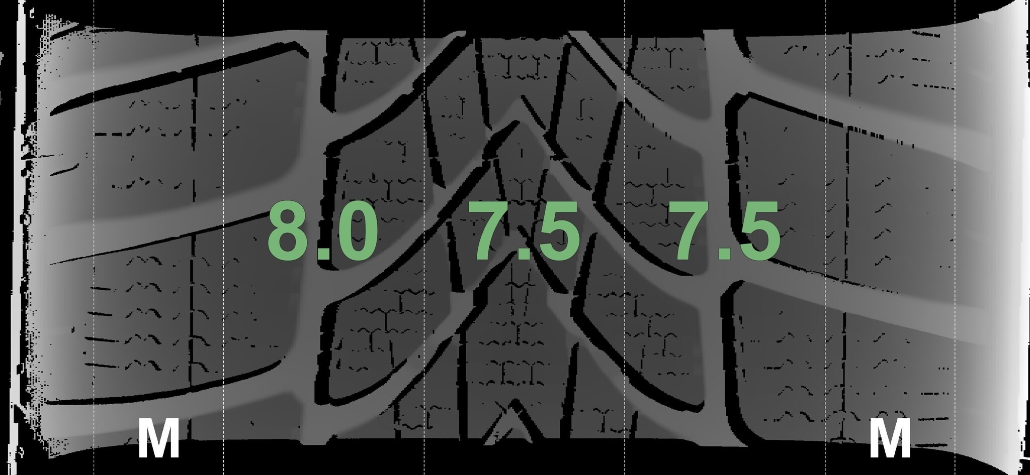 | Zustand | Profiltiefe | DOT | Vorderachse Links | Gebraucht | 7.5 mm | 2924 |