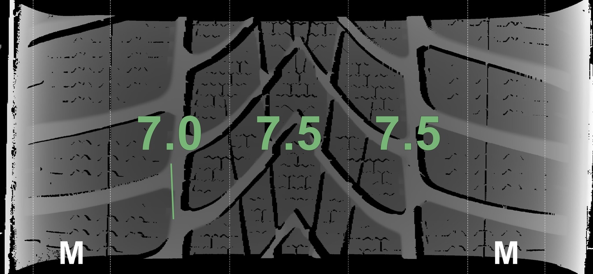 Die gemessenen Profiltiefen und die Details der Felgen sind oben dargestellt.