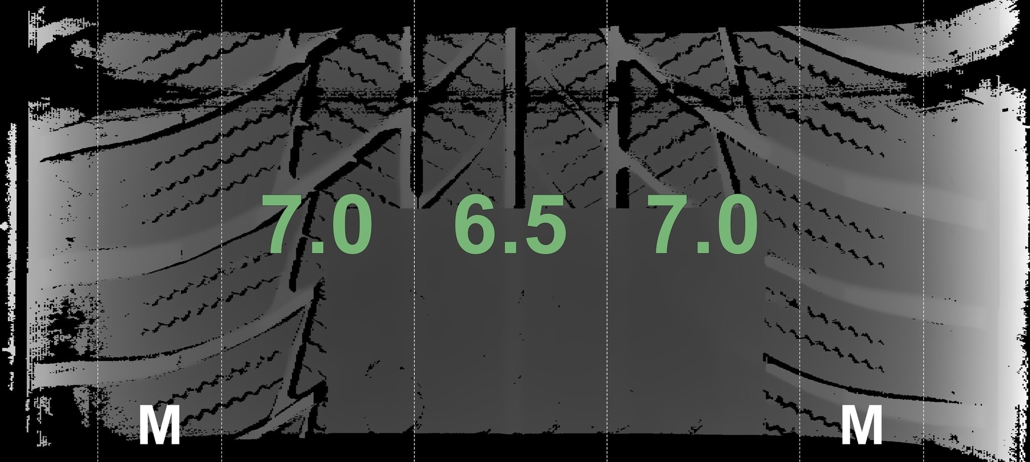 | Zustand | Profiltiefe | DOT | Vorderachse Links | Gebraucht | 6,5 mm | 2921 |