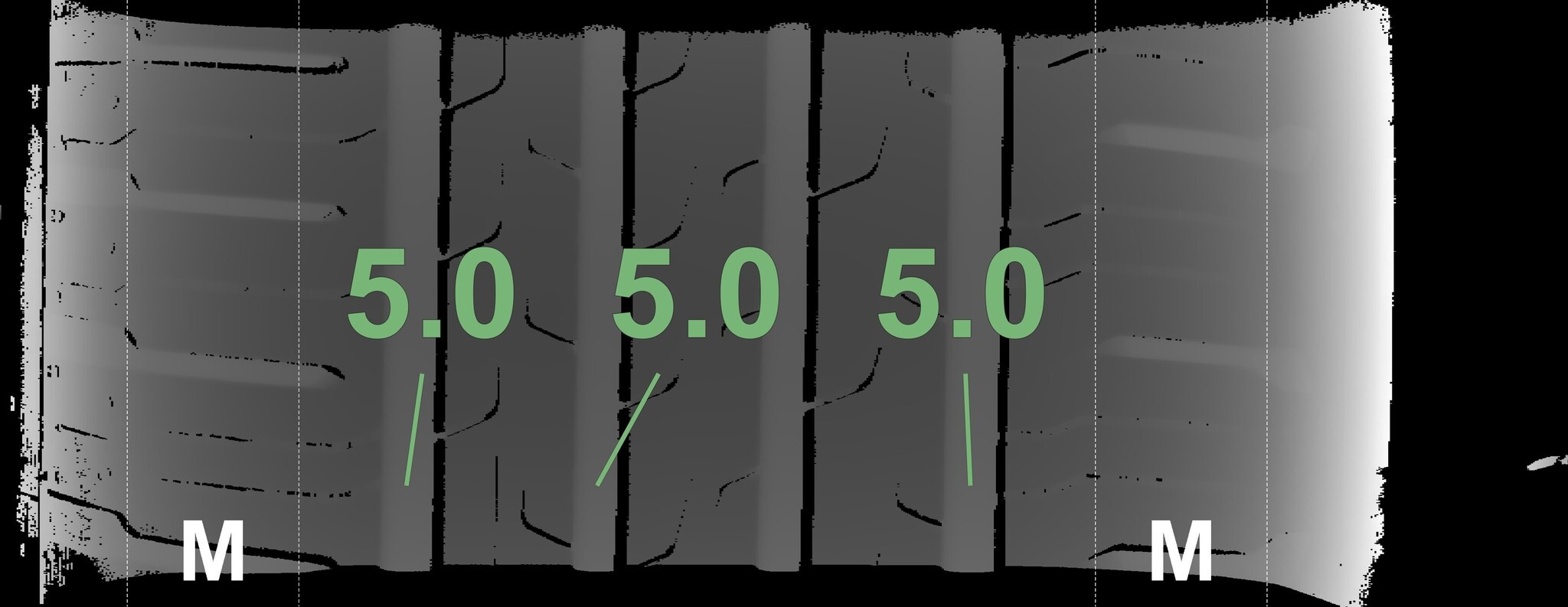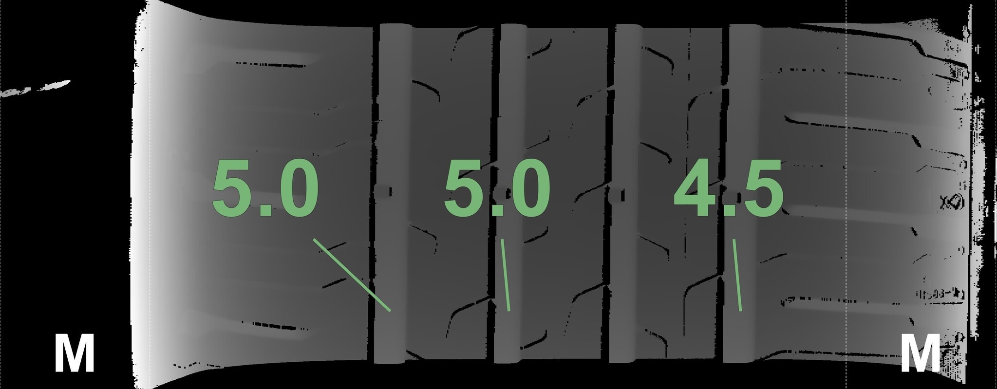 Die gemessenen Profiltiefen und die Details der Felgen sind oben angegeben.