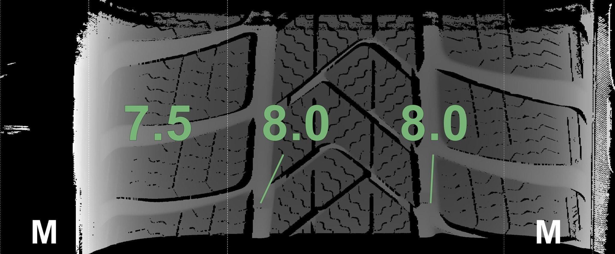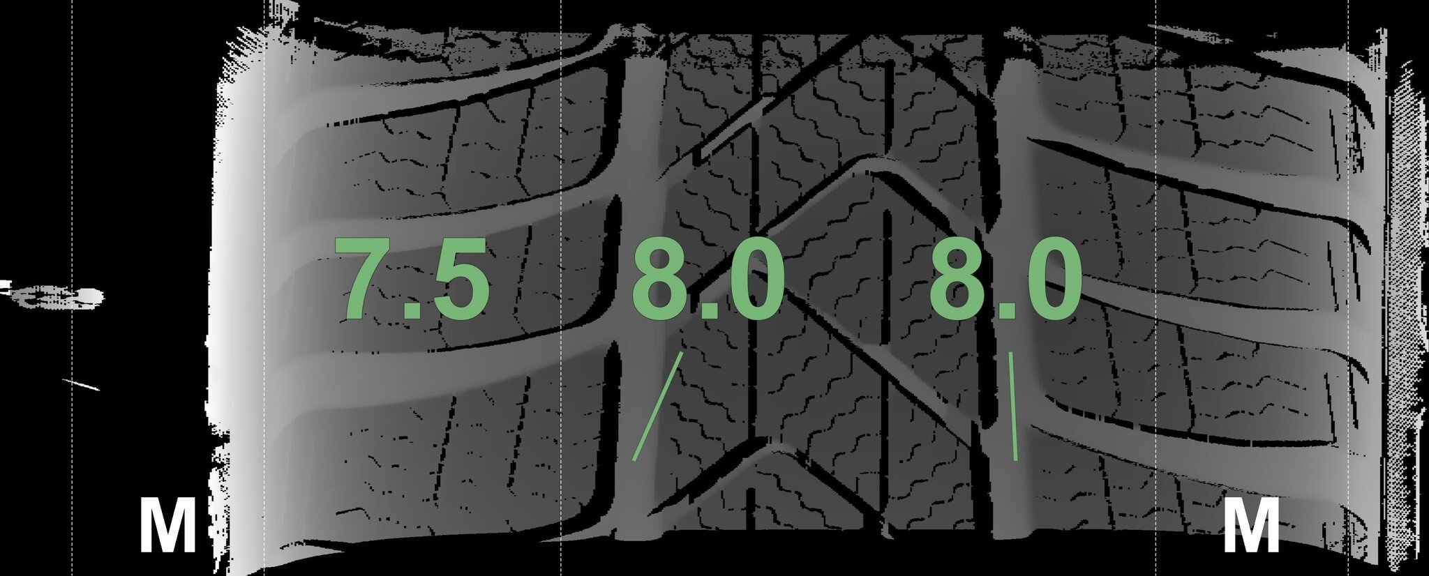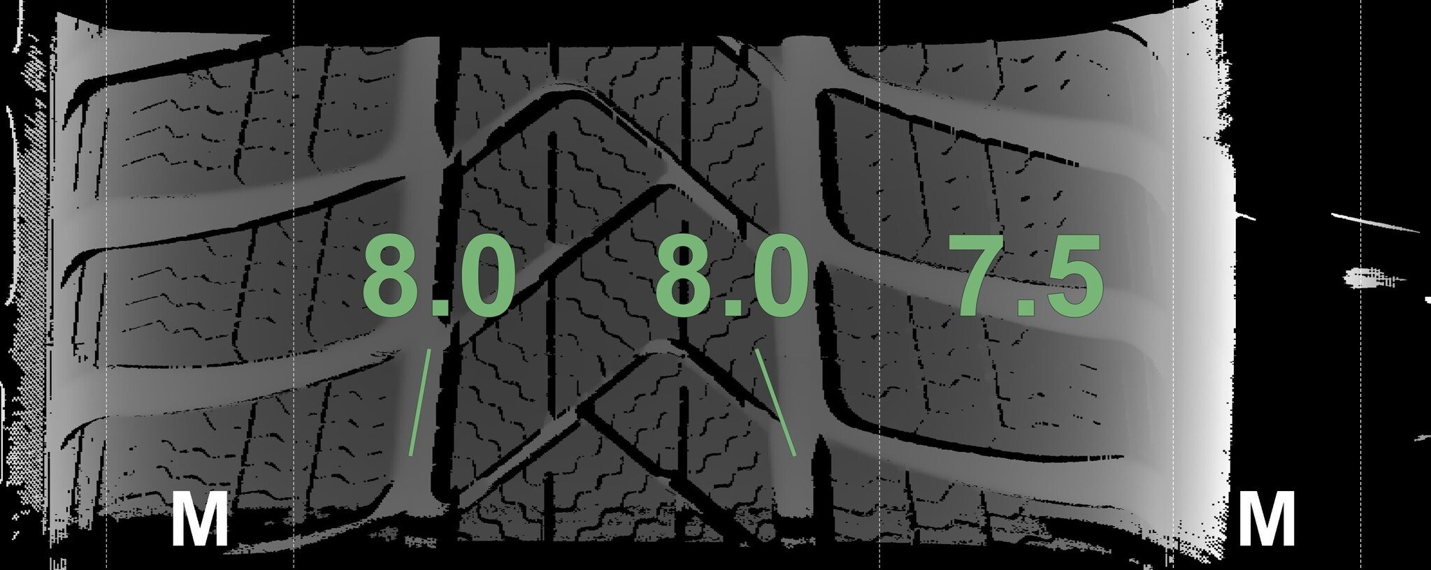 Die gemessenen Profiltiefen und die Details der Felgen sind oben dargestellt.