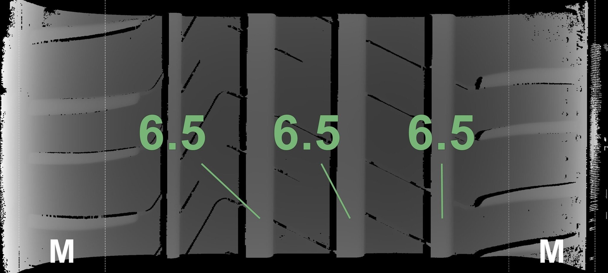Zustand | Profiltiefe | DOT | Hinterachse Links | Neu | 6,5 mm | 1123 |
