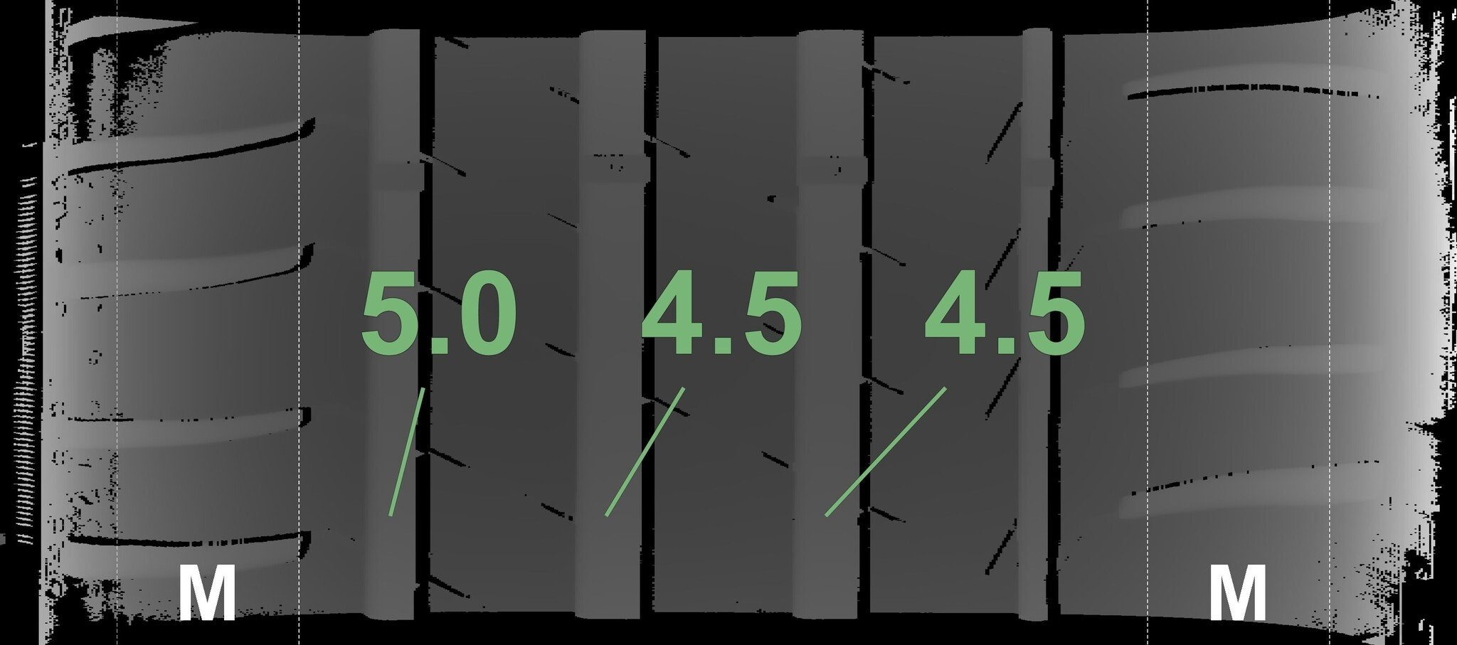Die gemessenen Profiltiefen und Details der Felgen sind oben dargestellt.
