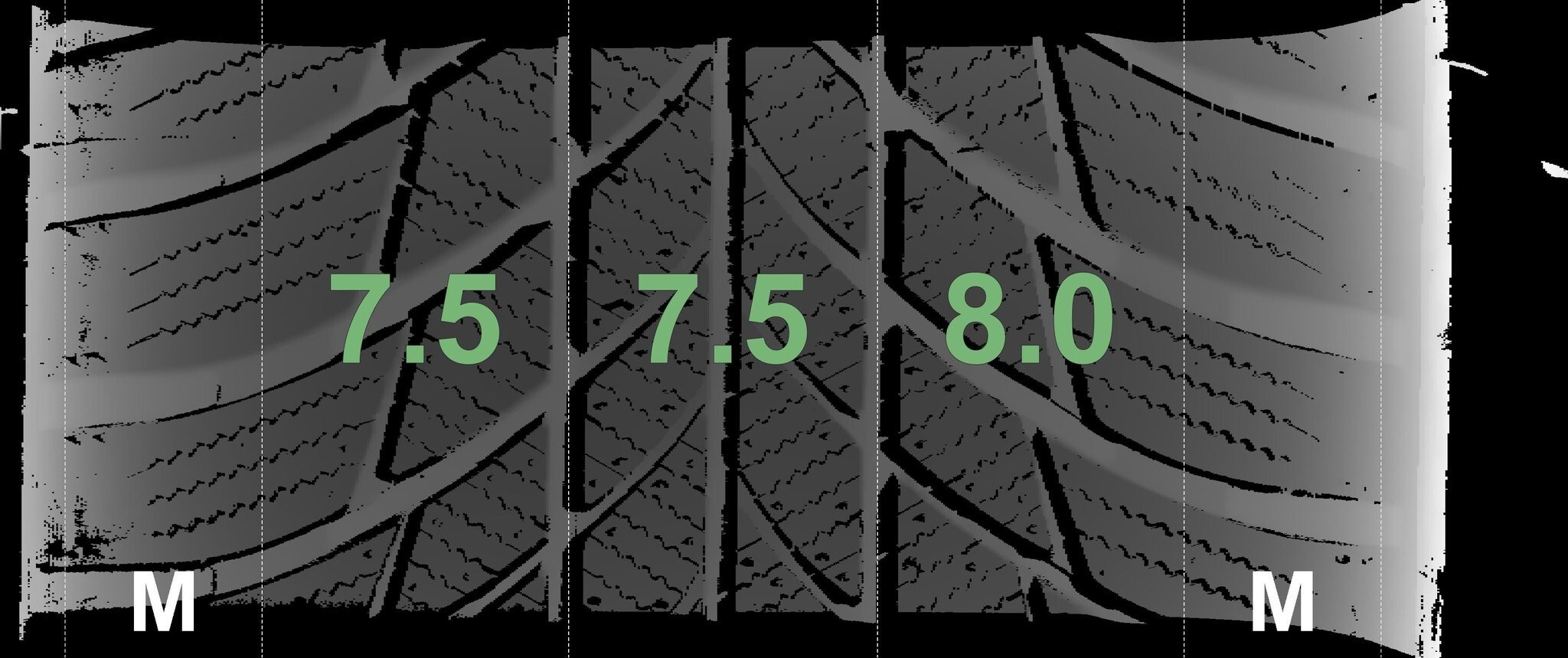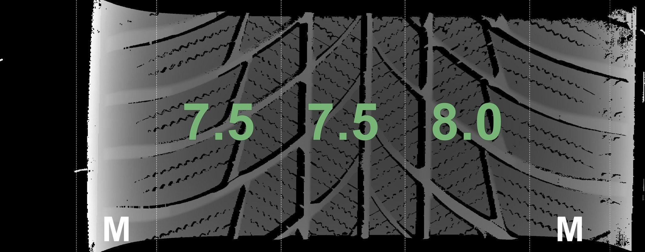 | Zustand | Profiltiefe | DOT | Vorderachse Rechts | Neu | 7,5 mm | 4222 |