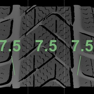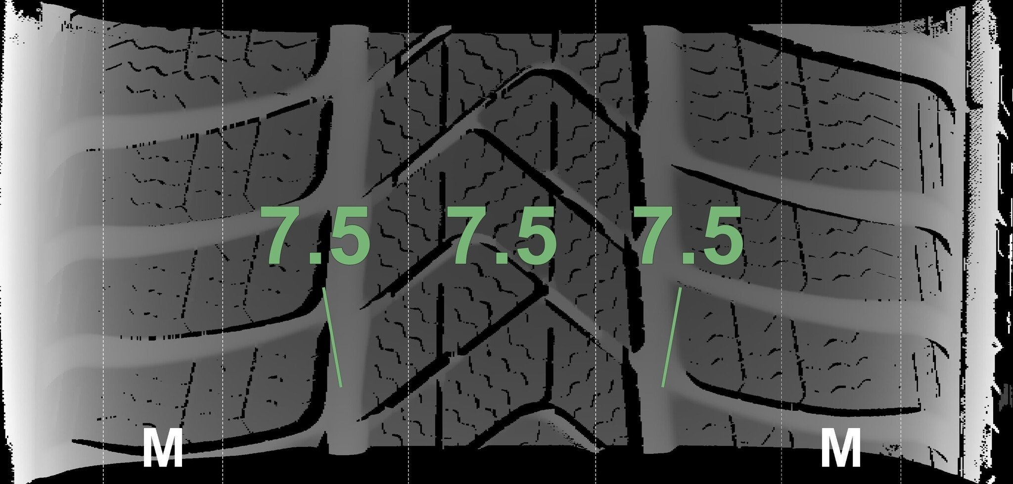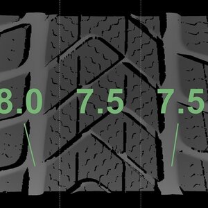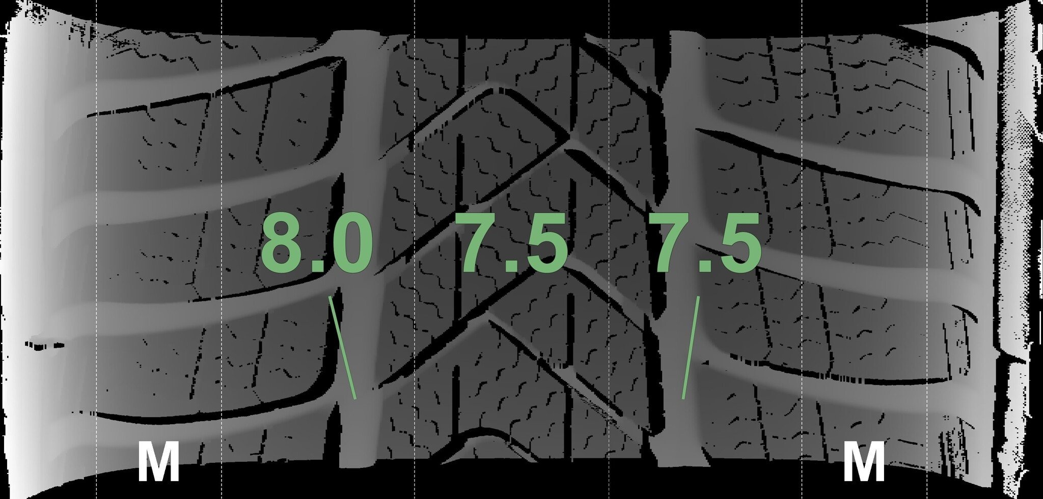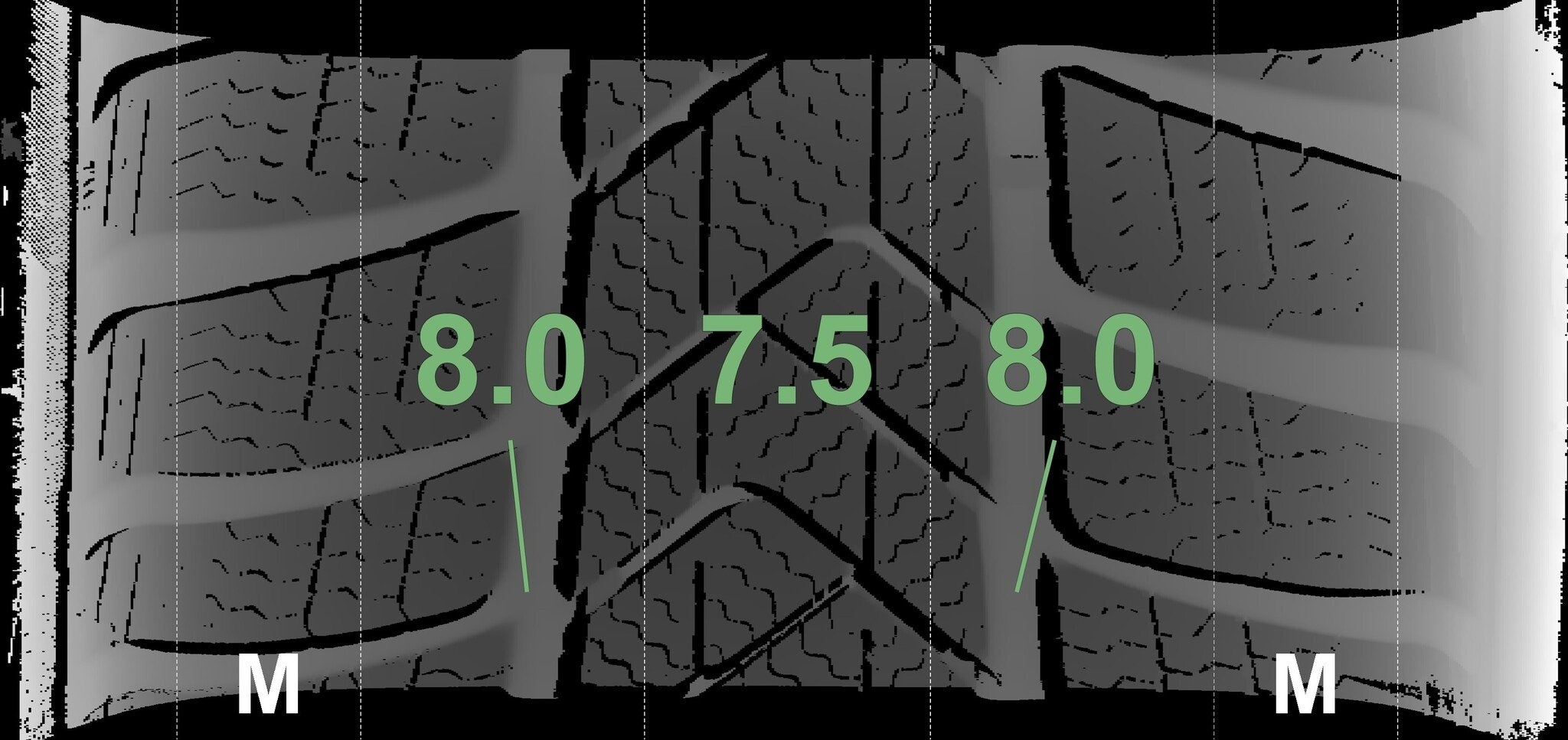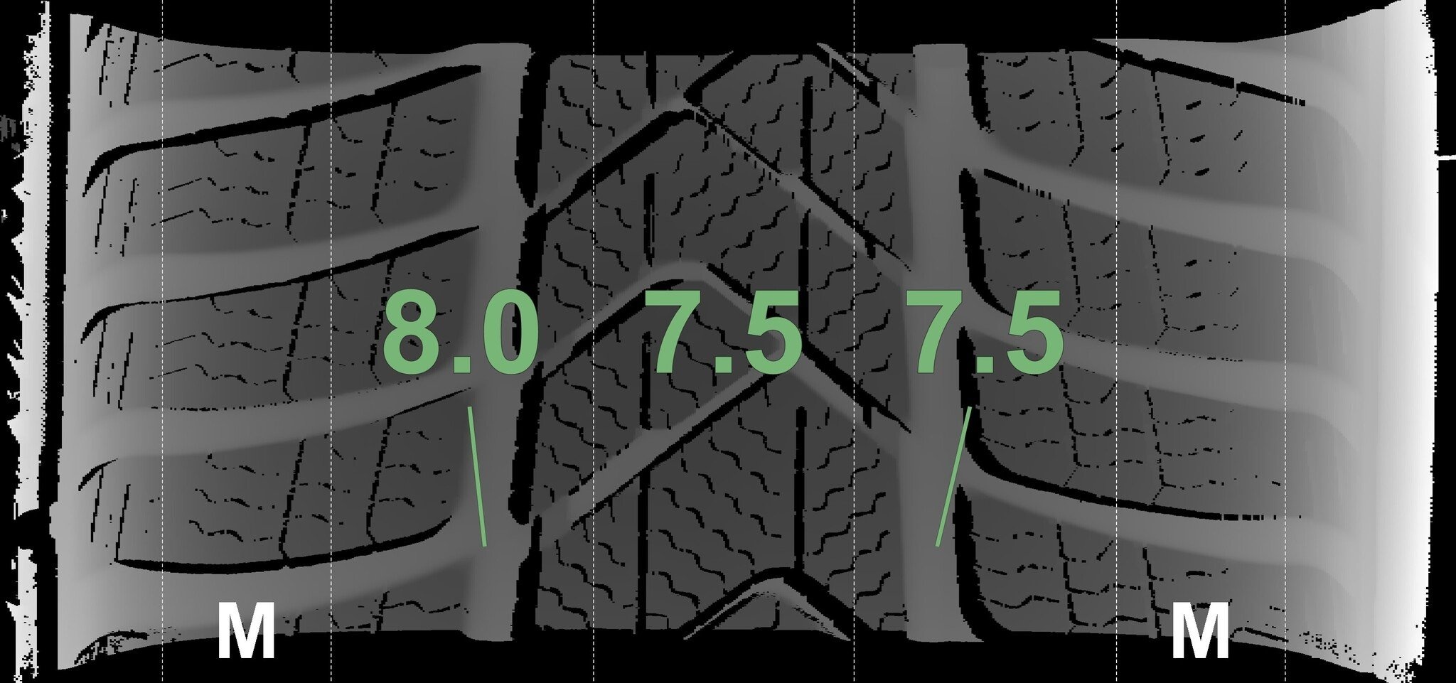 | Zustand | Profiltiefe | DOT | Vorderachse Links | Neu | 7.5 mm | 2922 |