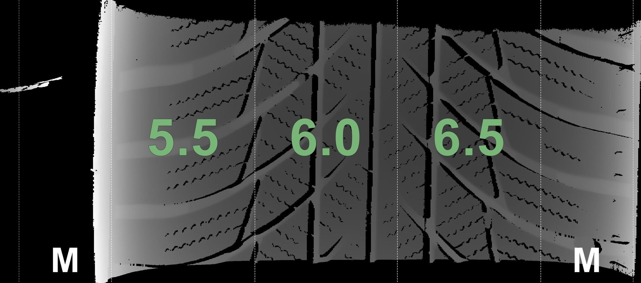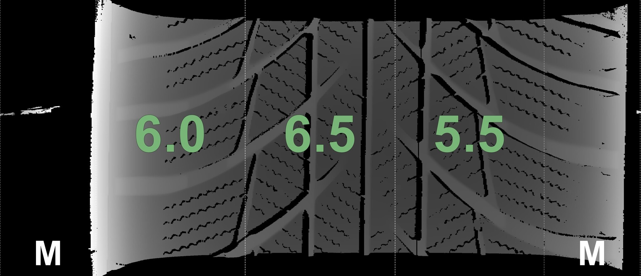 Die gemessenen Profiltiefen und die Details der Felgen sind oben dargestellt.