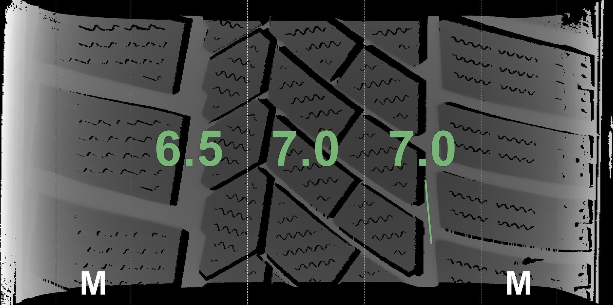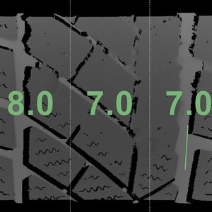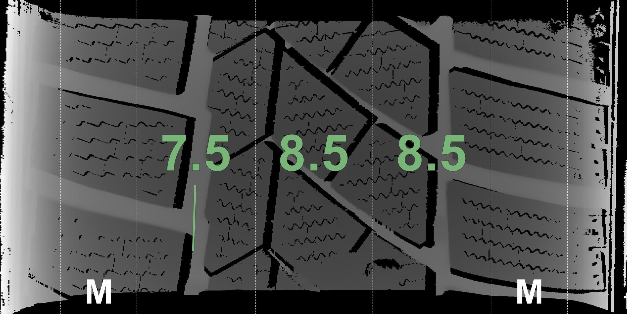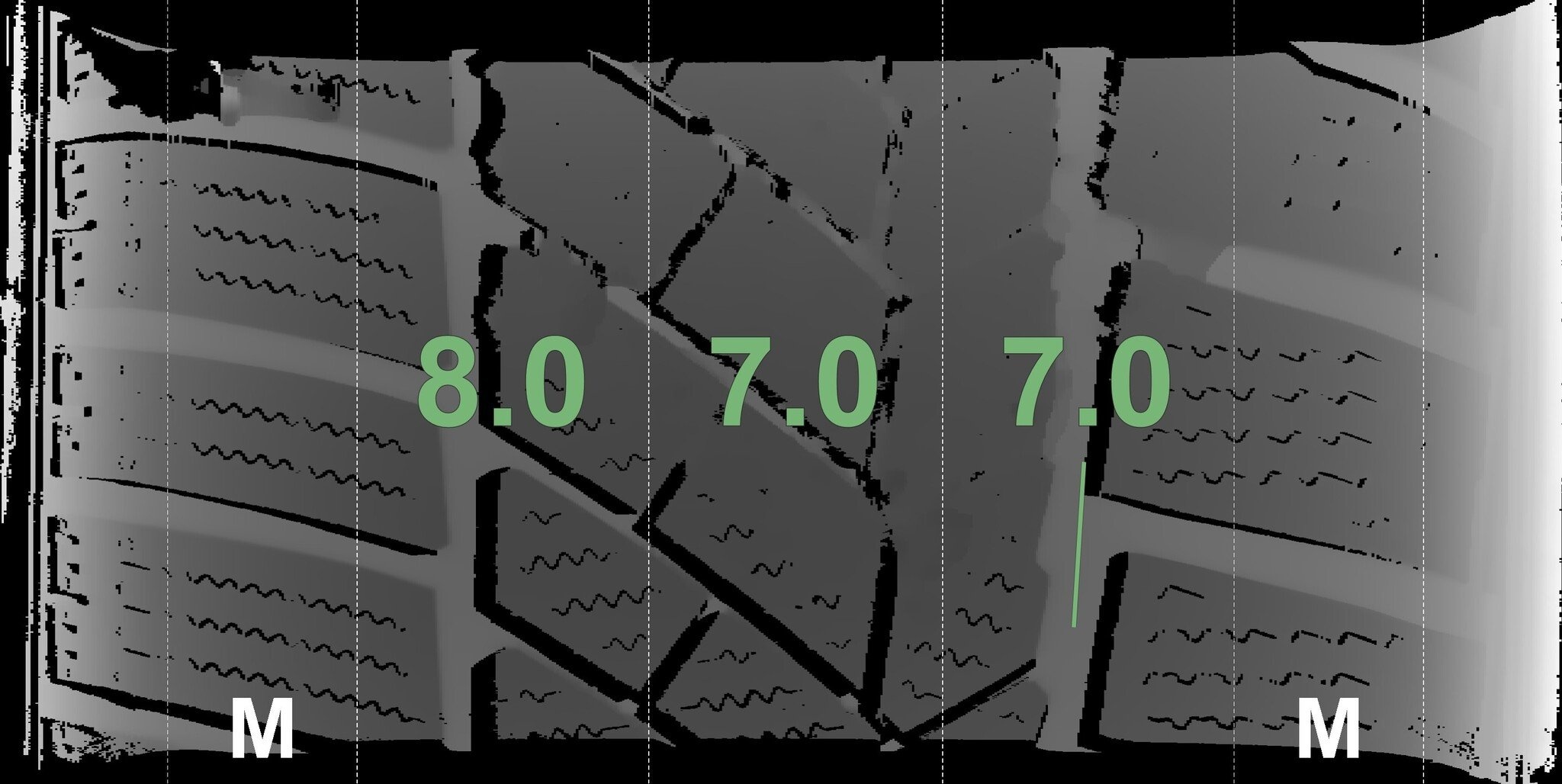 | Zustand | Profiltiefe | DOT | Vorderachse Links | Gebraucht | 6.8 mm | 3821 |