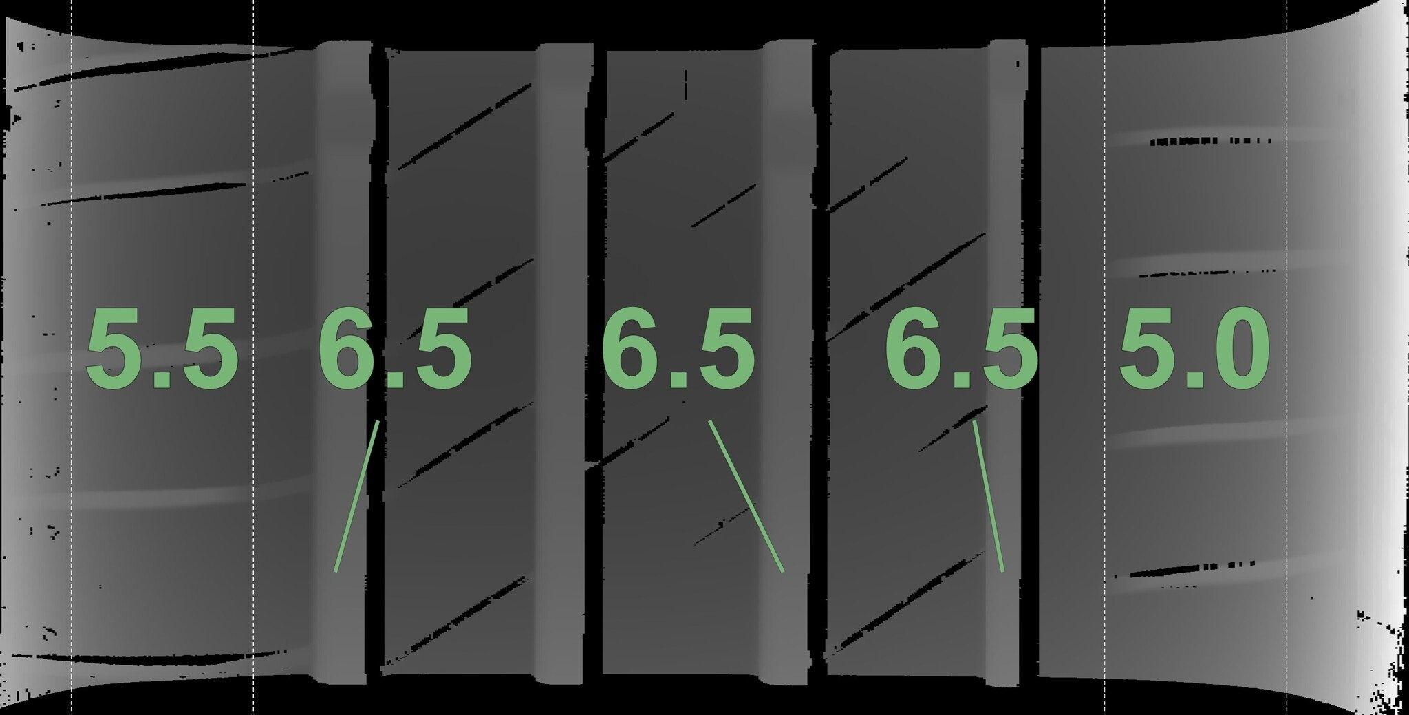 | Zustand | Profiltiefe | DOT | Vorderachse Links | Gebraucht | 6,5 mm | 3324 |