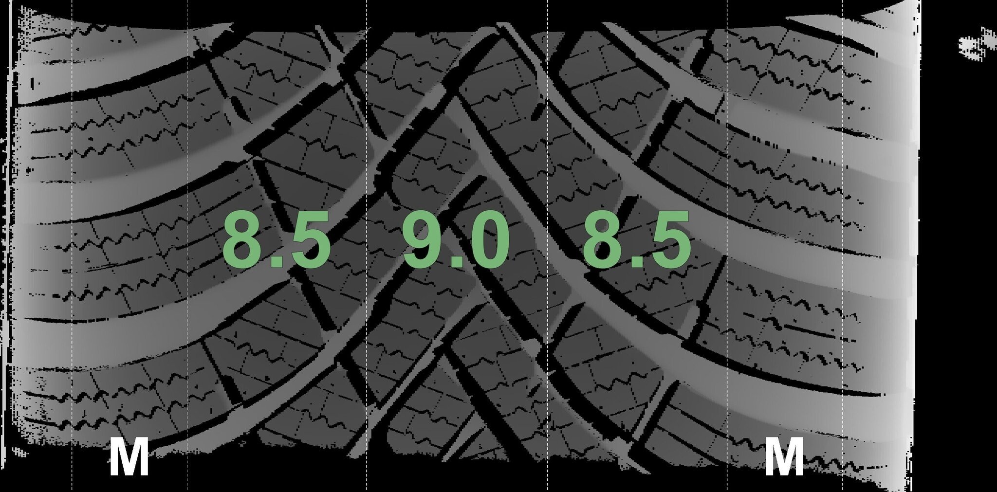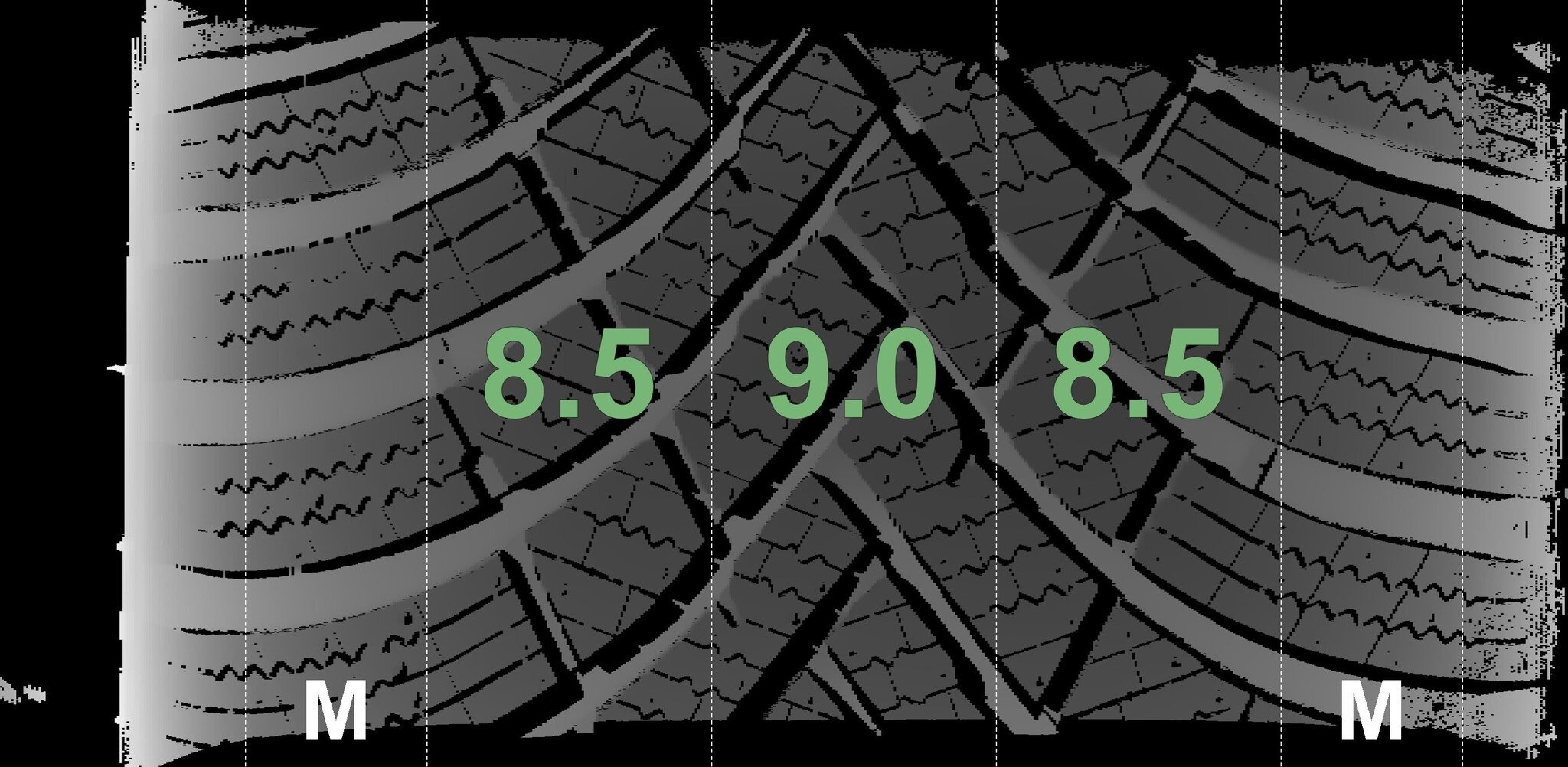 Die gemessenen Profiltiefen und die Details der Felgen sind oben dargestellt.