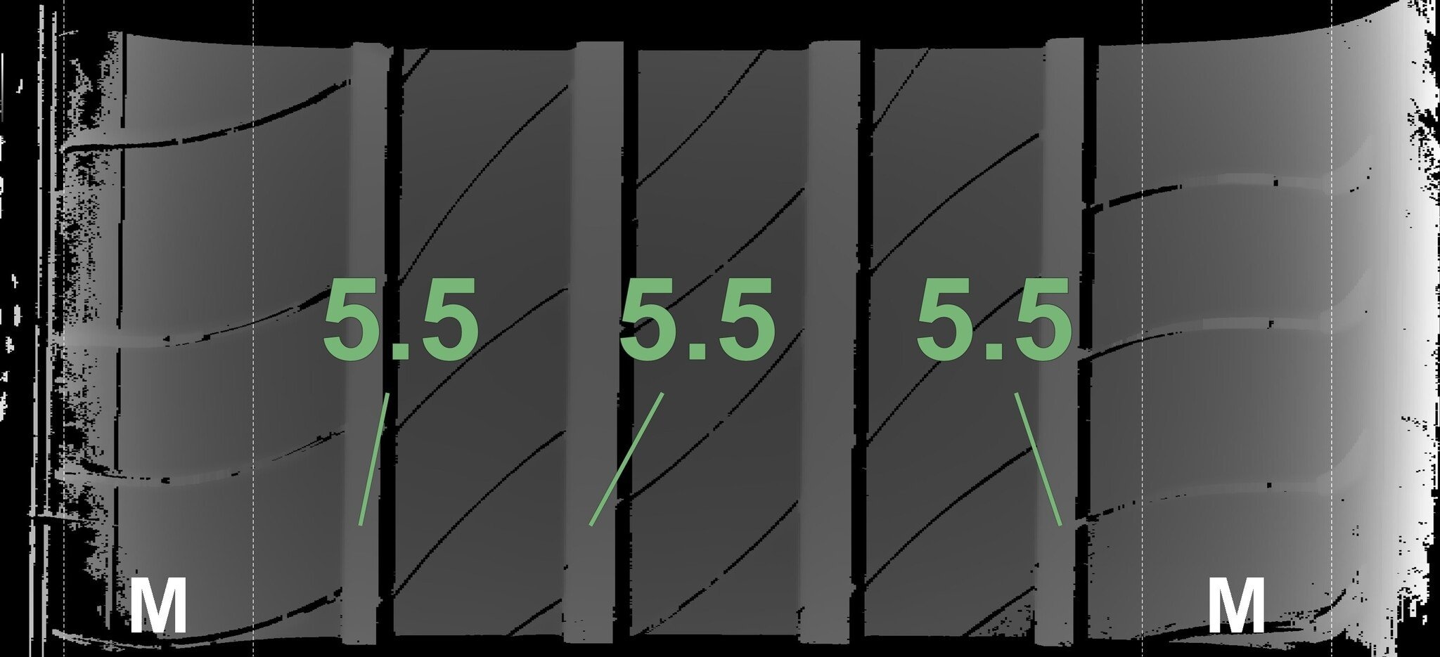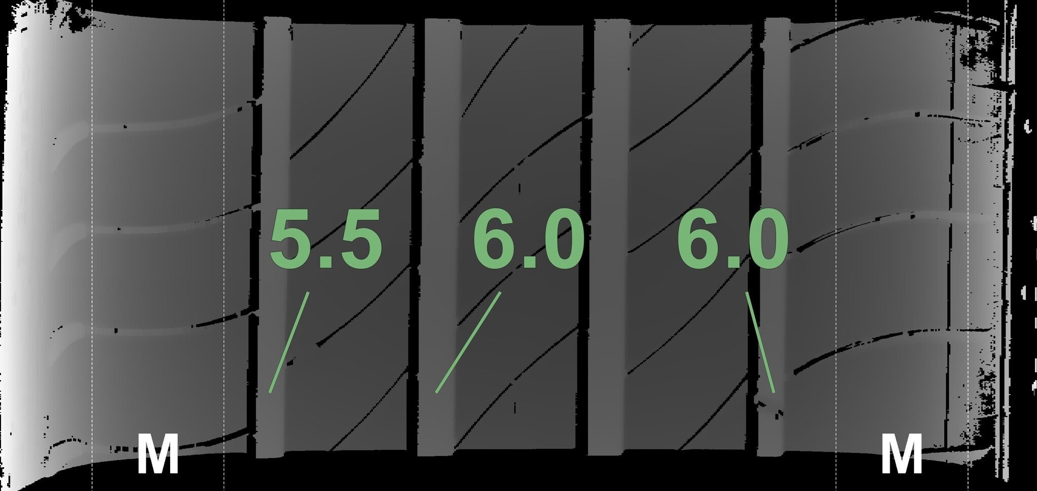 | Zustand | Profiltiefe | DOT | Vorderachse Rechts | Demo-Noppen noch sichtbar | 5.7 mm | 3824 |