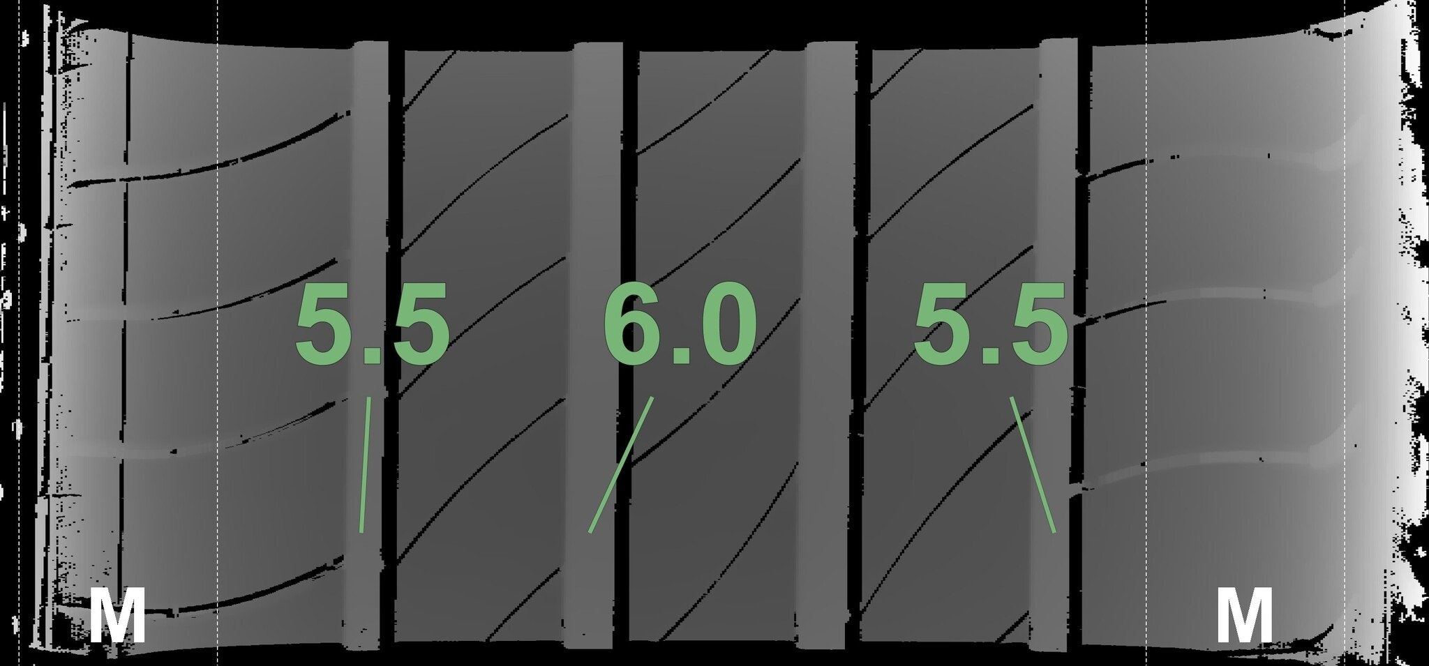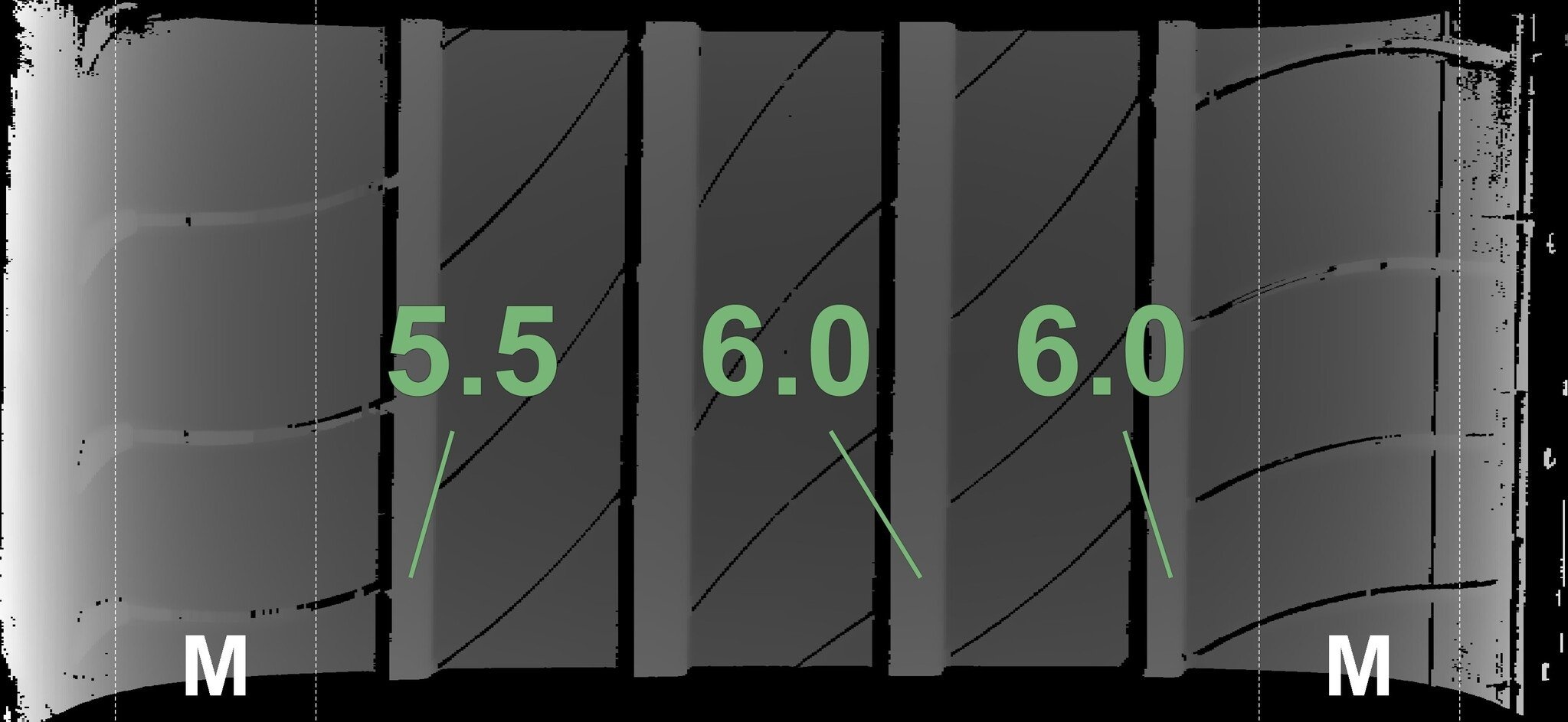 Die gemessenen Profiltiefen und die Details der Felgen sind oben angezeigt.