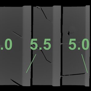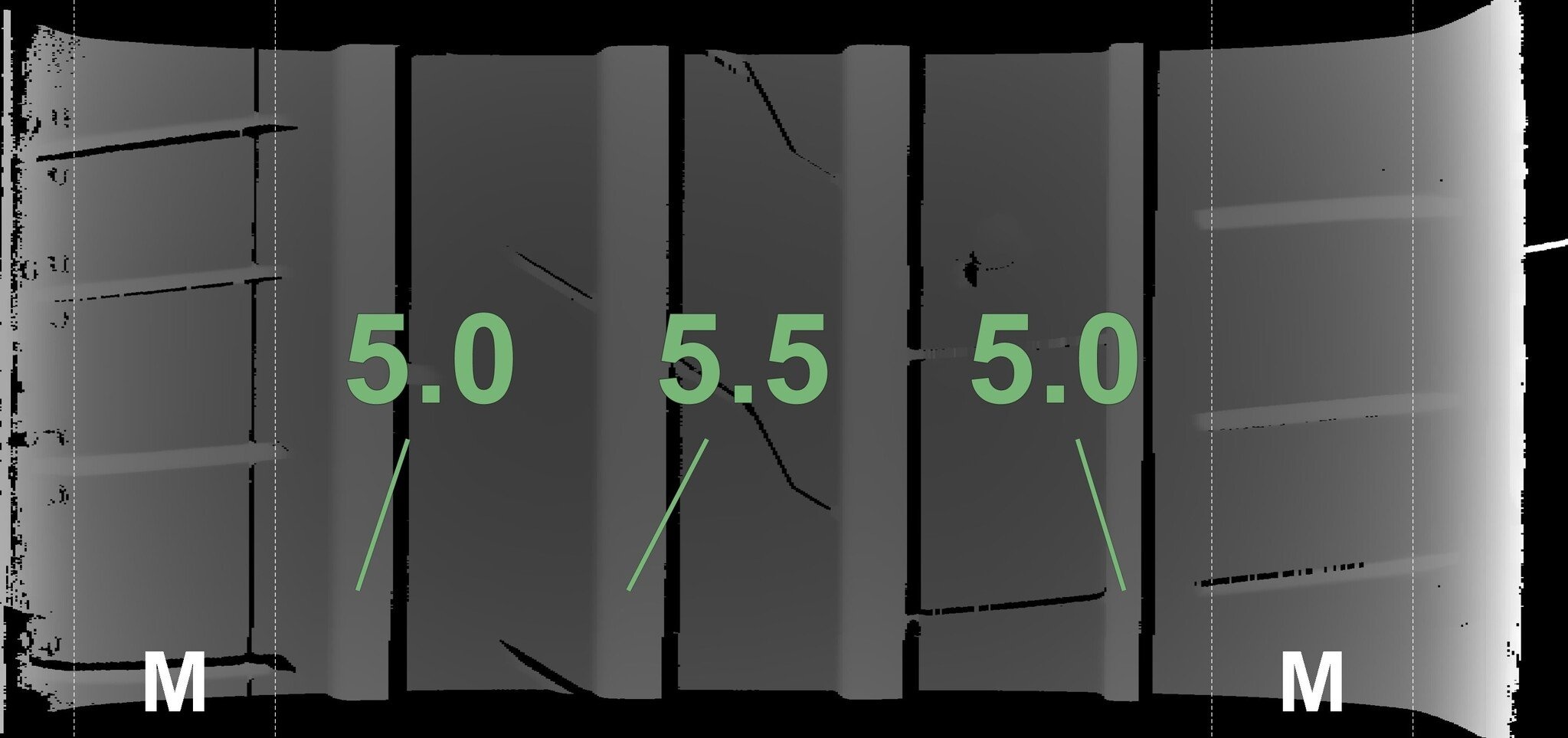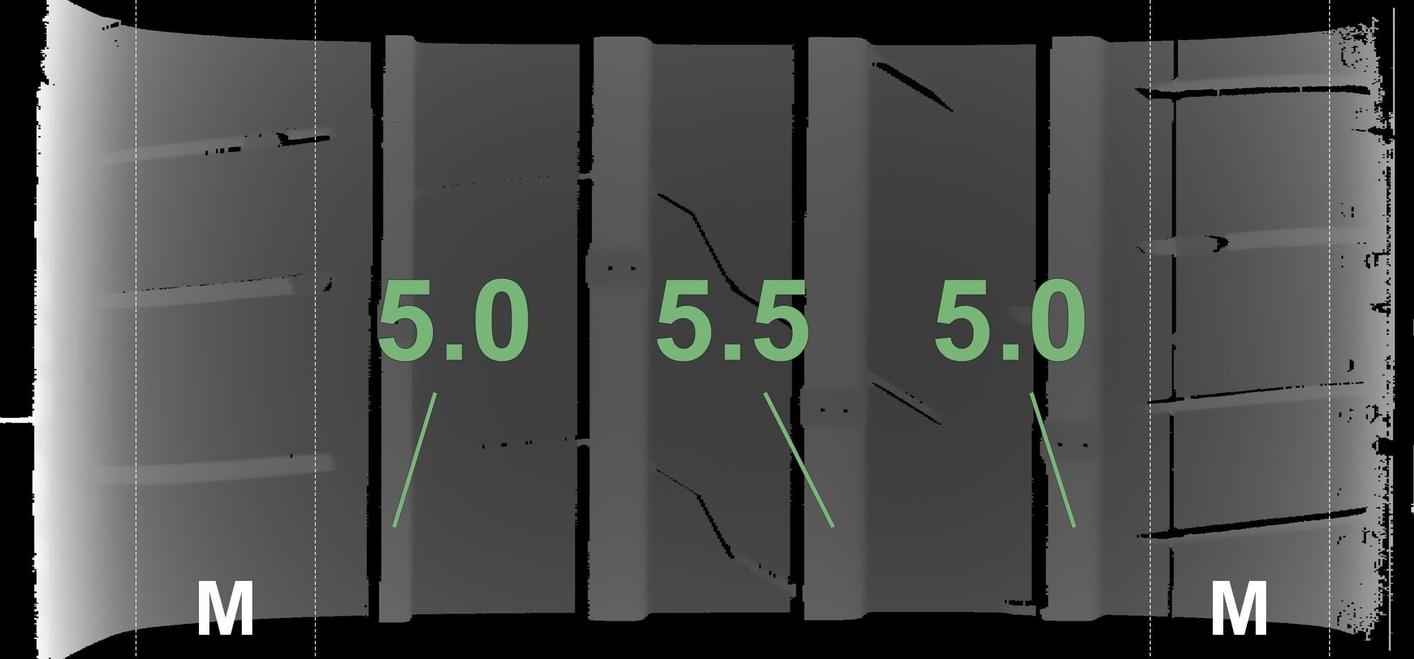 Die gemessenen Profiltiefen und Details der Felgen sind oben dargestellt.
