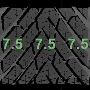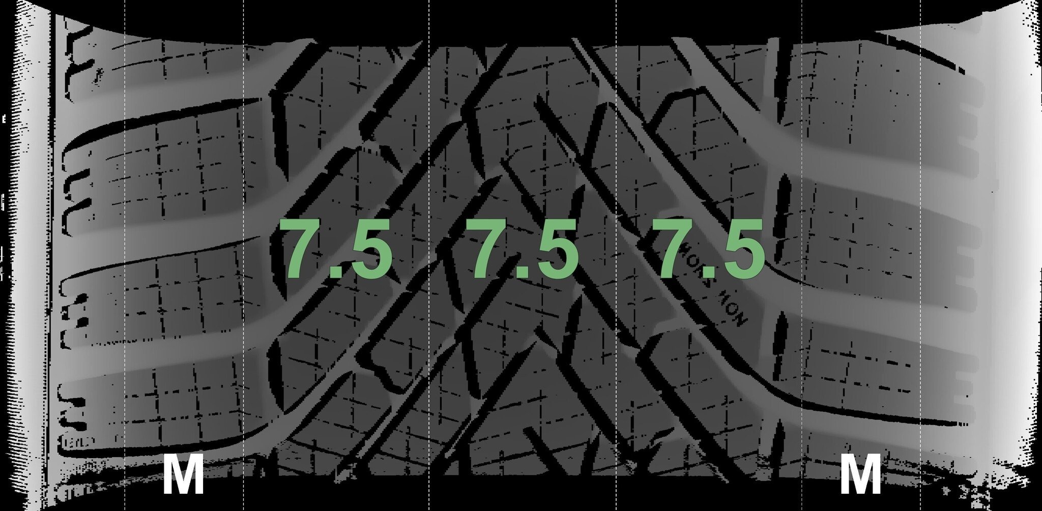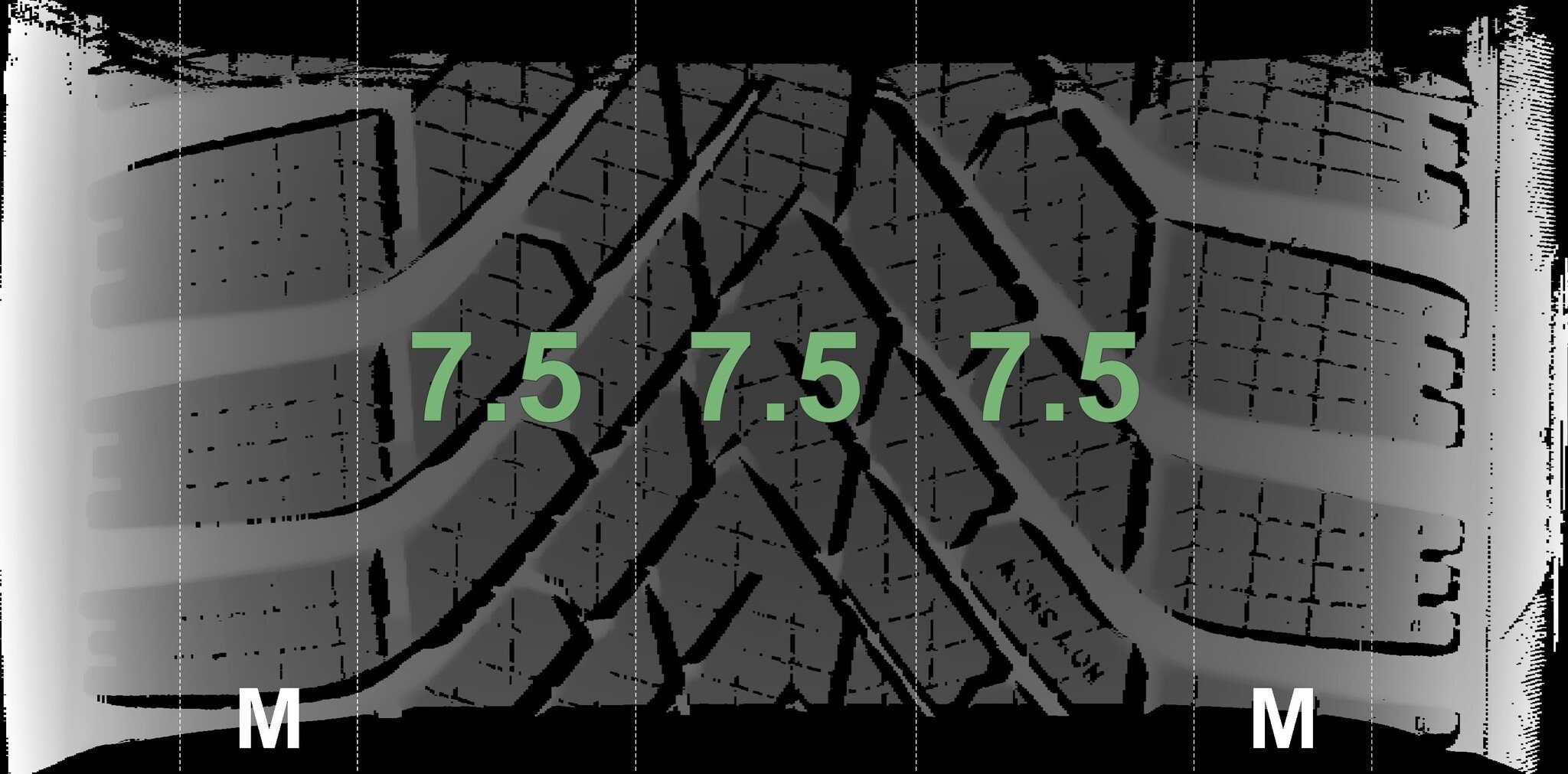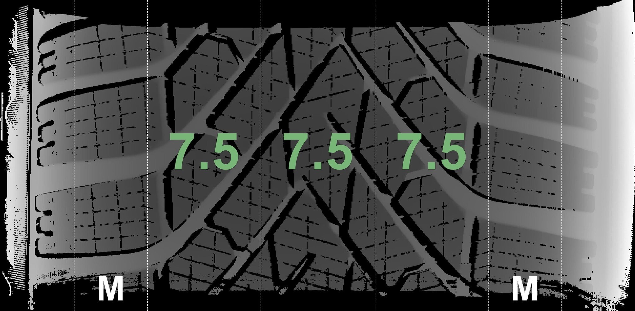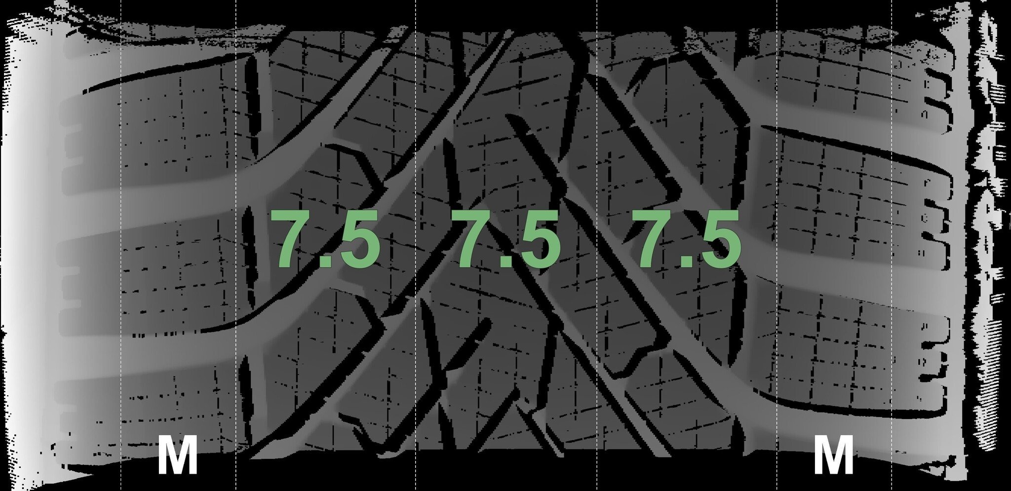 | Zustand | Profiltiefe | DOT | Vorderachse Links | Neu | 7.5 mm | 4025 |