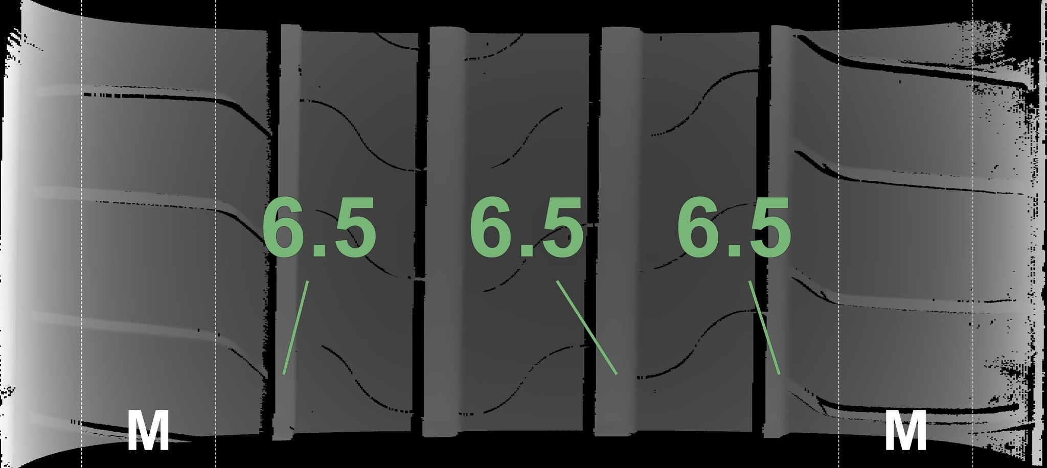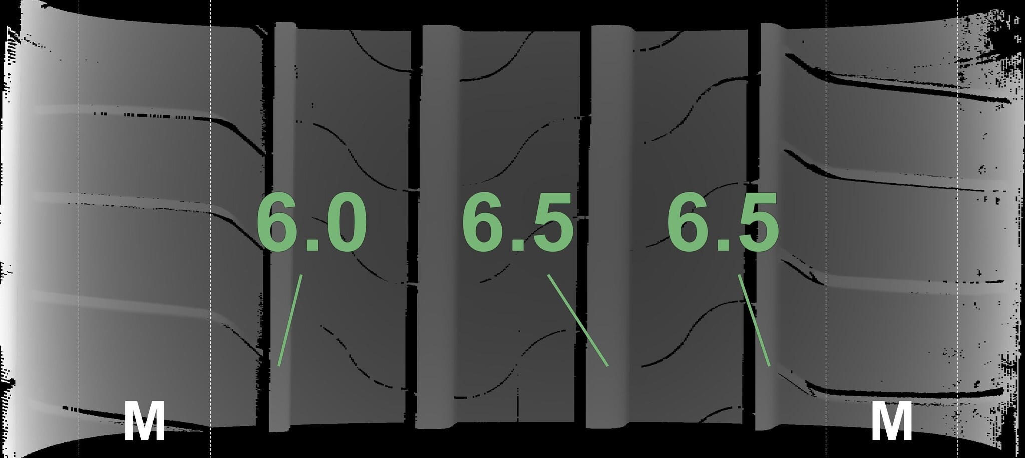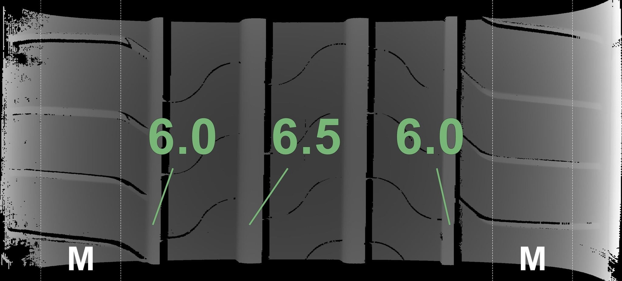 Die gemessenen Profiltiefen und Details der Felgen sind oben gezeigt.