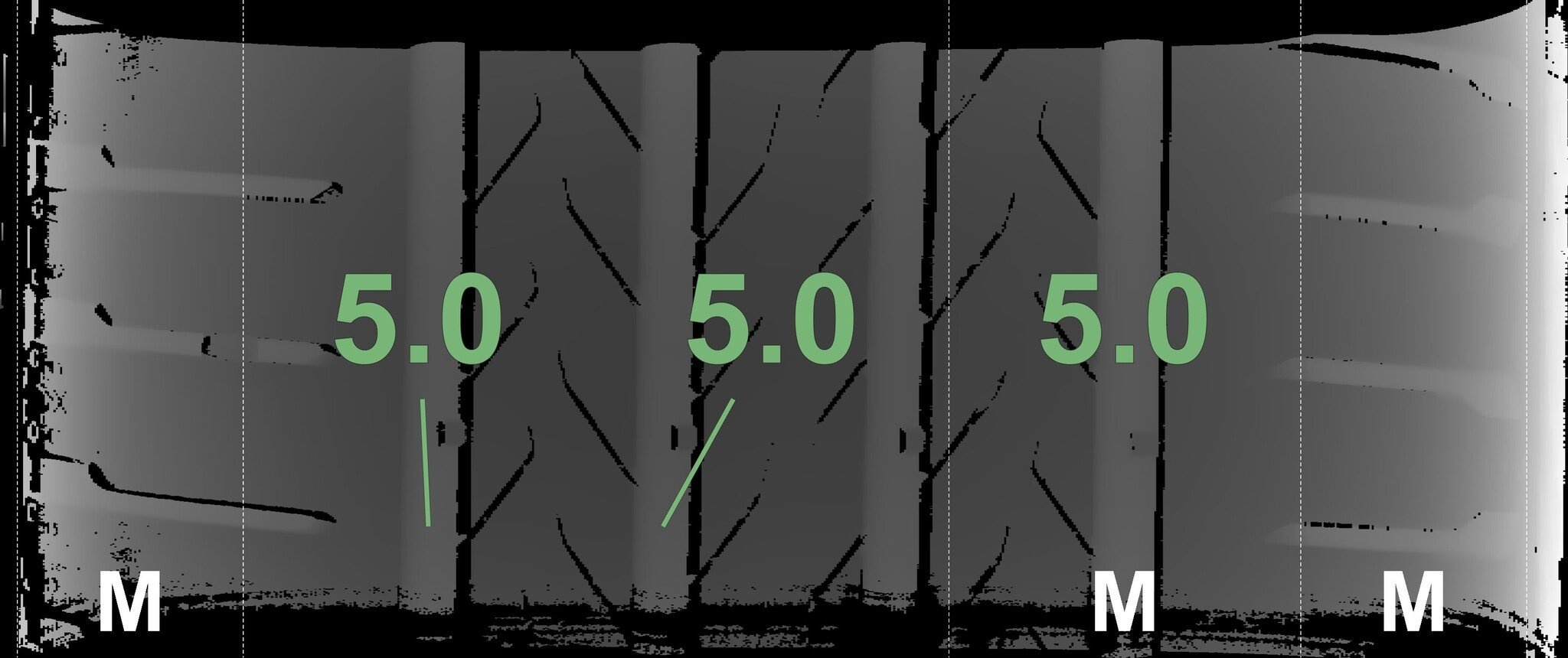 | Zustand | Profiltiefe | DOT | Vorderachse Links | Gebraucht | 5,2 mm | 1624 |