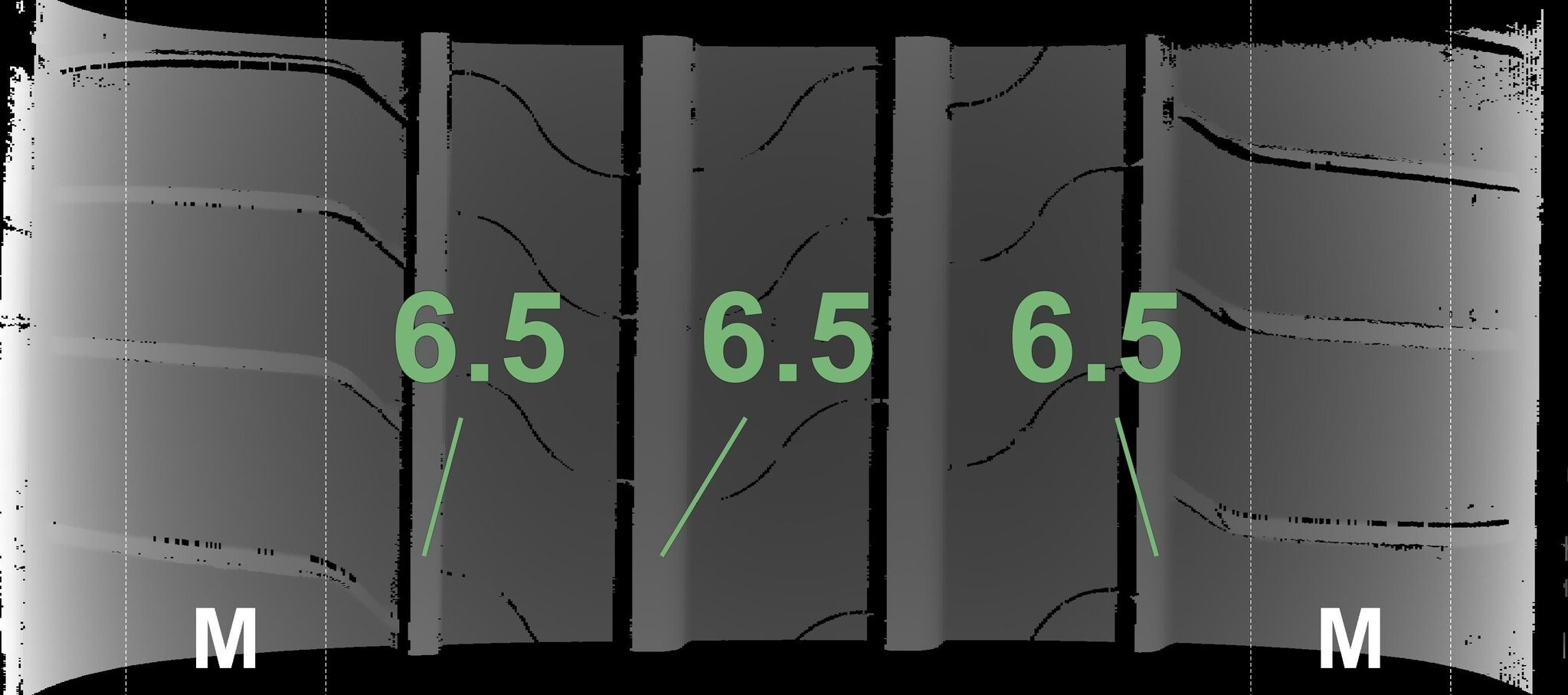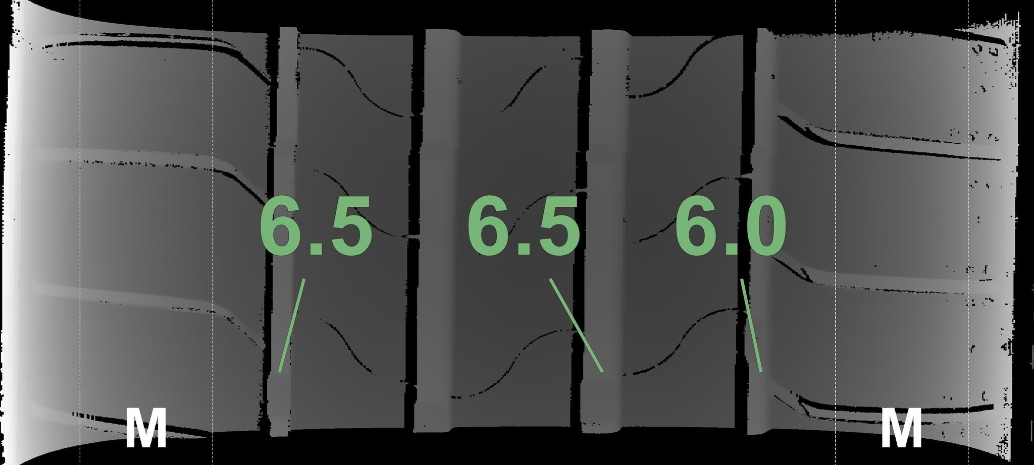 Die gemessenen Profiltiefen und Details der Felgen sind oben gezeigt.