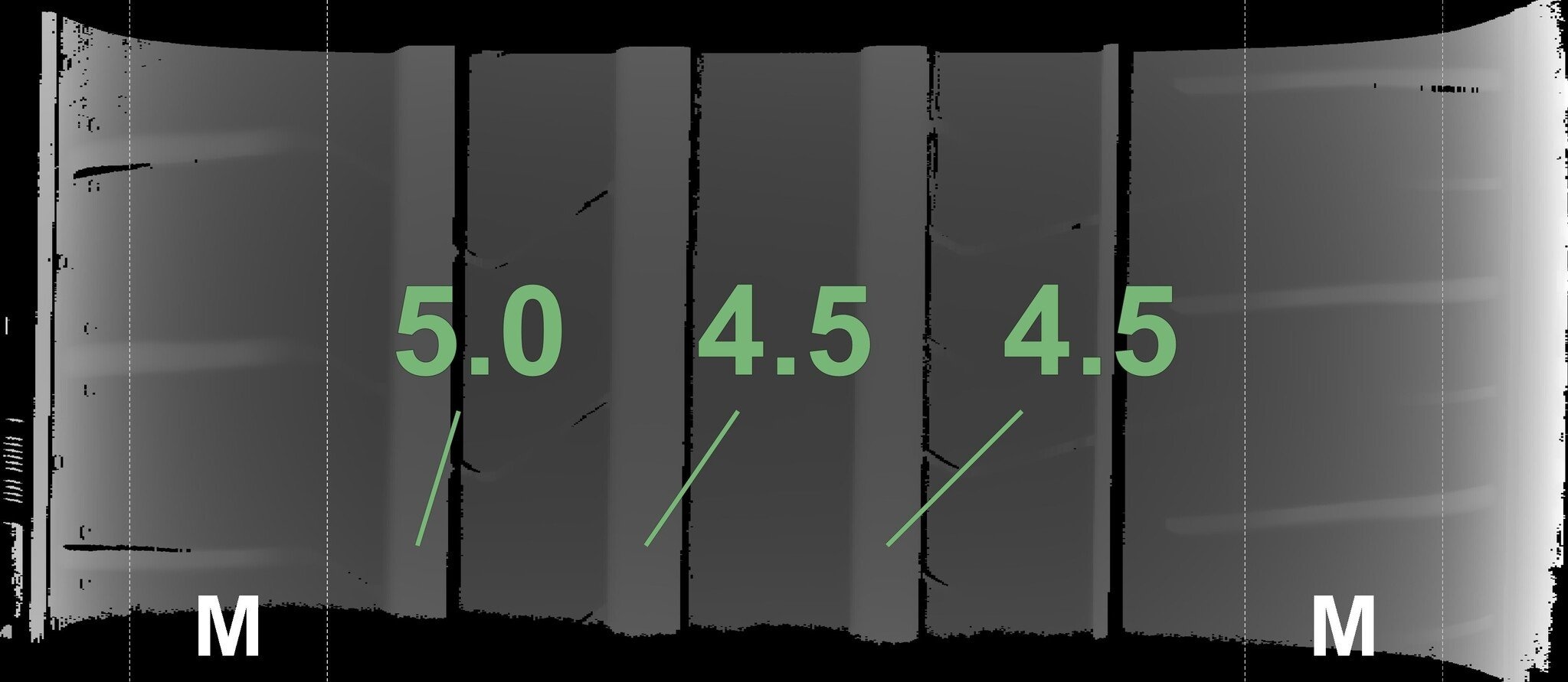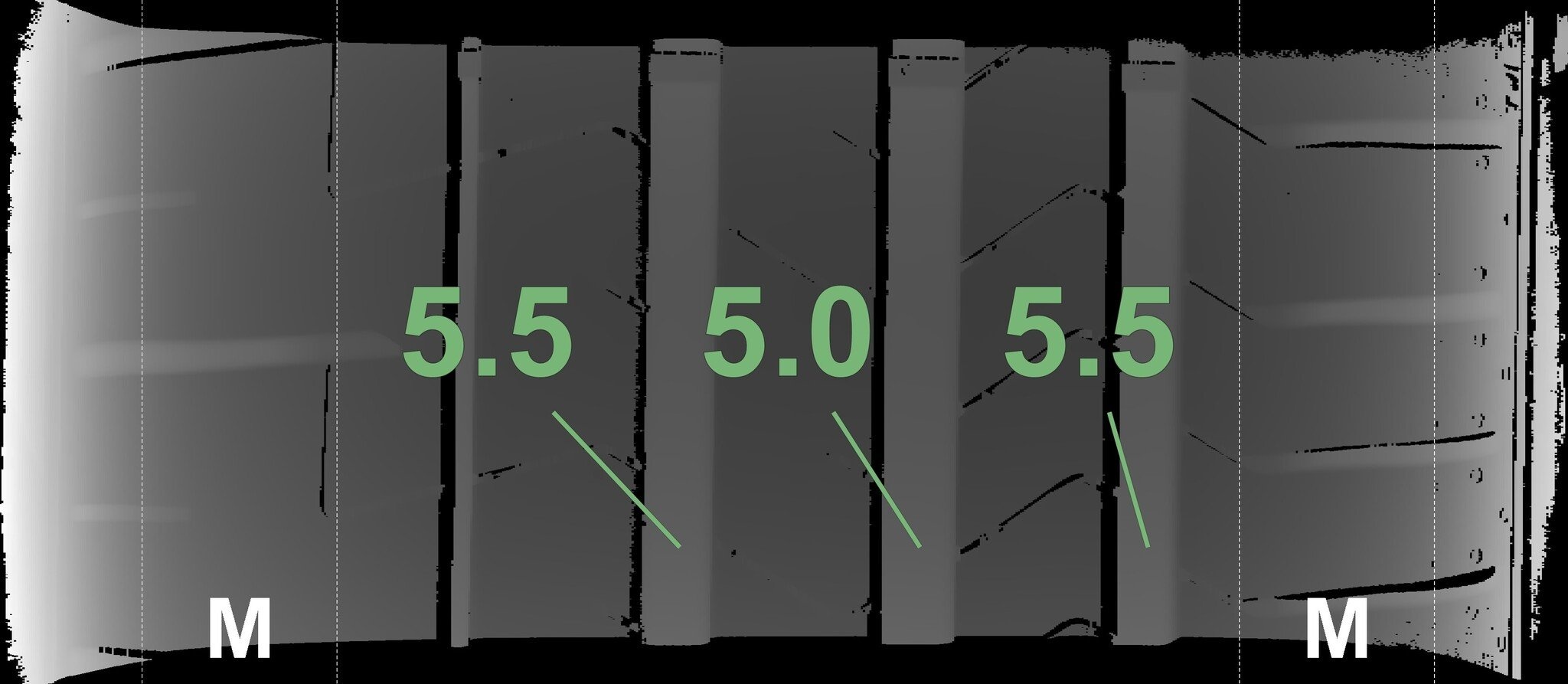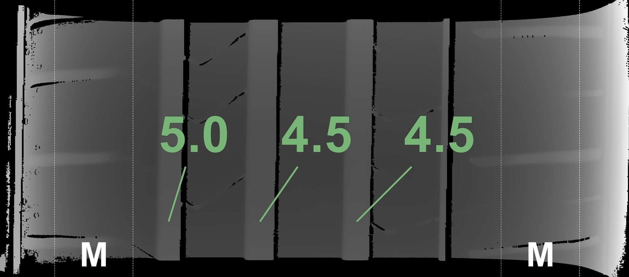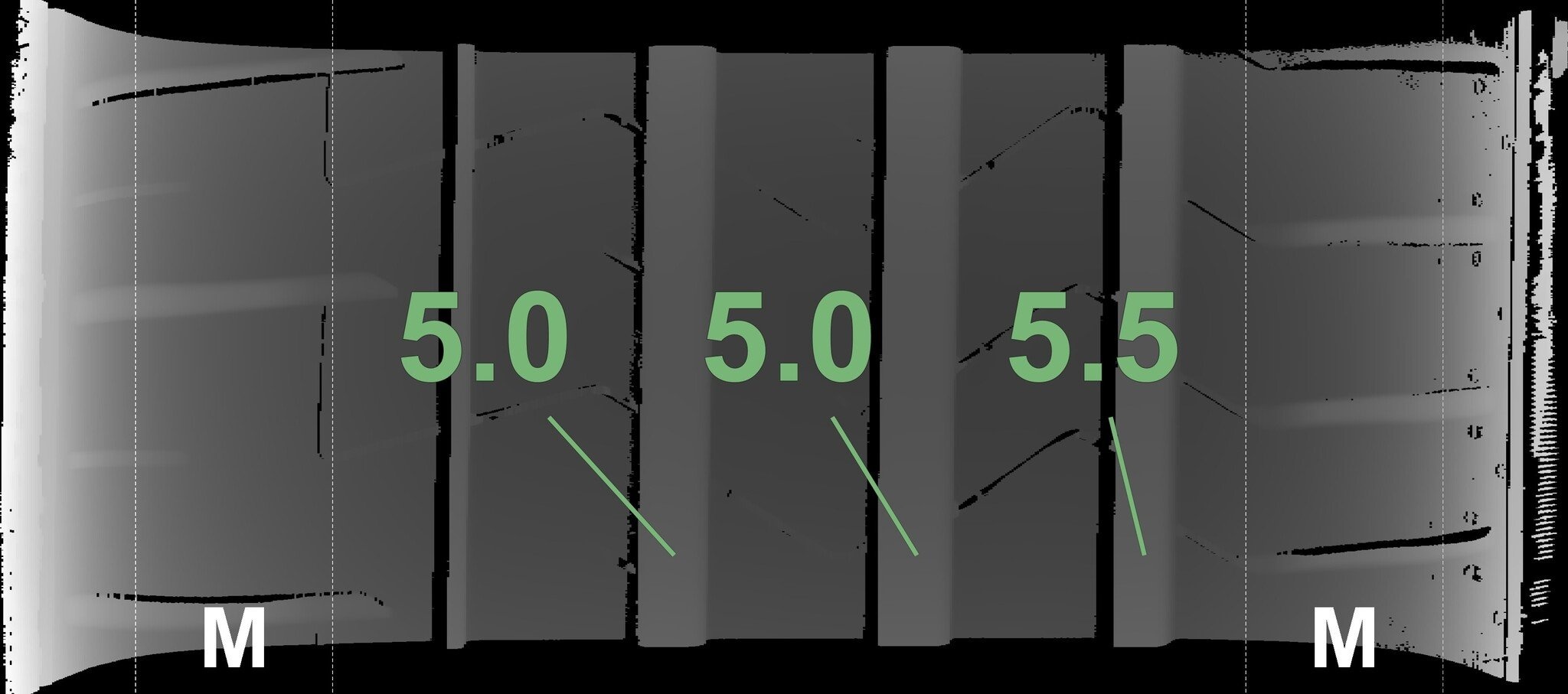 Die gemessenen Profiltiefen und die Details der Felgen sind oben angezeigt.