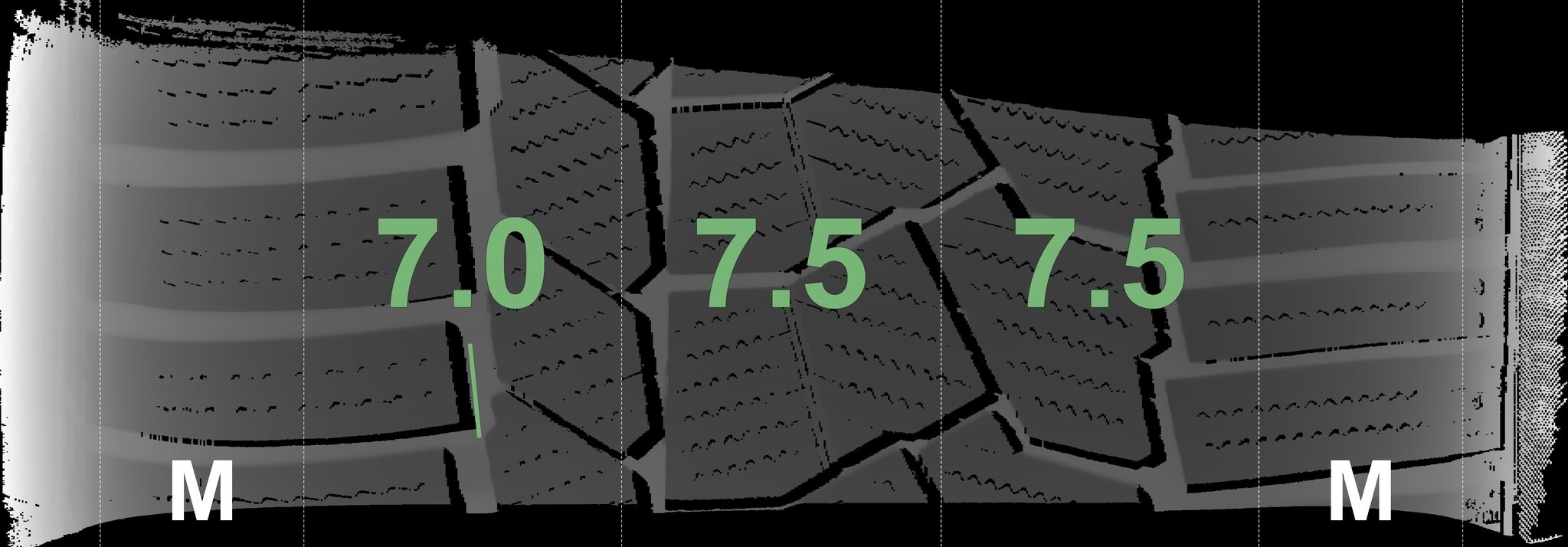 Die gemessenen Profiltiefen und die Details der Felgen sind oben dargestellt.
