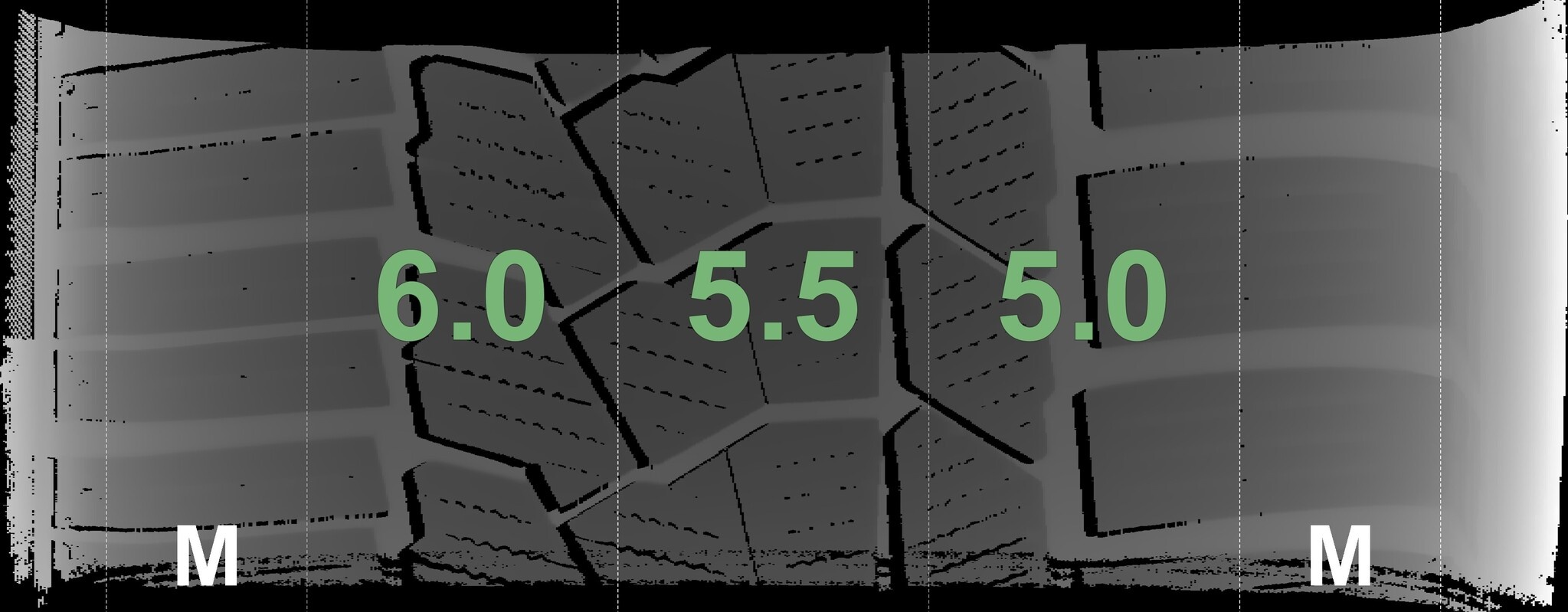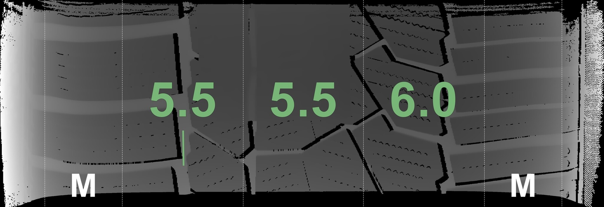 Die gemessenen Profiltiefen und die Details der Felgen sind oben dargestellt.