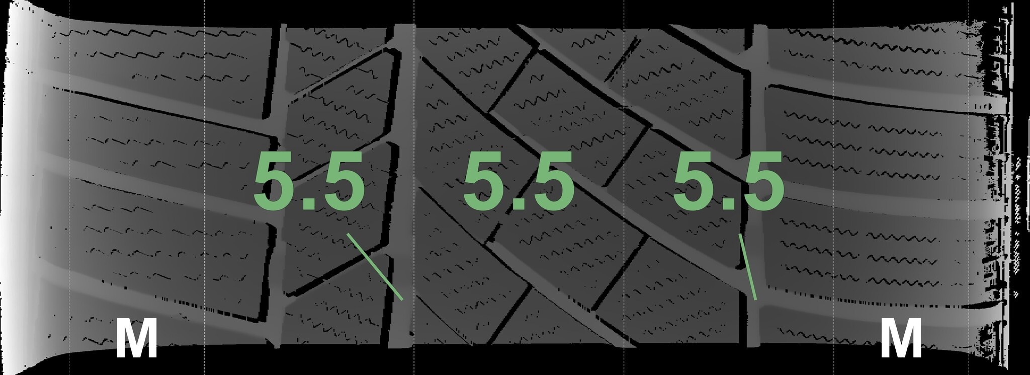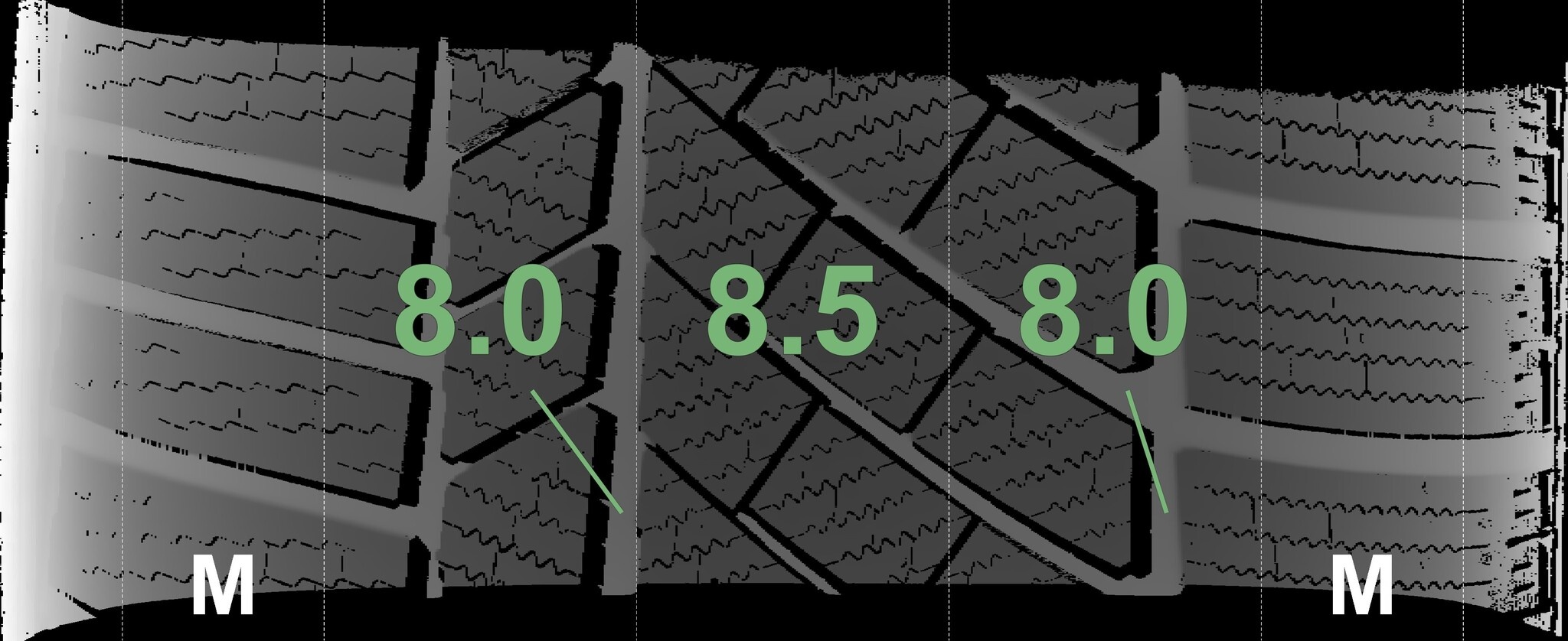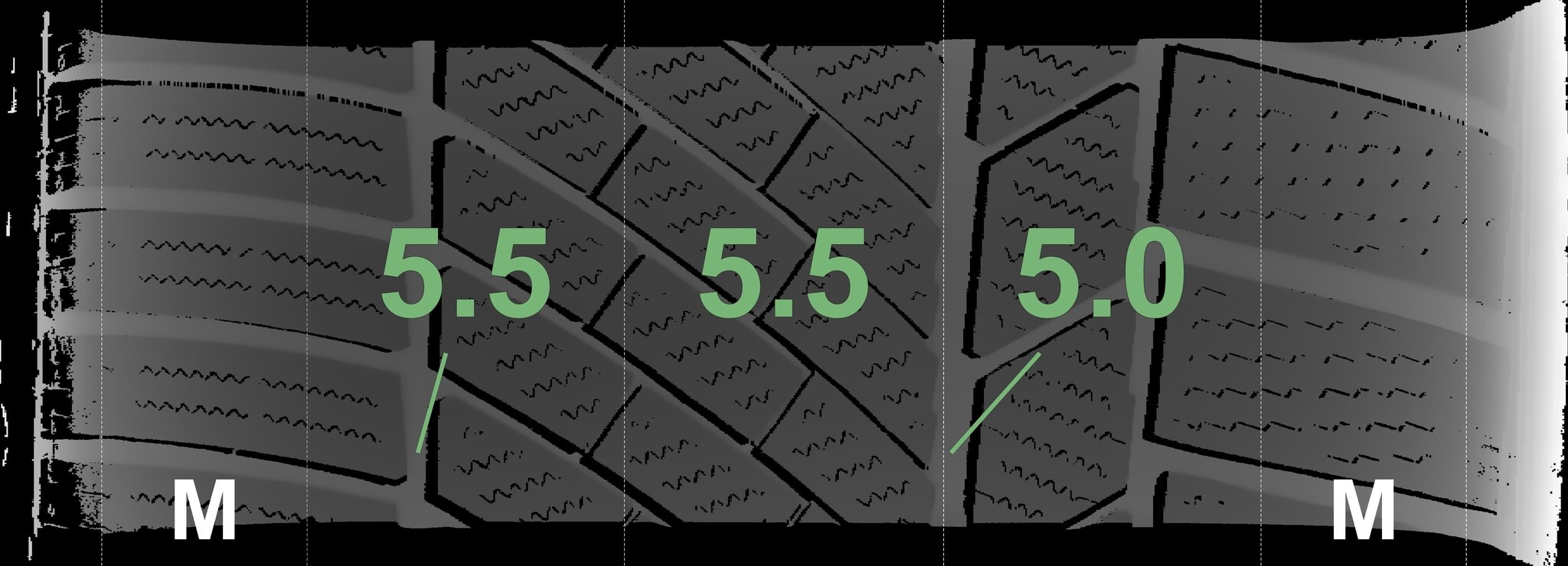 | Zustand | Profiltiefe | DOT | Vorderachse Links | Neu | 8,0 mm | 3325 |