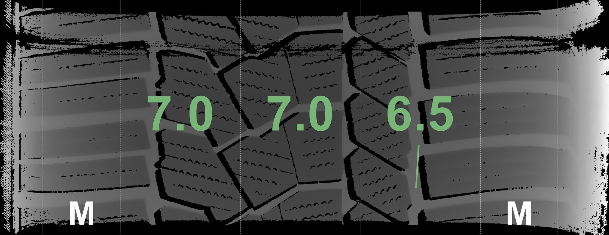 Zustand | Profiltiefe | DOT | Vorderachse Links | Gebraucht | 6,5 mm | 3720 |