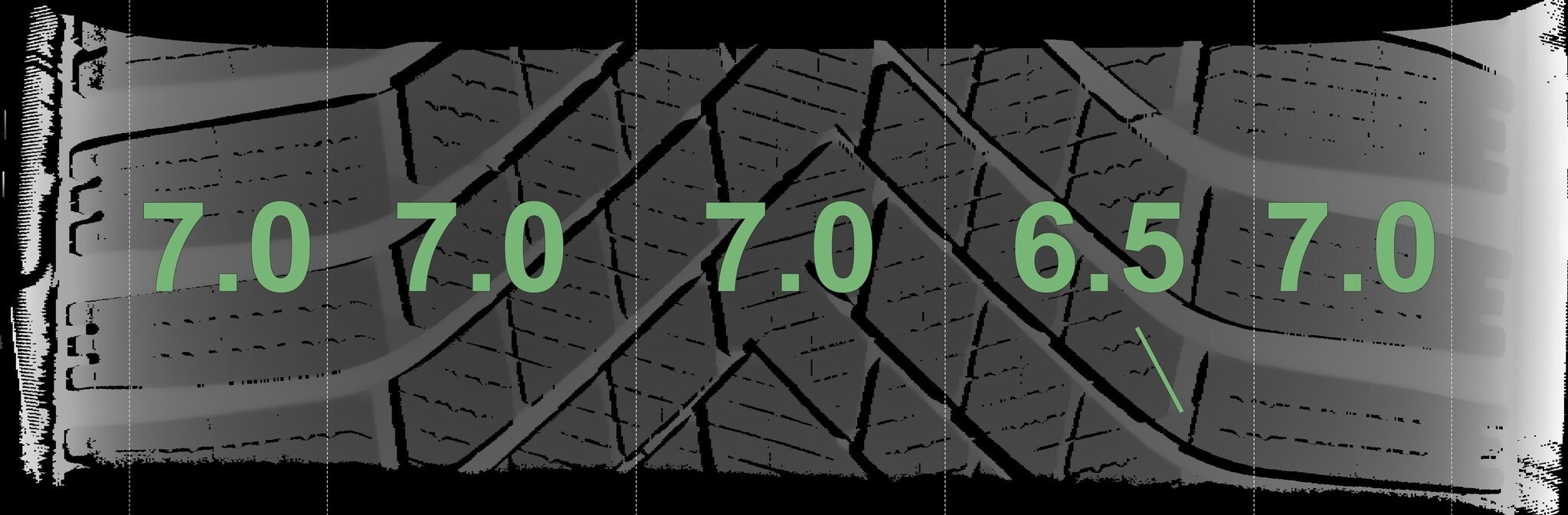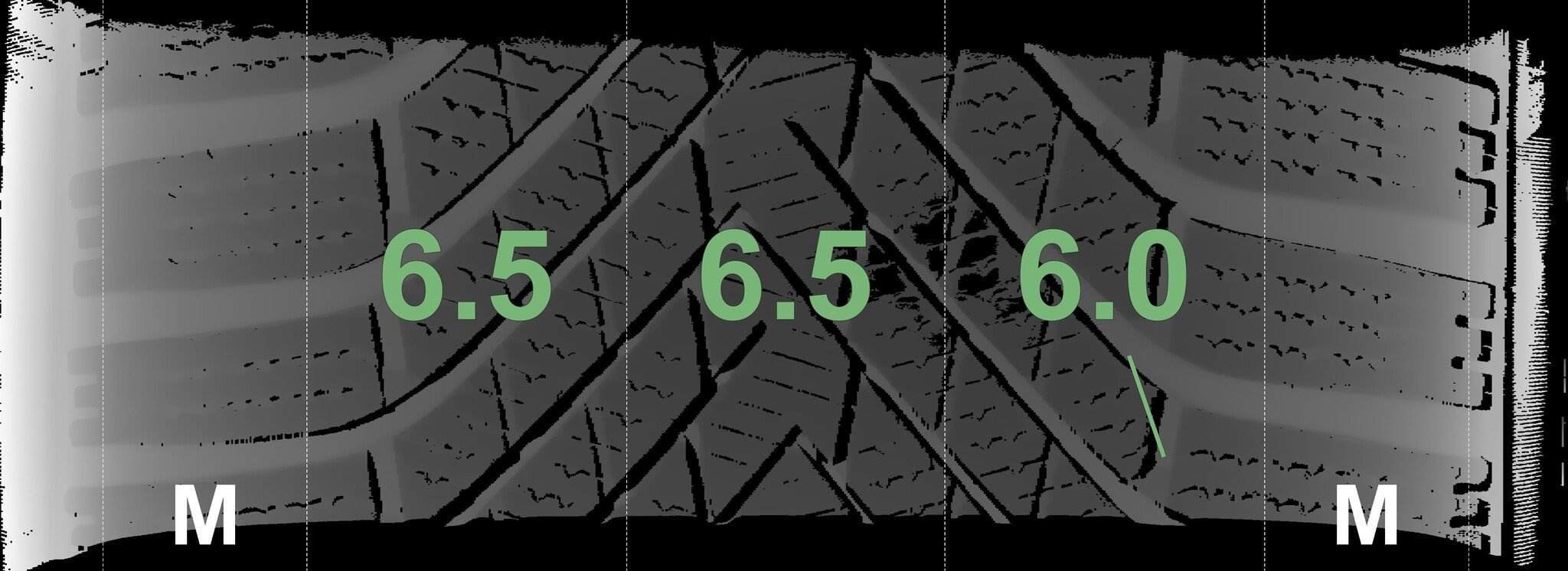 | Zustand | Profiltiefe | DOT | Vorderachse Links | Gebraucht | 6,0 mm | 0624 |