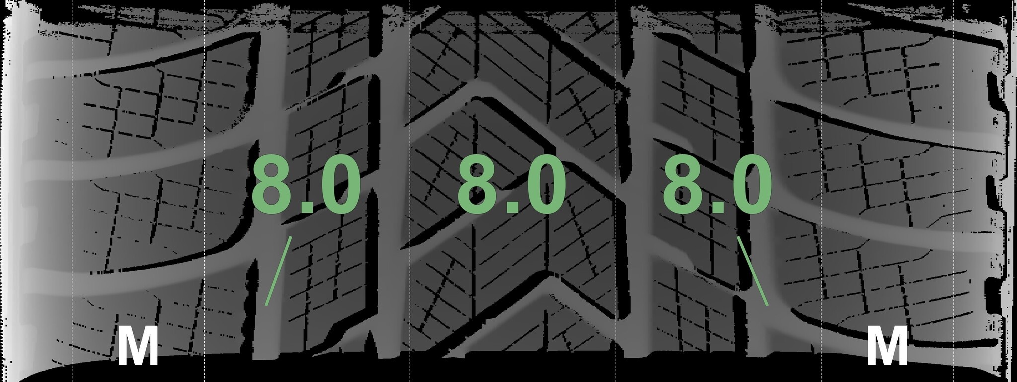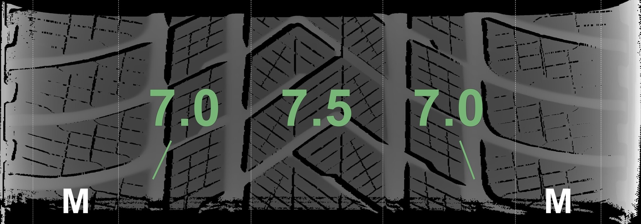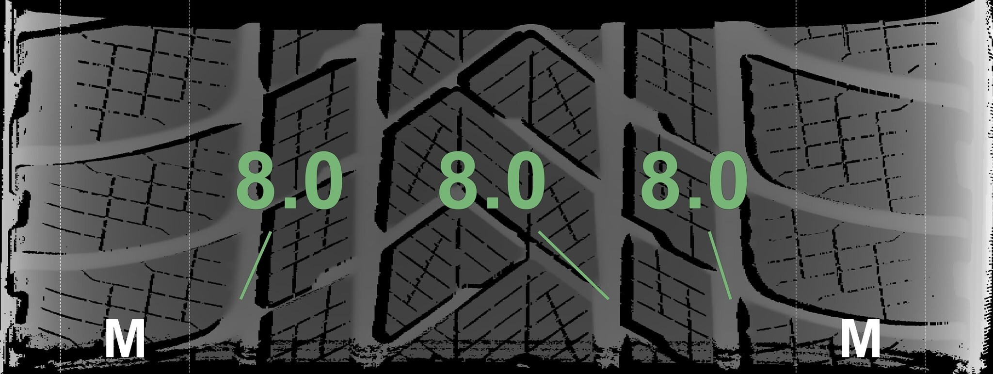 | Zustand | Profiltiefe | DOT | Vorderachse Rechts | Demo-Noppen noch sichtbar | 8.0 mm | 3425 |