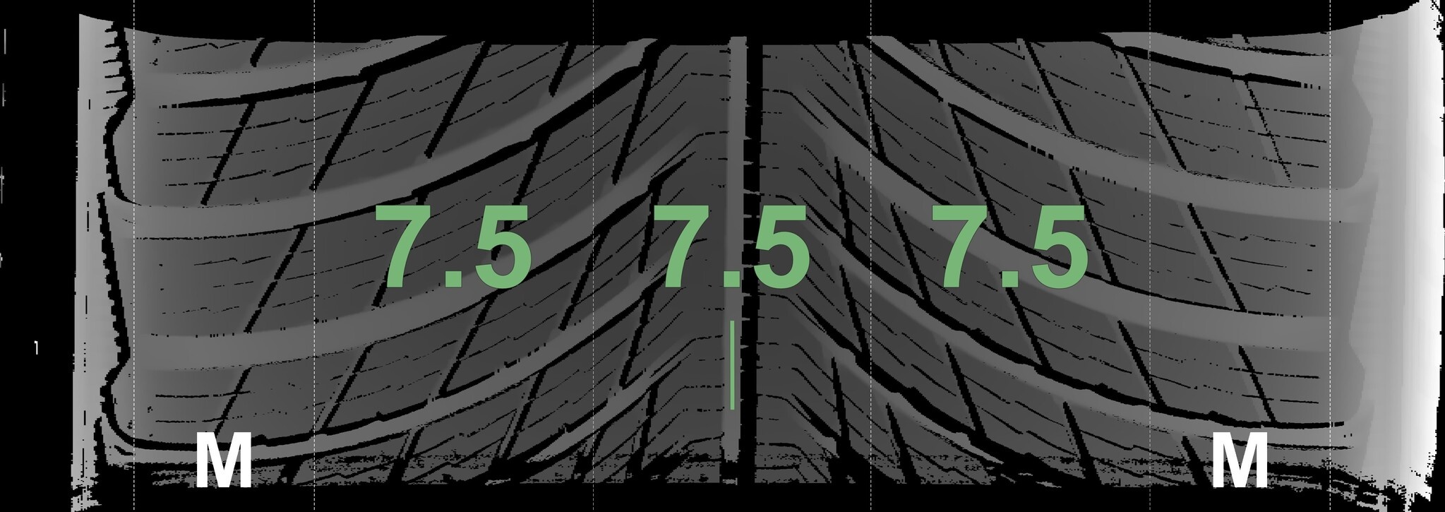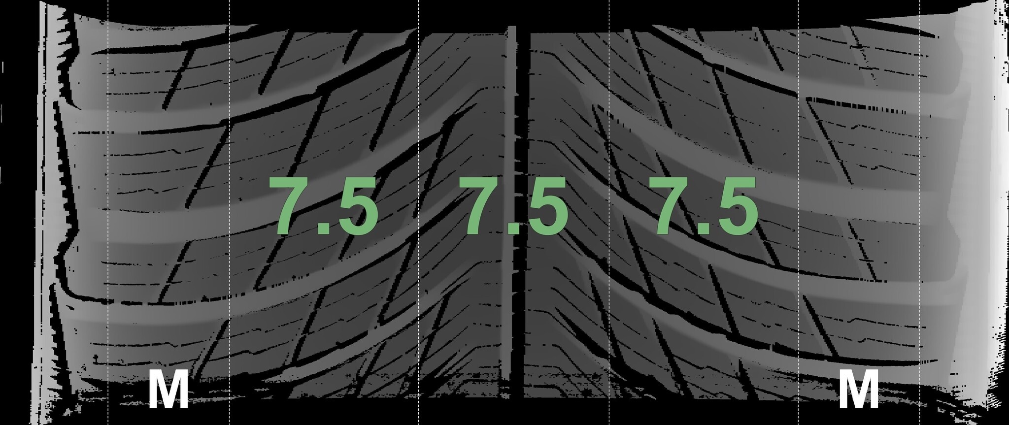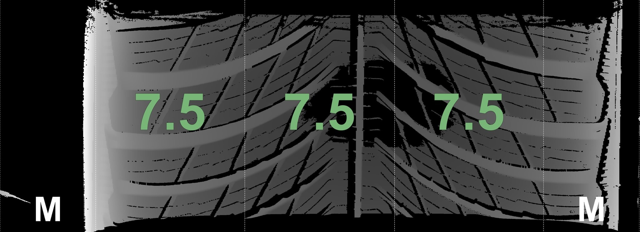 | Zustand | Profiltiefe | DOT | Vorderachse Links | Neu | 7.5 mm | 4725 |