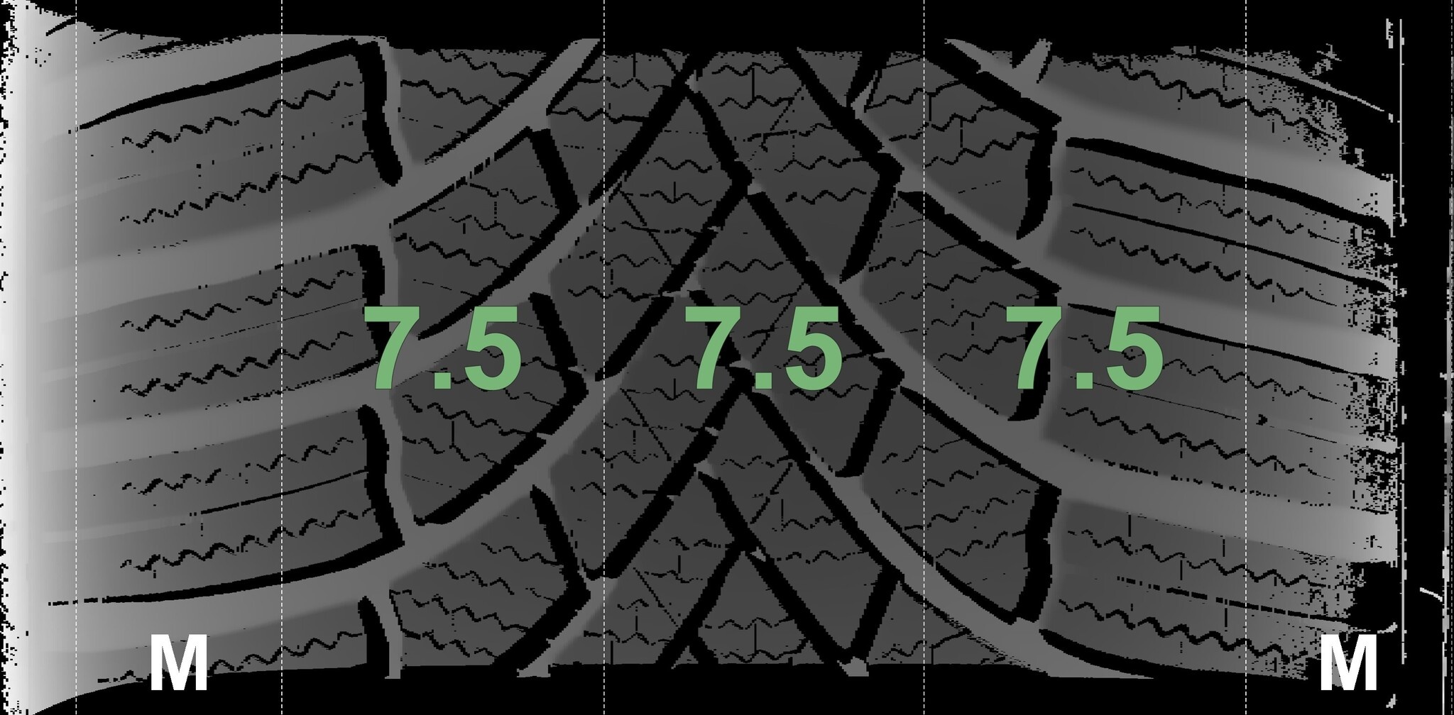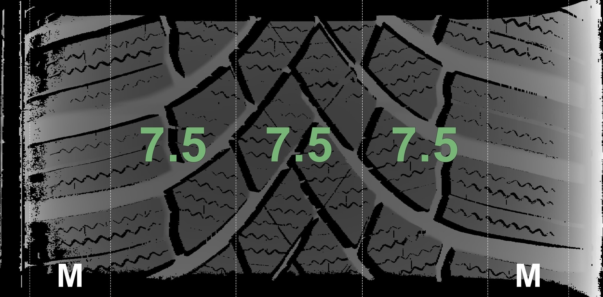 Zustand | Profiltiefe | DOT | Vorderachse Rechts | Demo-Noppen noch sichtbar | 7,5 mm | 3524 |
