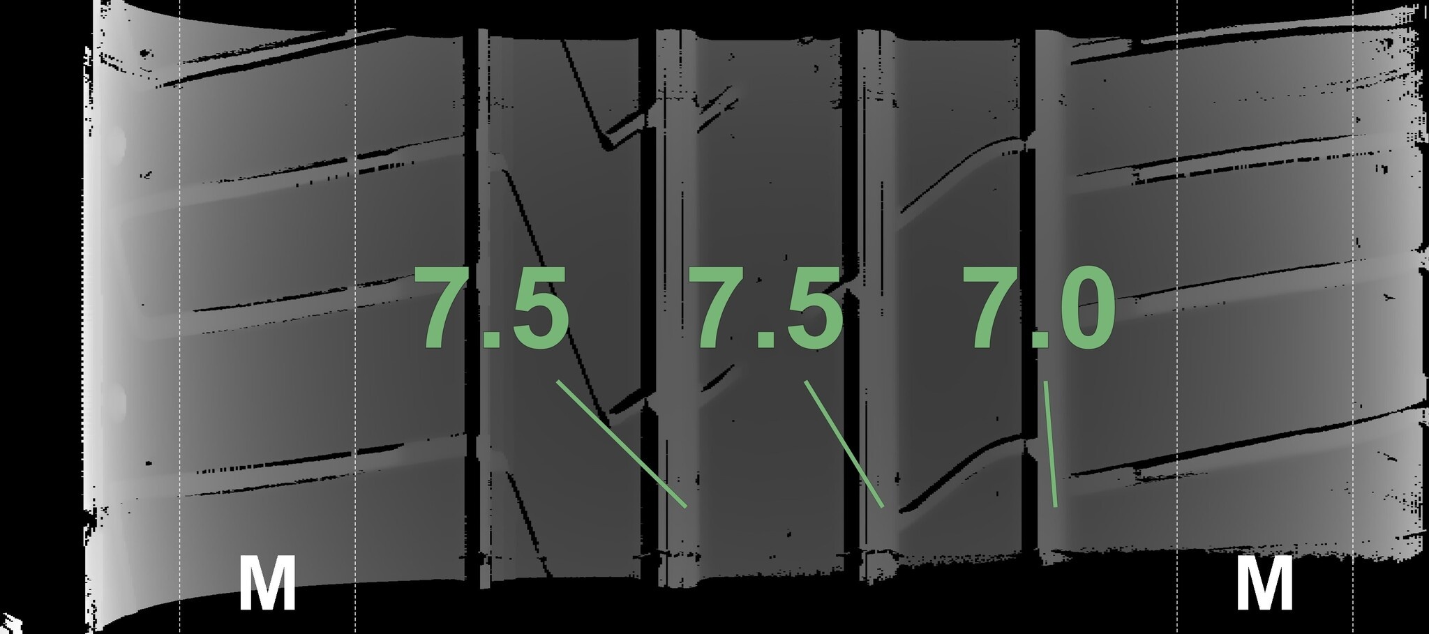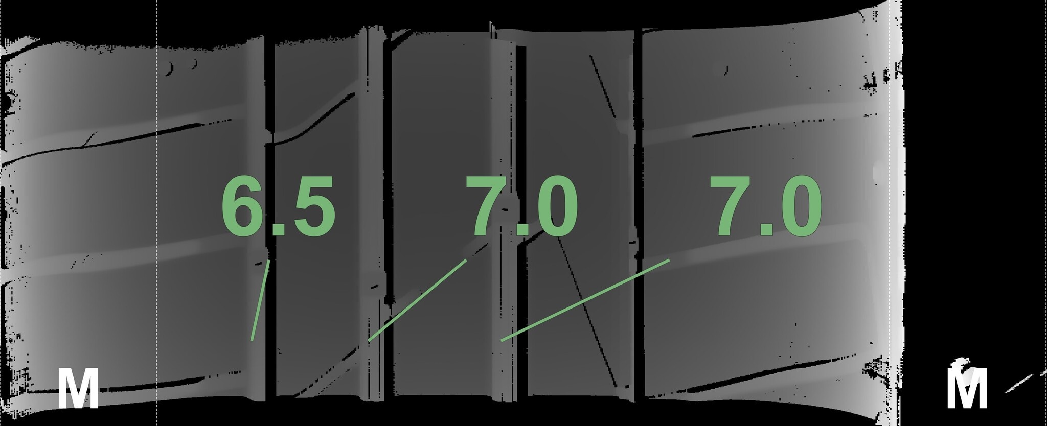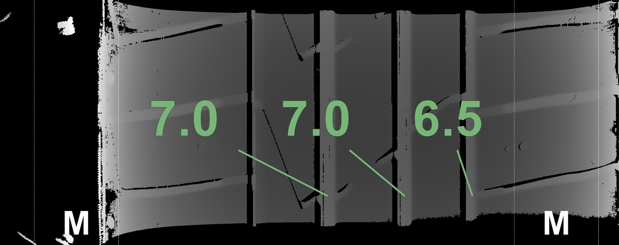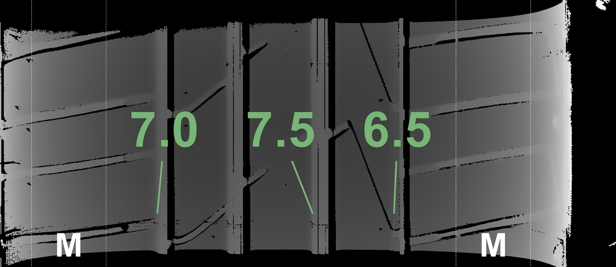 Die gemessenen Profiltiefen und Details der Felgen sind oben dargestellt.