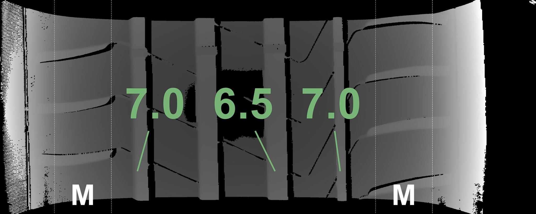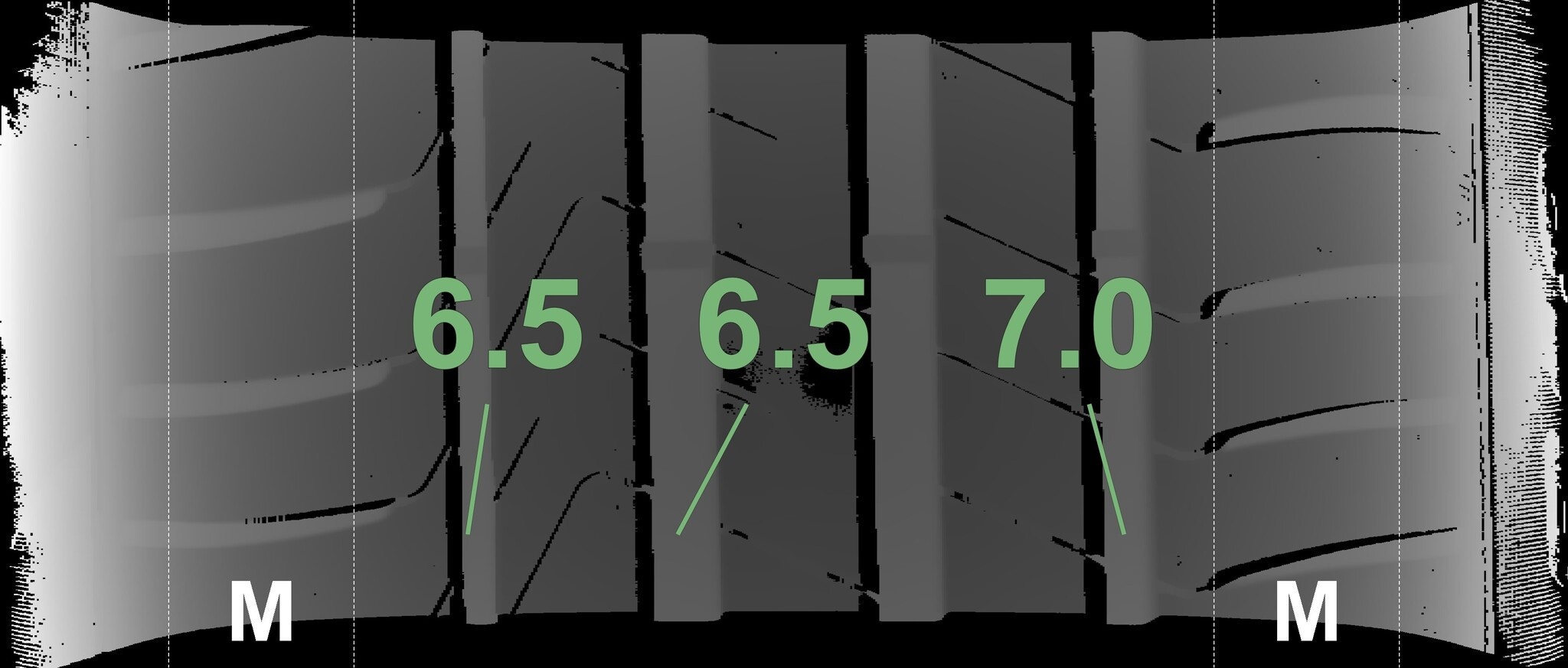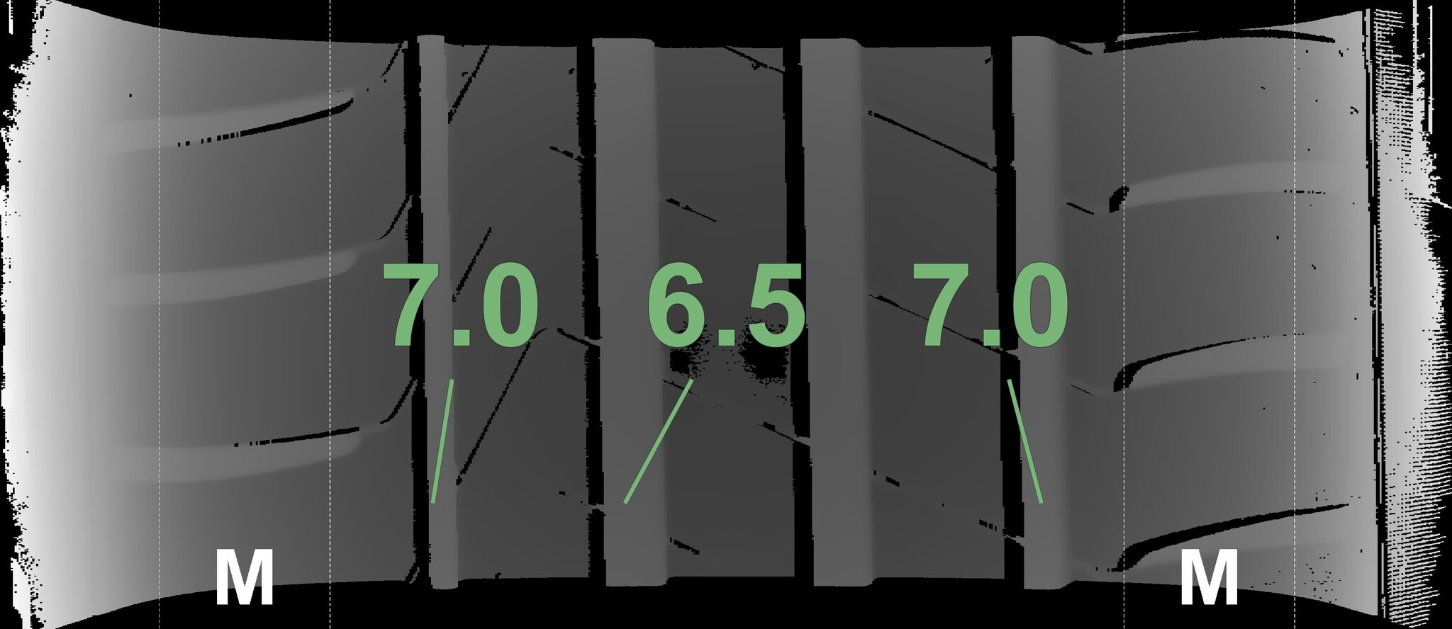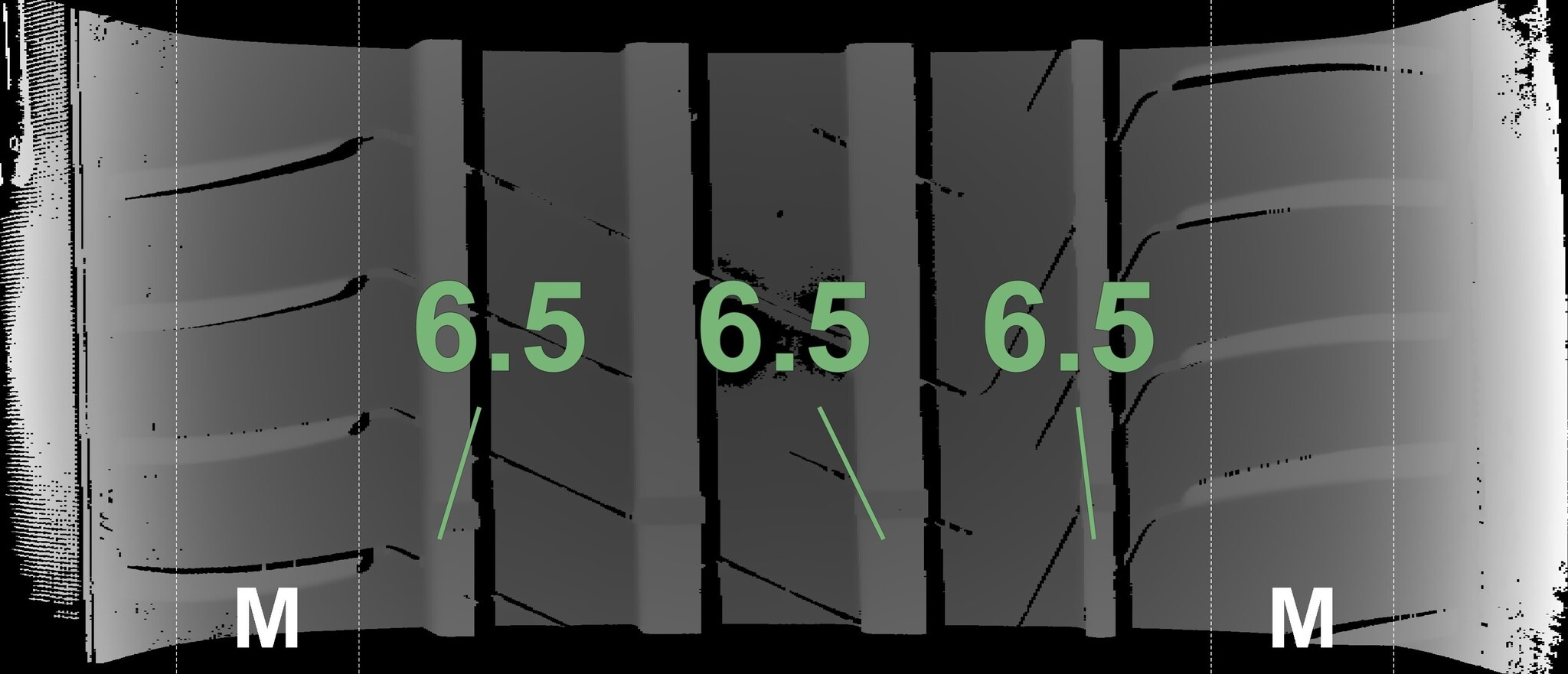 Zustand | Profiltiefe | DOT | Vorderachse Rechts | Demo-Noppen noch sichtbar | 6,5 mm | 4619 |