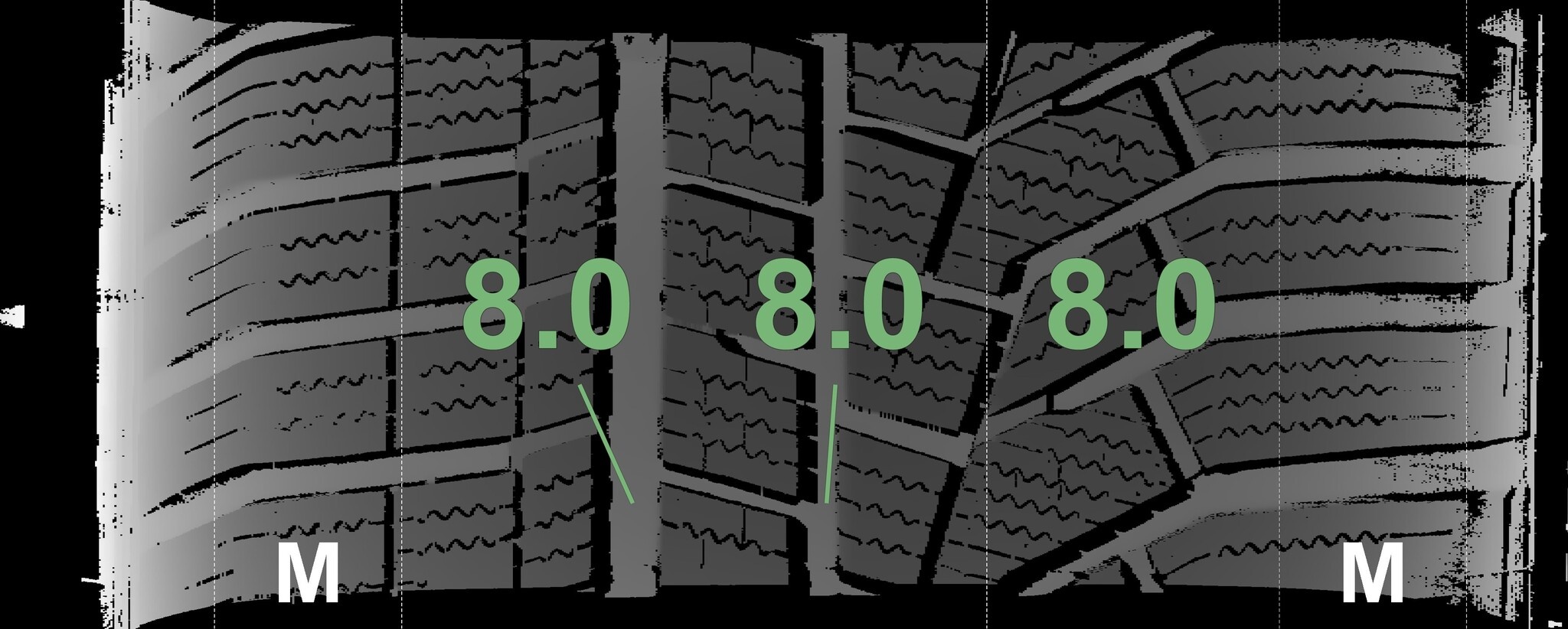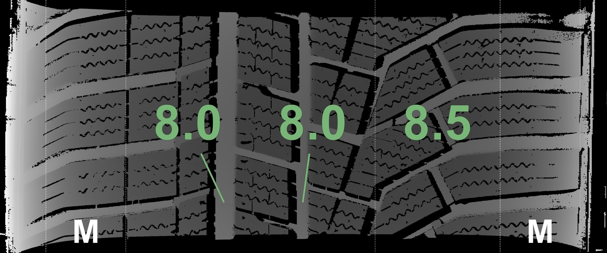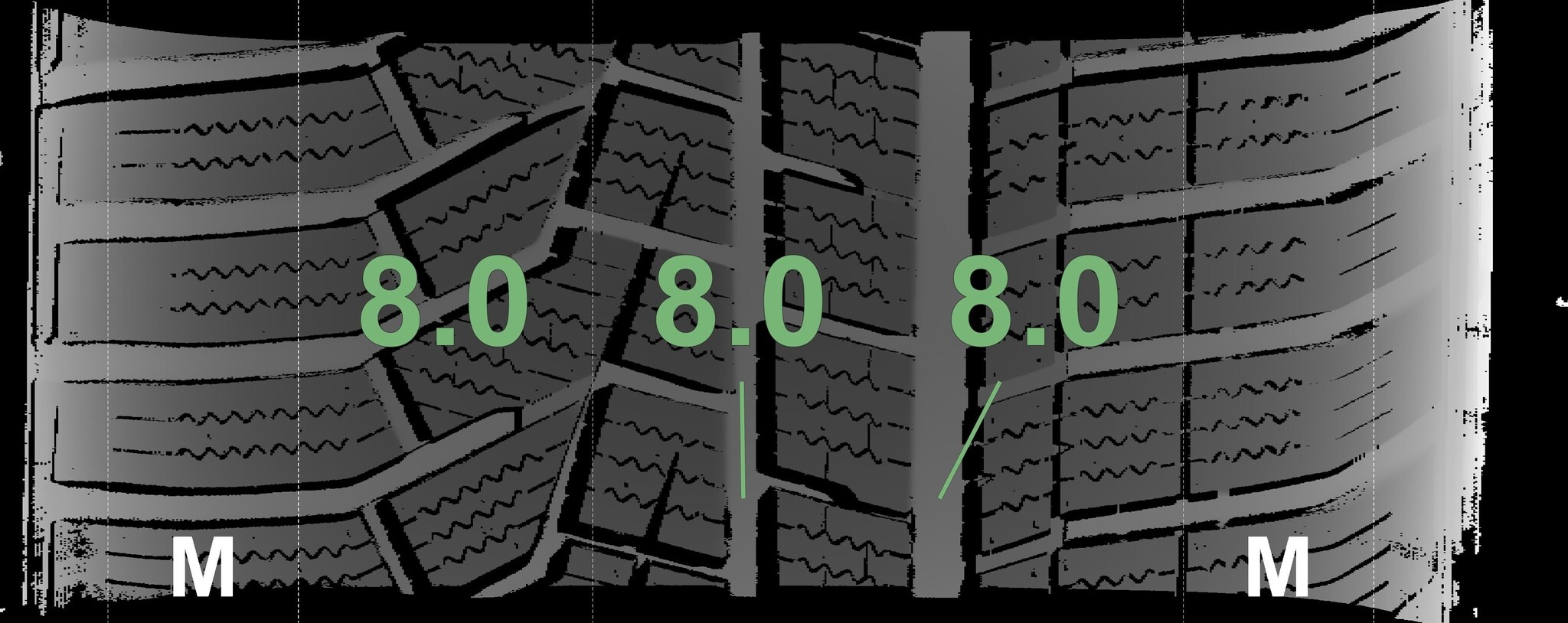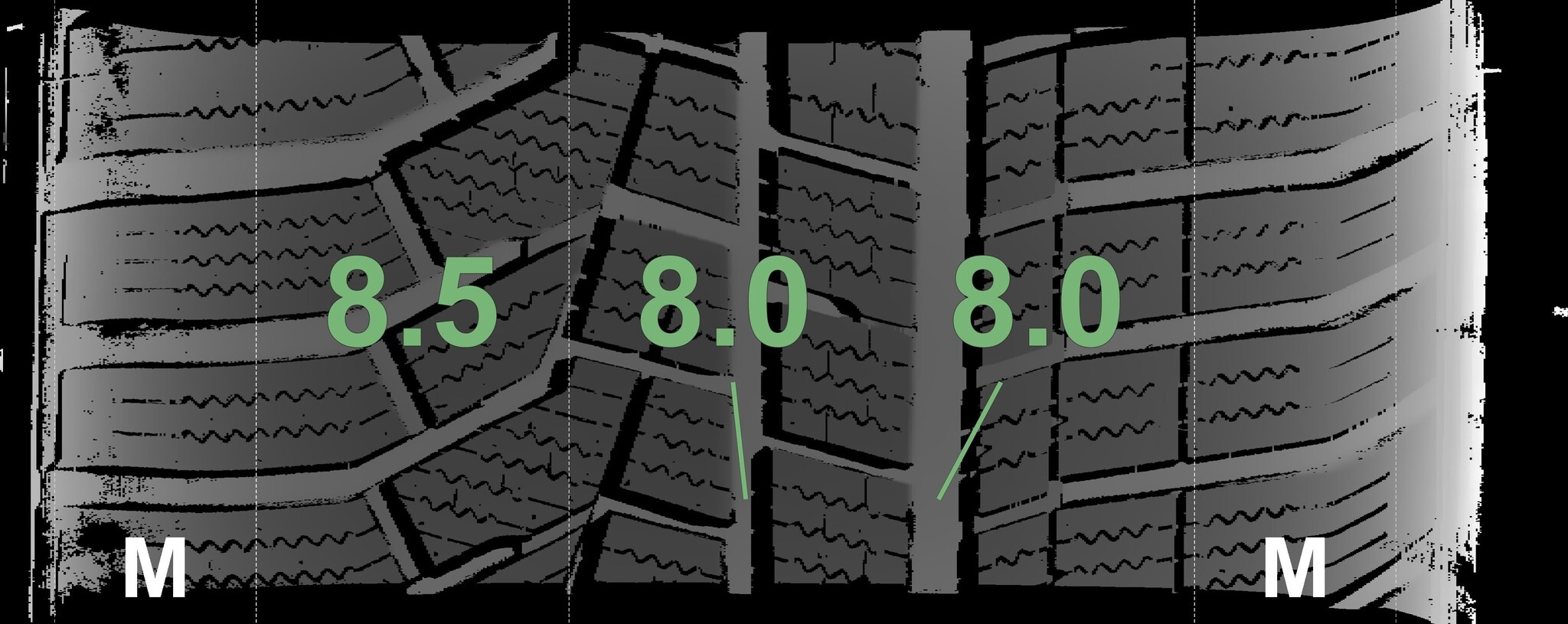| Zustand | Profiltiefe | DOT | Vorderachse Links | Neu | 8,0 mm | 3925 |